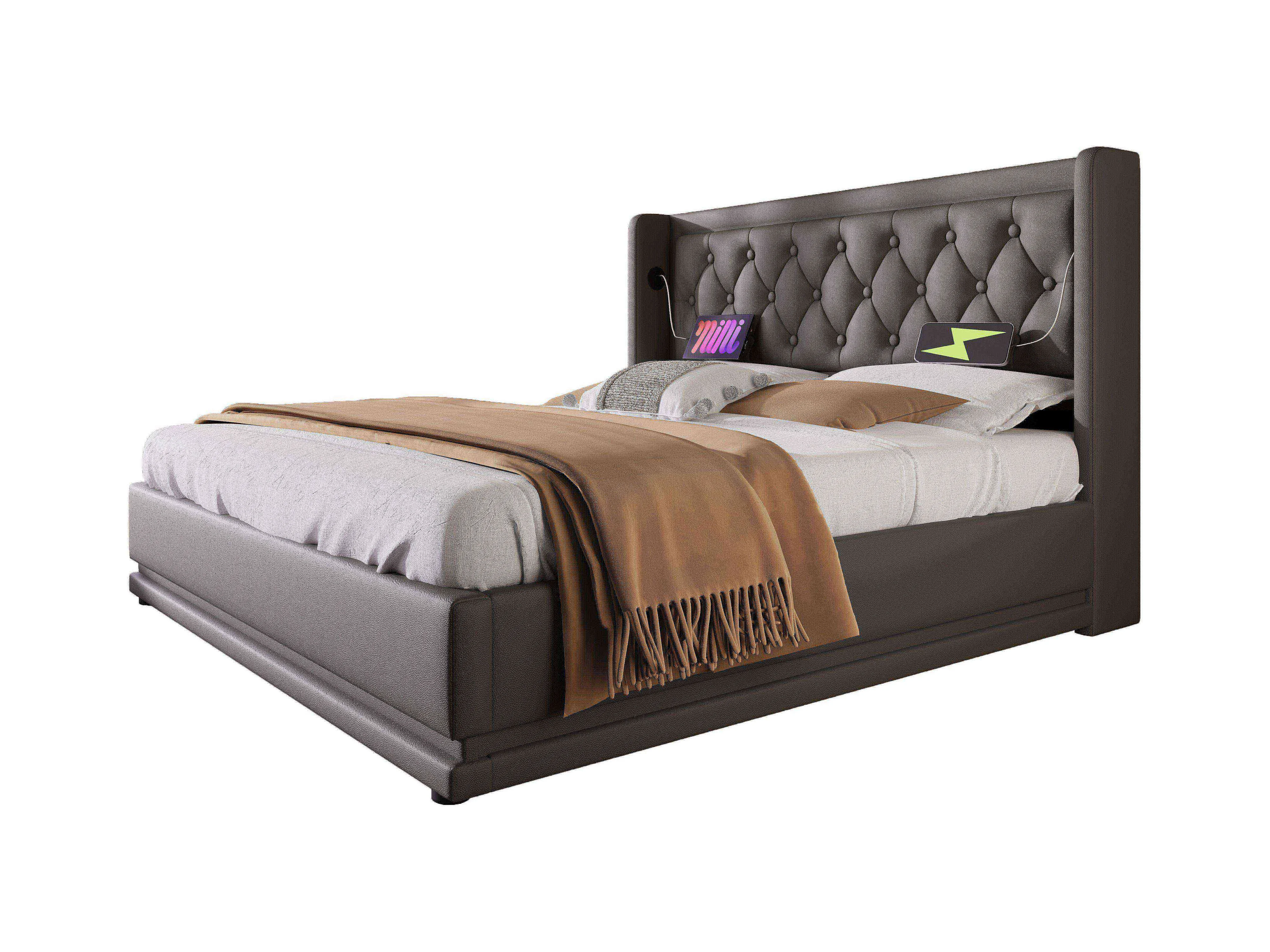 Lit double rembourré 140x200cm - avec USB et lumière LED - Cadre de lit avec tête de lit rangement et coffre de rangement pour lit, en PU- Gris