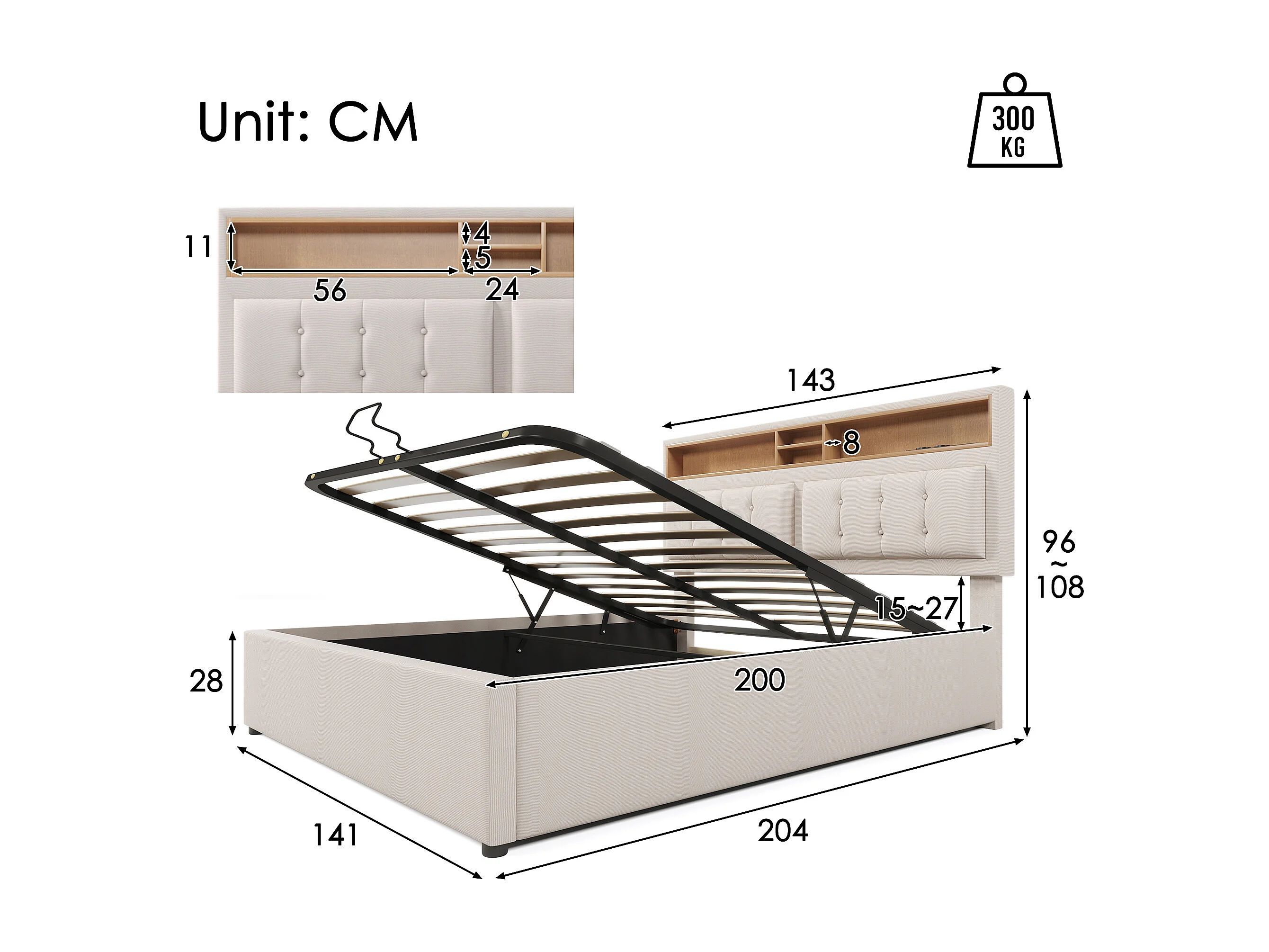 Lit coffre adulte 140x200 cm avec Lit avec tête de lit et prise USB-C en lin beige,sans matelas