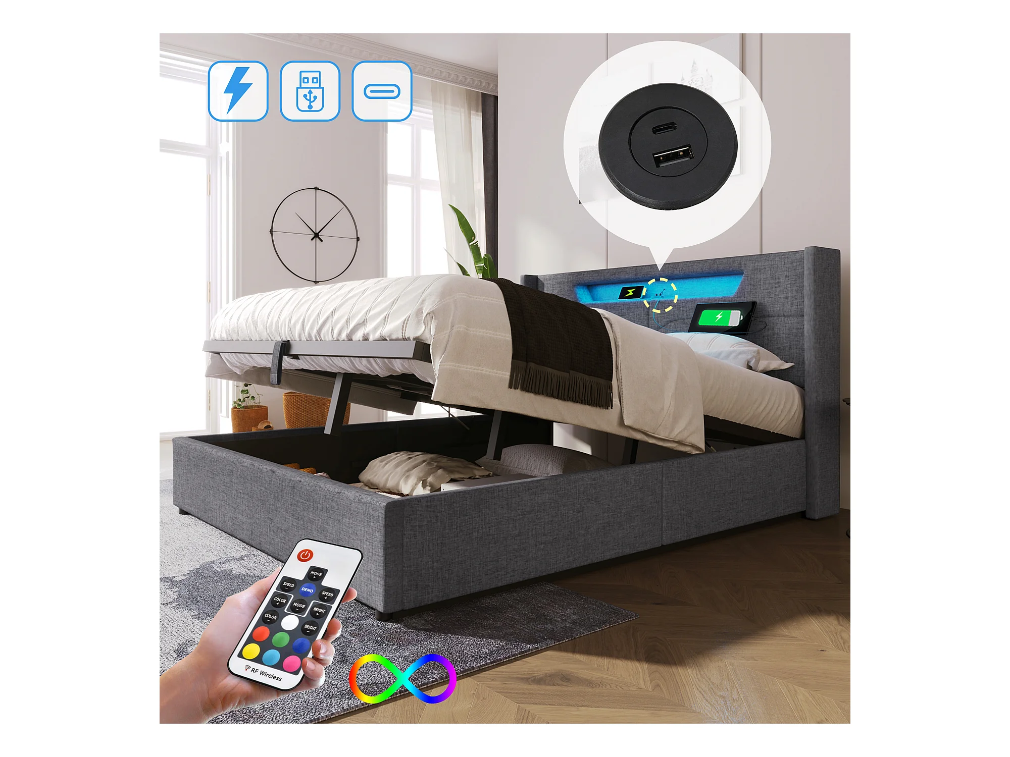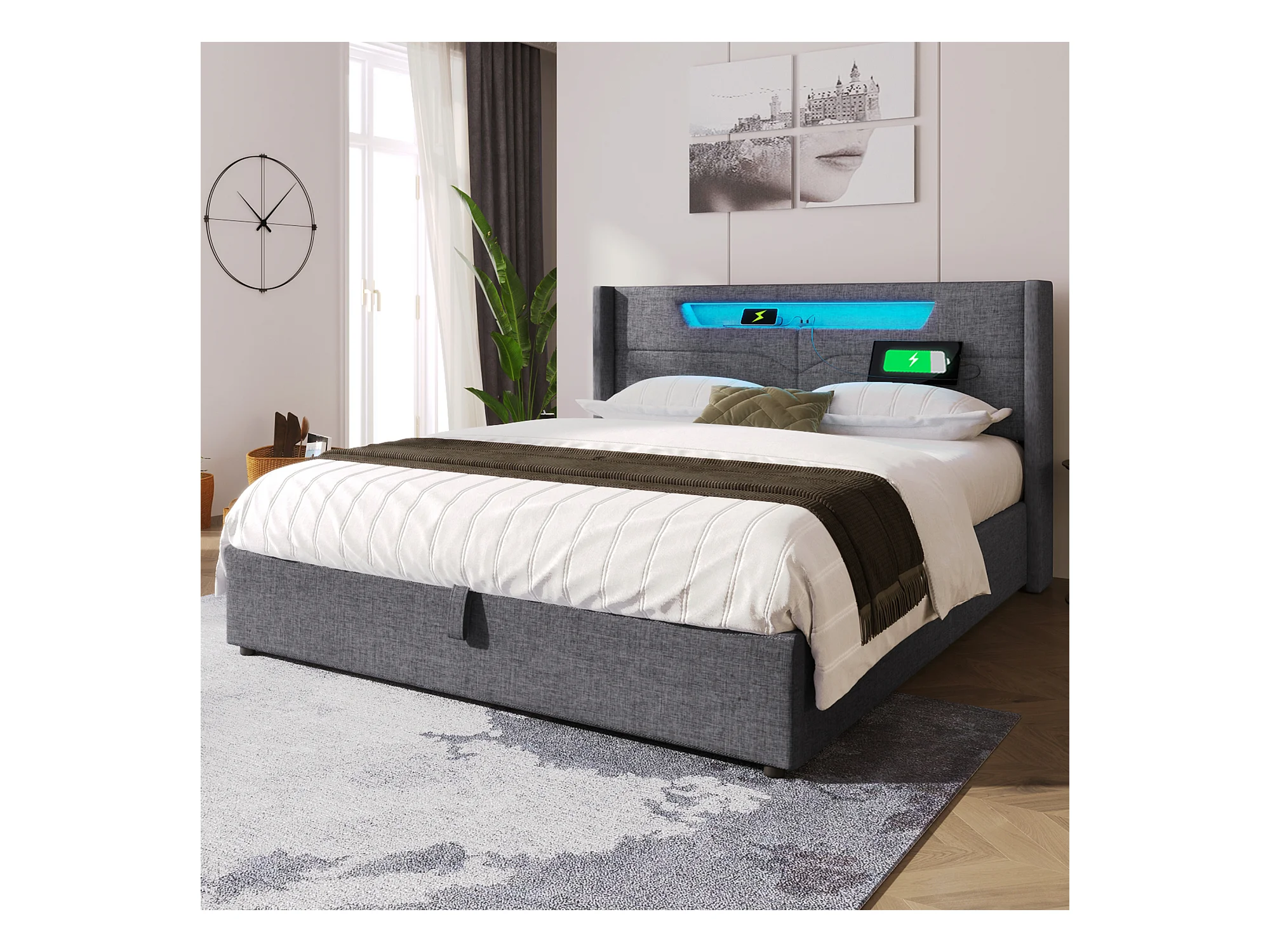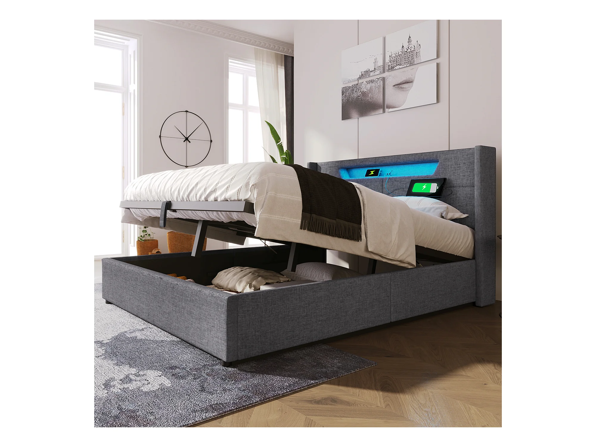 Lit coffre double 160x200 cm en lin gris - avec USB, LED et tête de lit réversible(sans matelas)