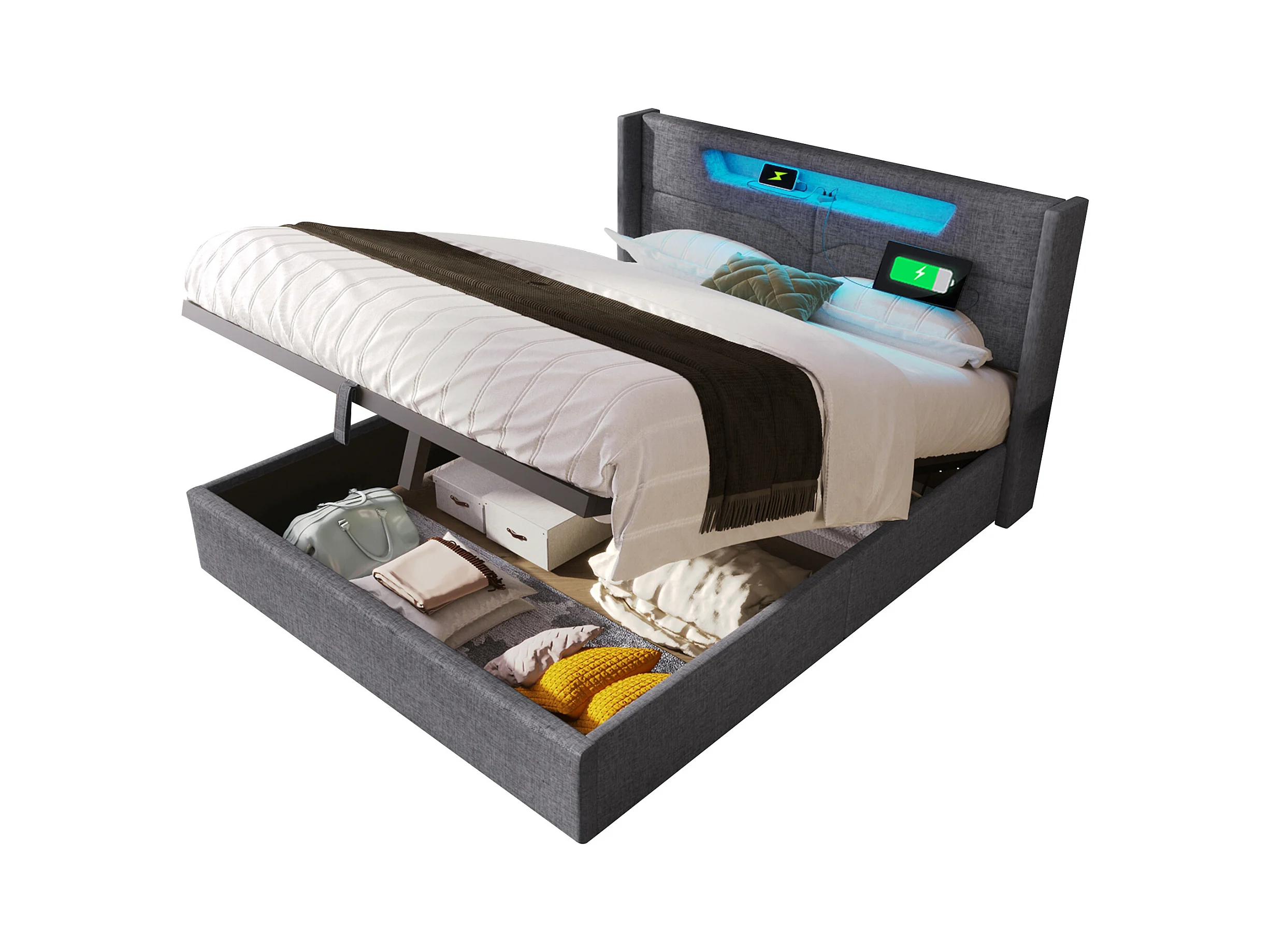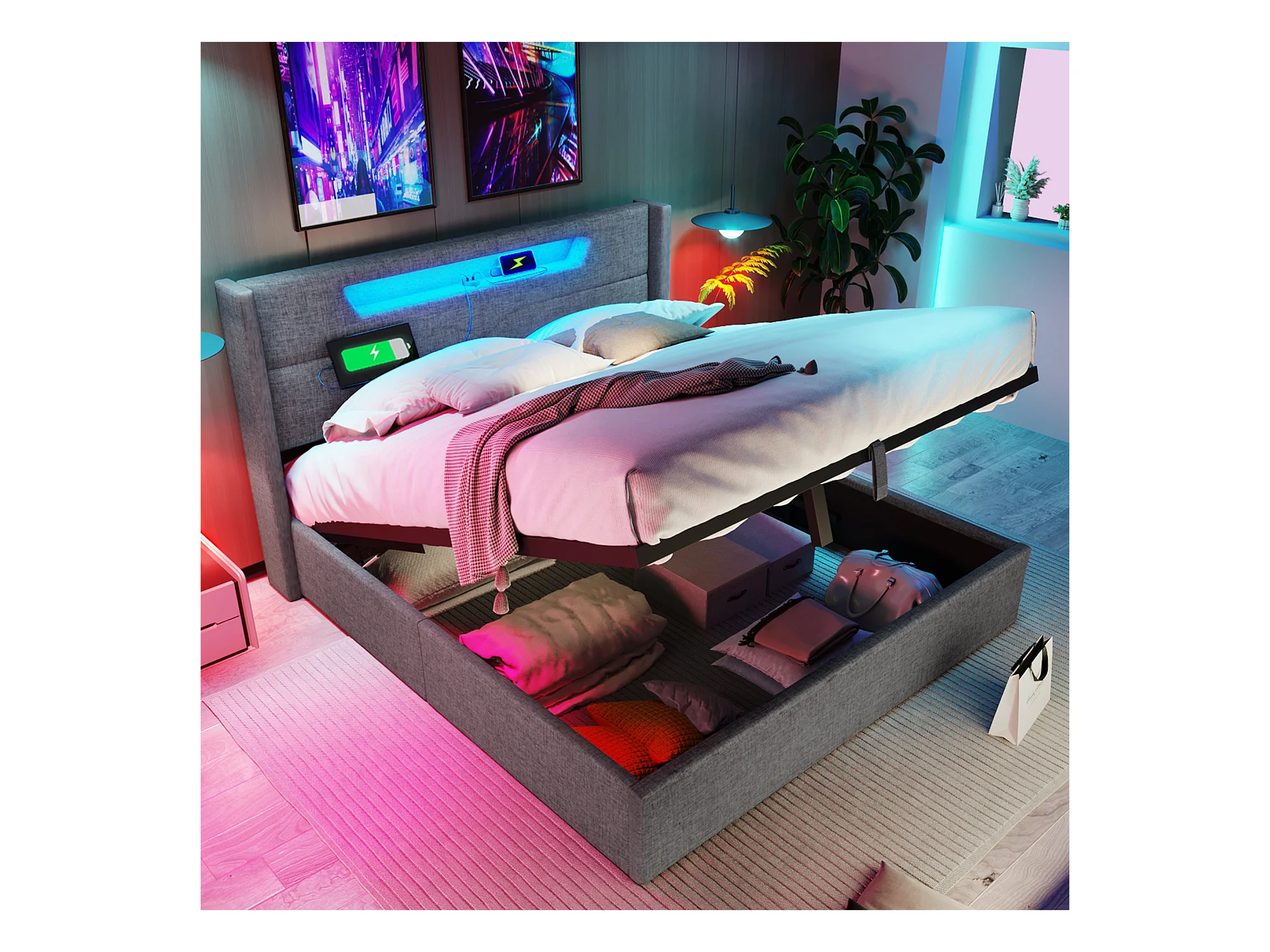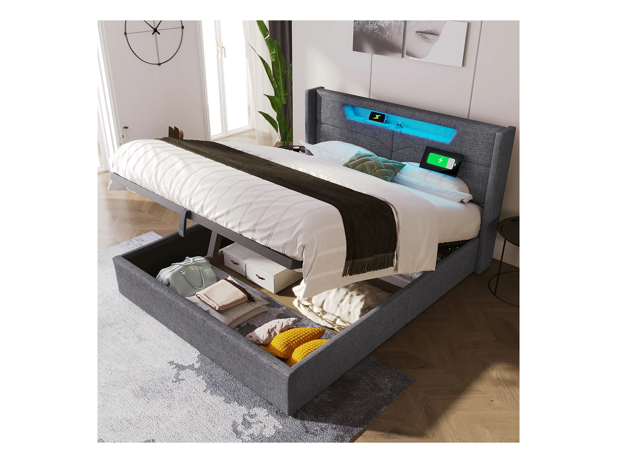 Lit coffre double 160x200 cm en lin gris - avec USB, LED et tête de lit réversible(sans matelas)