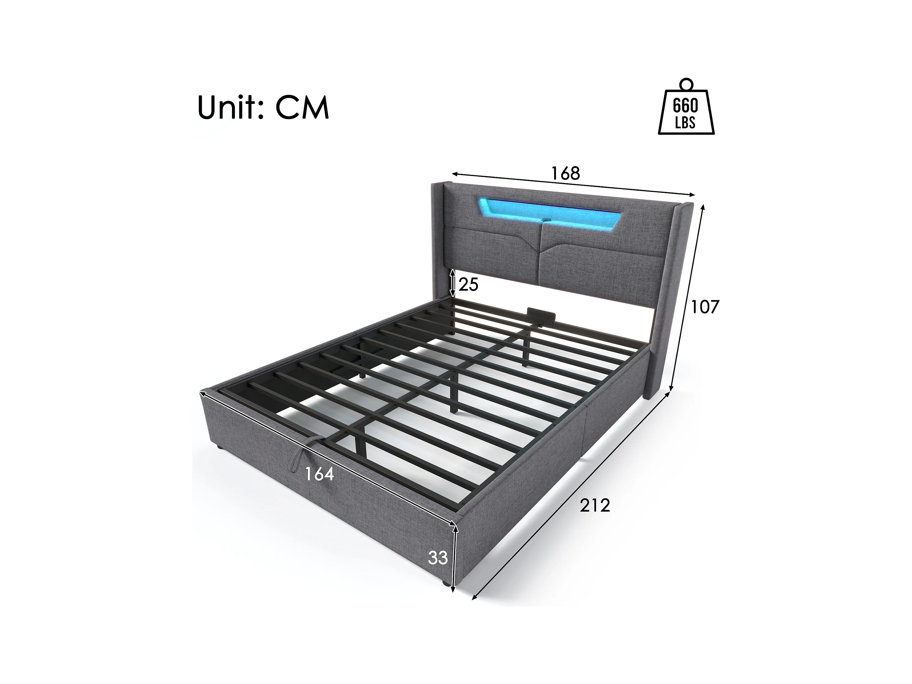 Lit coffre160x200 cm - Lit adulte avec éclairage LED et tiroirs - gris lin - matelas non inclus