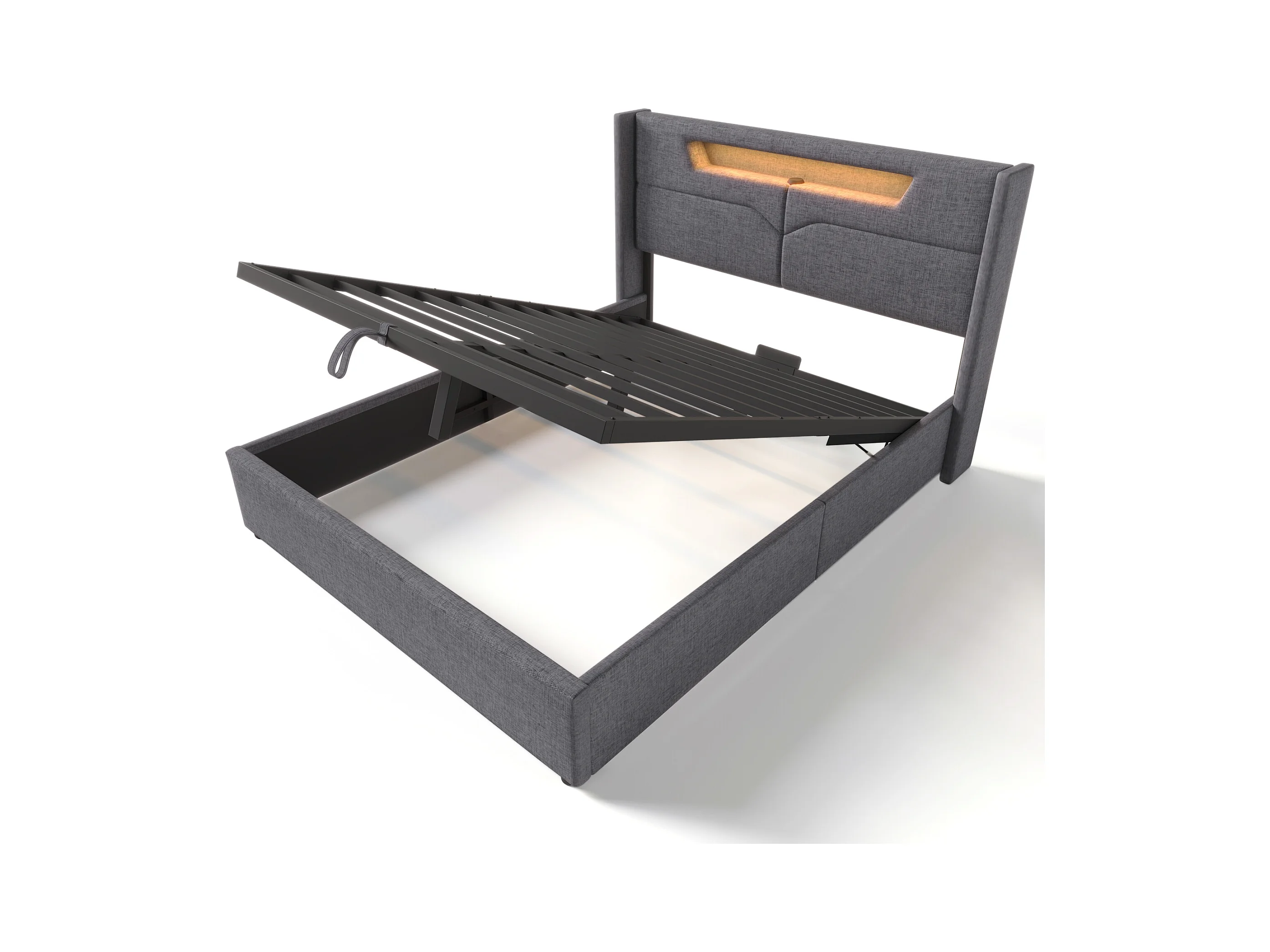 Lit coffre adulte 160x200 cm avec LED + charge USB Type-C - Sommier inclus - En lin gris, sans matelas