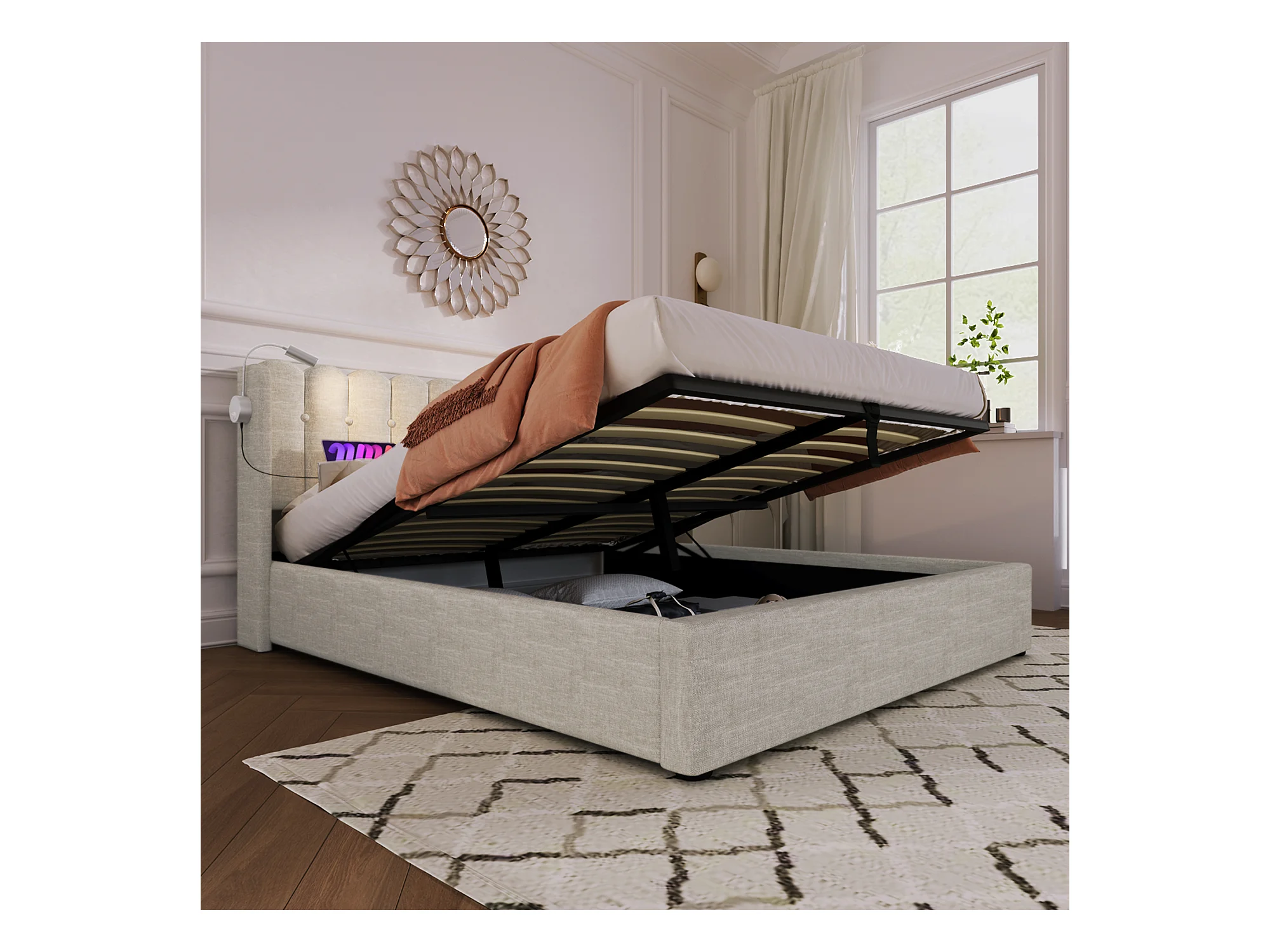 Lit coffre adulte 160x200 cm en lin naturel - Tête de lit avec lampe de lecture et charge USB (sans matelas)