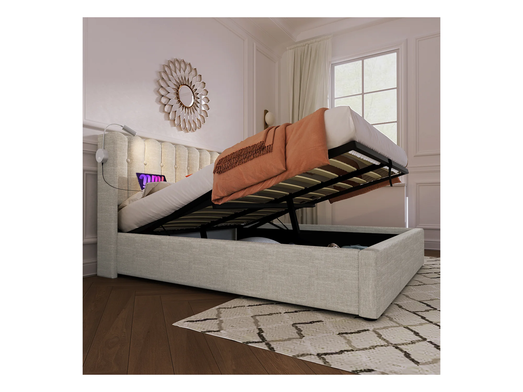 Lit coffre 160x200 cm - Lit adulte avec chargement USB et lumière LED - lin beige - sans matelas
