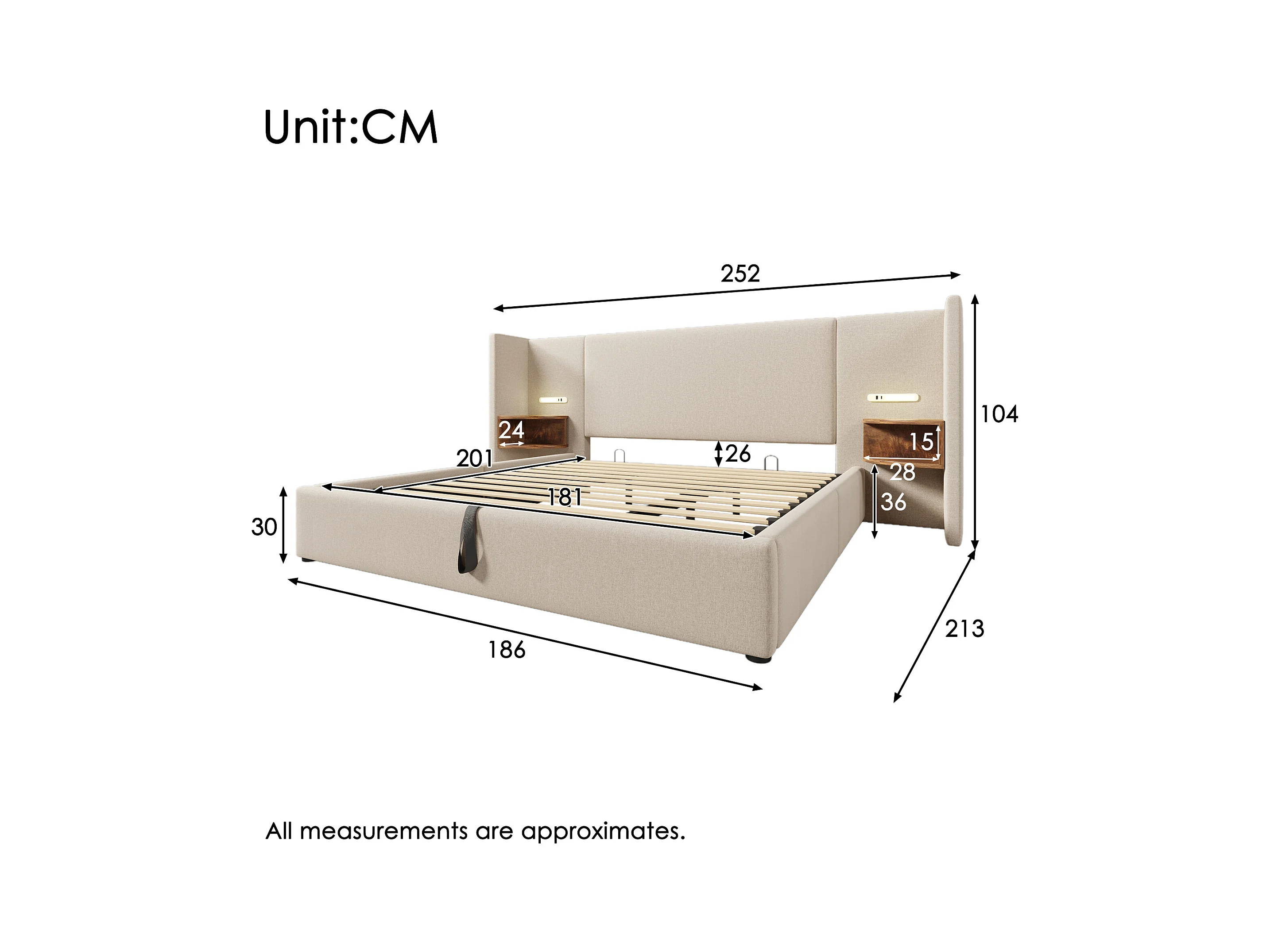 Lit coffre adulte 180x200cm avec LED et USB type-C, tissu en lin beige, sommier à lattes, sans matelas