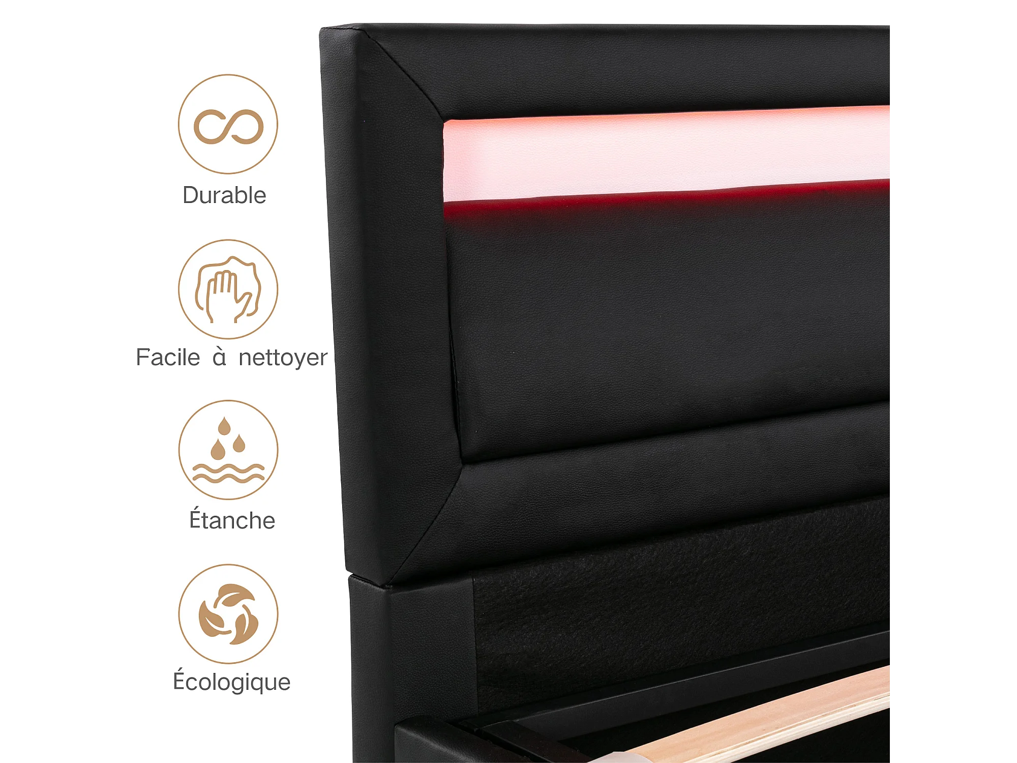 Lit coffre double capitonné - 140 x 190 cm - avec Leds + sommier à lattes + rangement hydraulique - PU - noir
