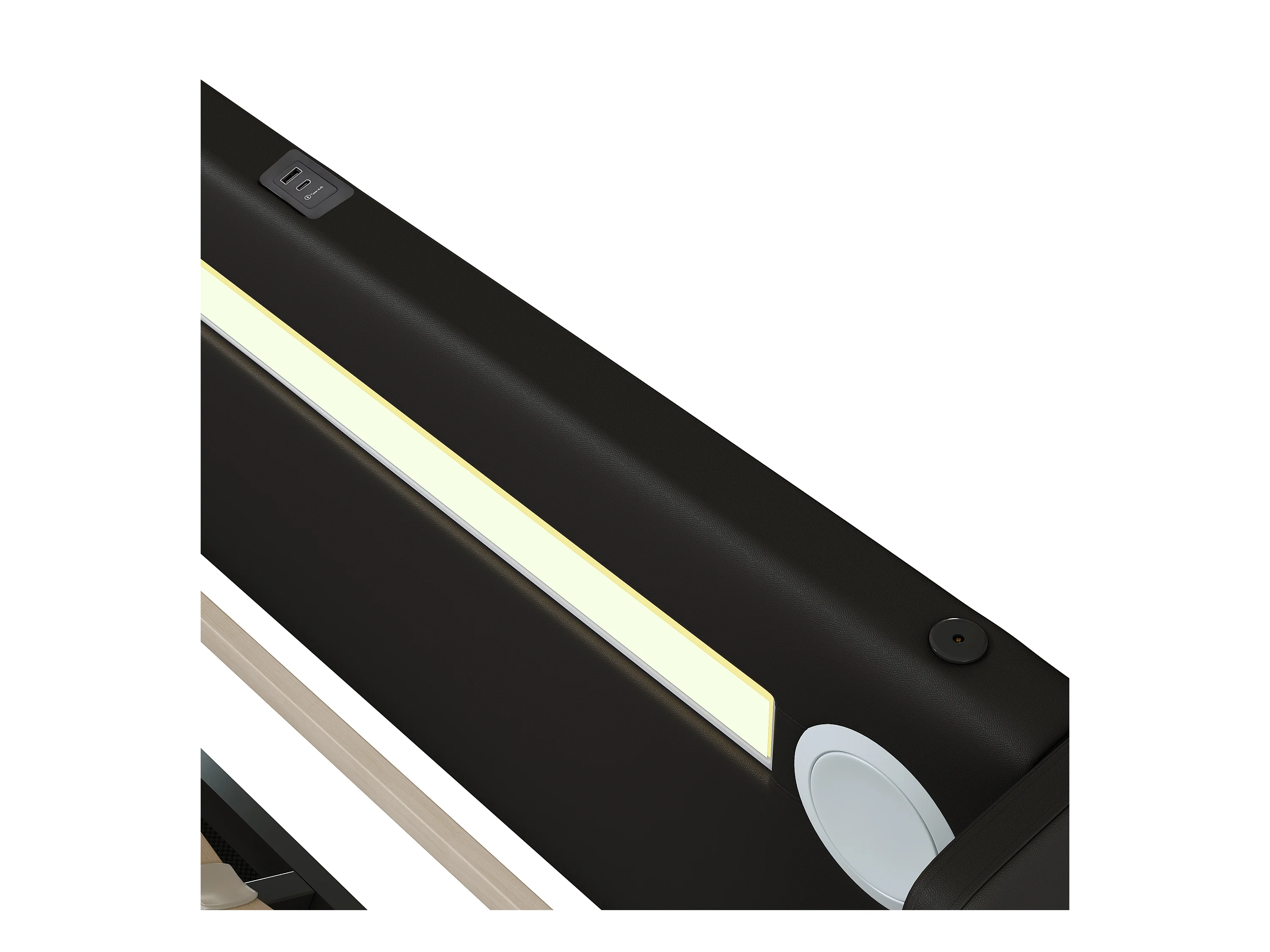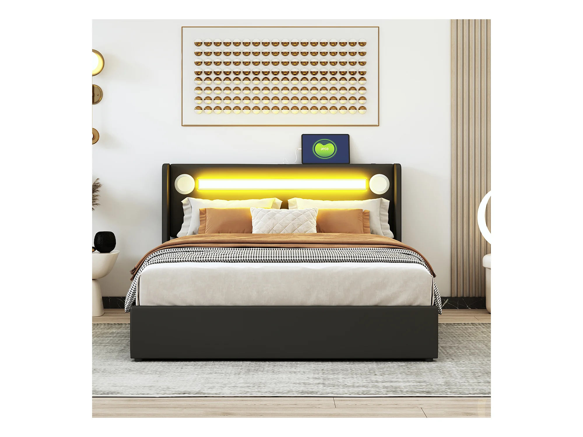 Lit coffre double rembourré - 140 x 200 cm - Leds + Tête avec USB - lecteur BT - Cuir PU - Noir