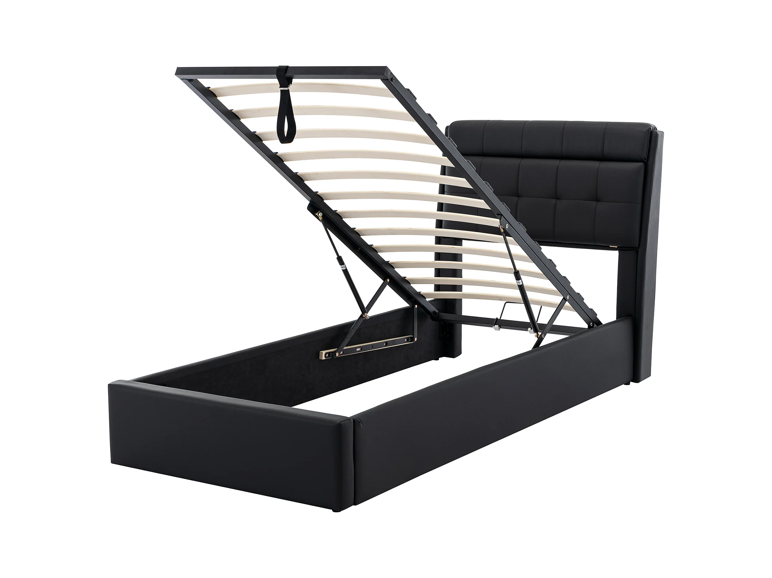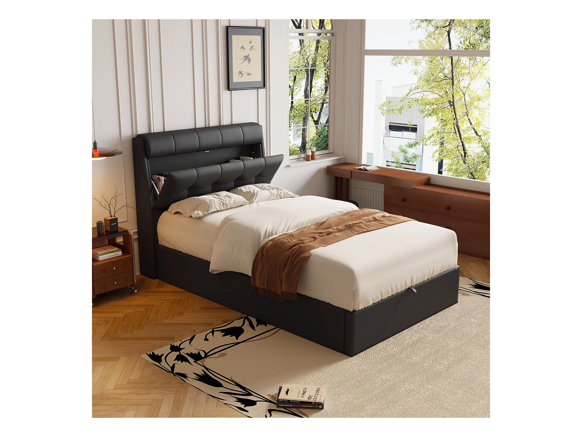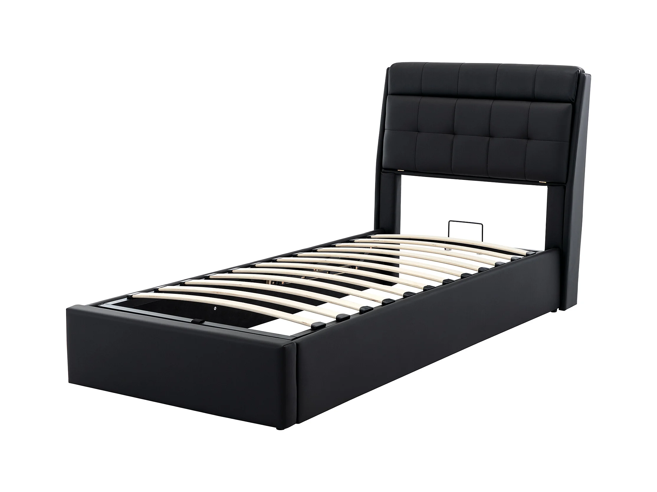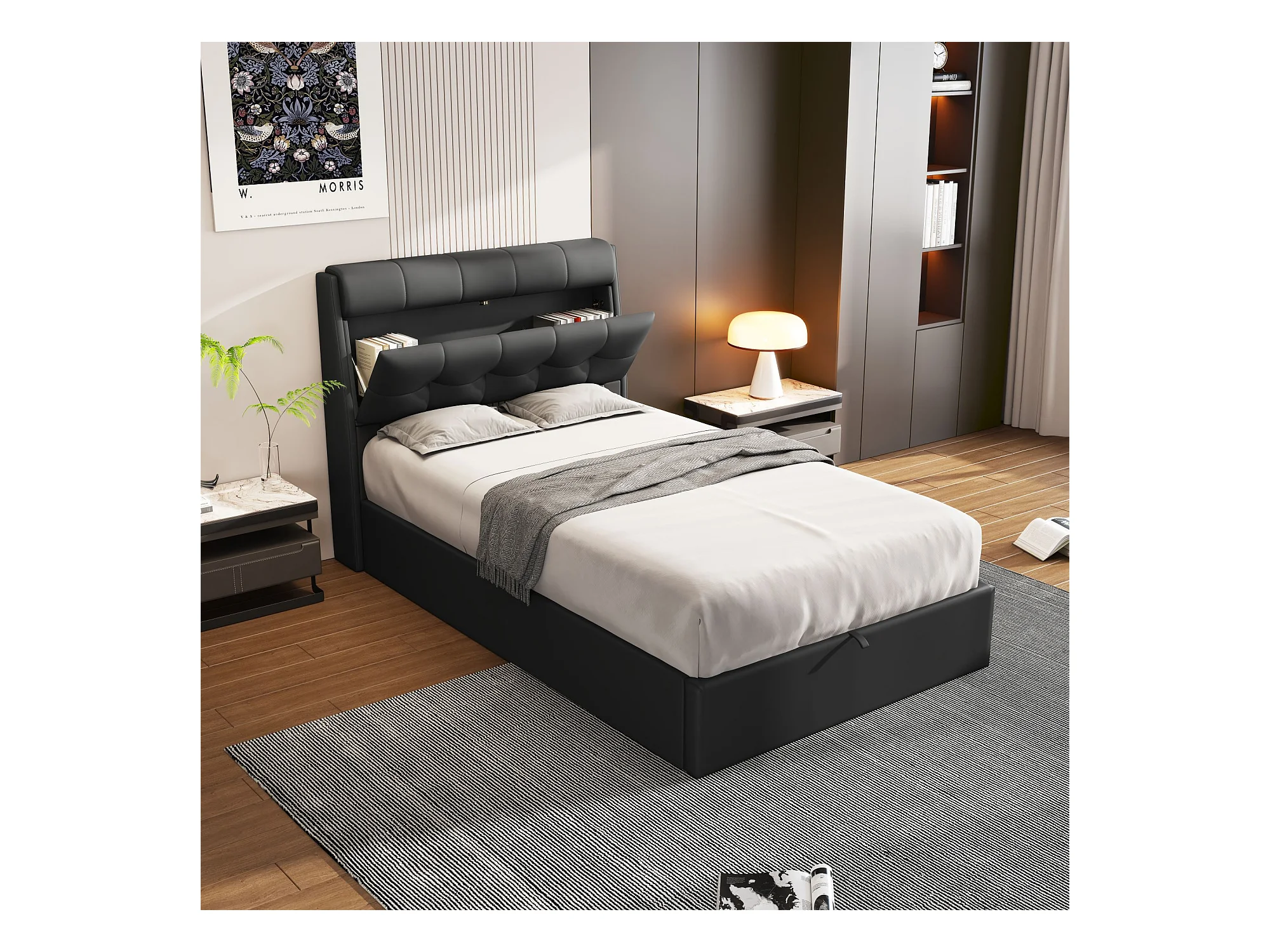 Lit coffre élégant 90 x 200 cm - étagère tête de lit dissimulée - similicuiir - sommier à lattes - noir