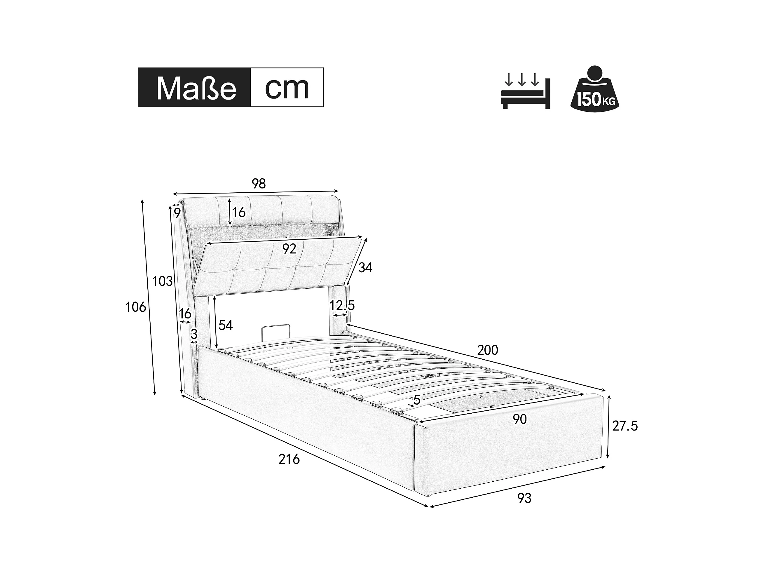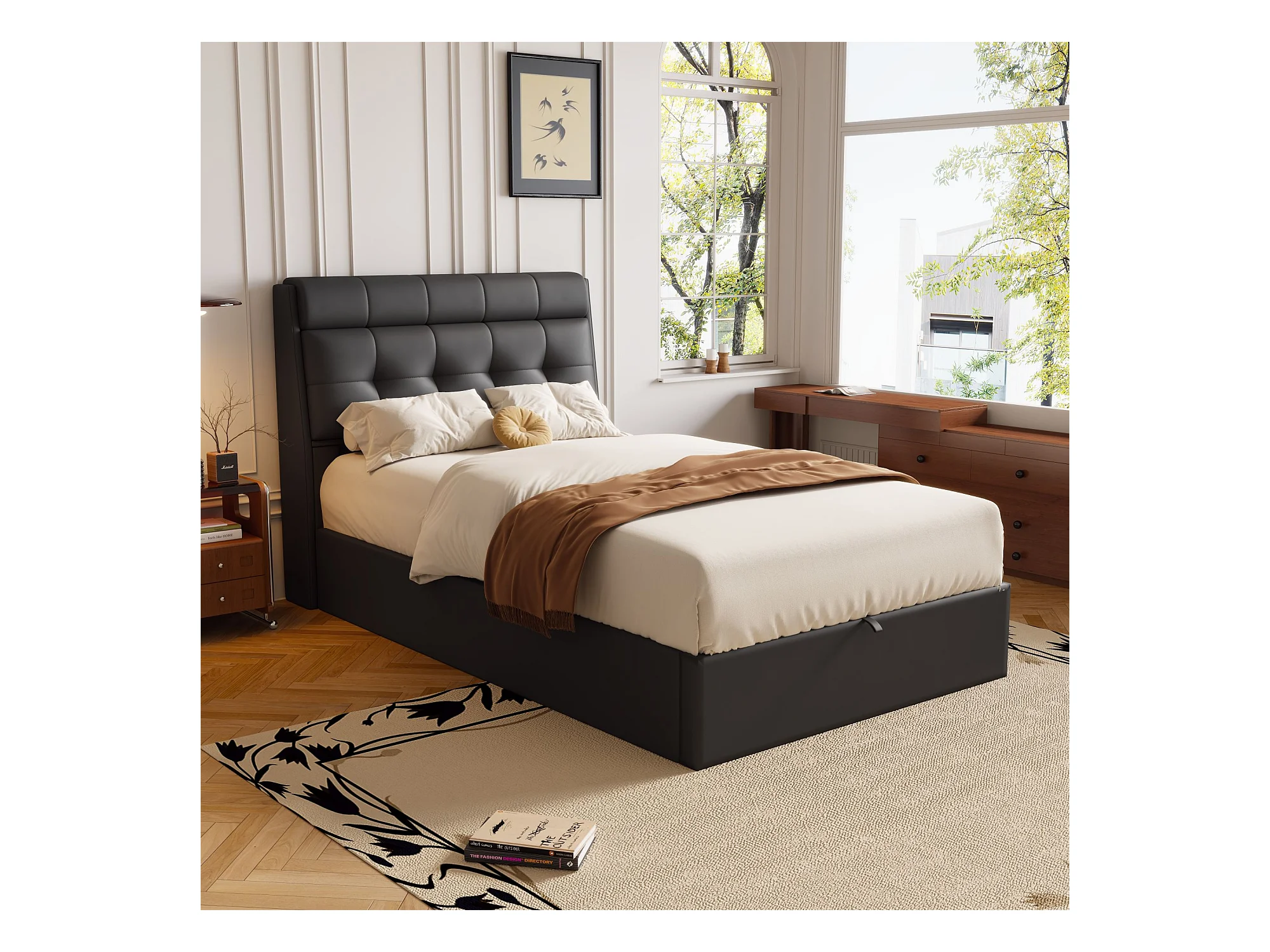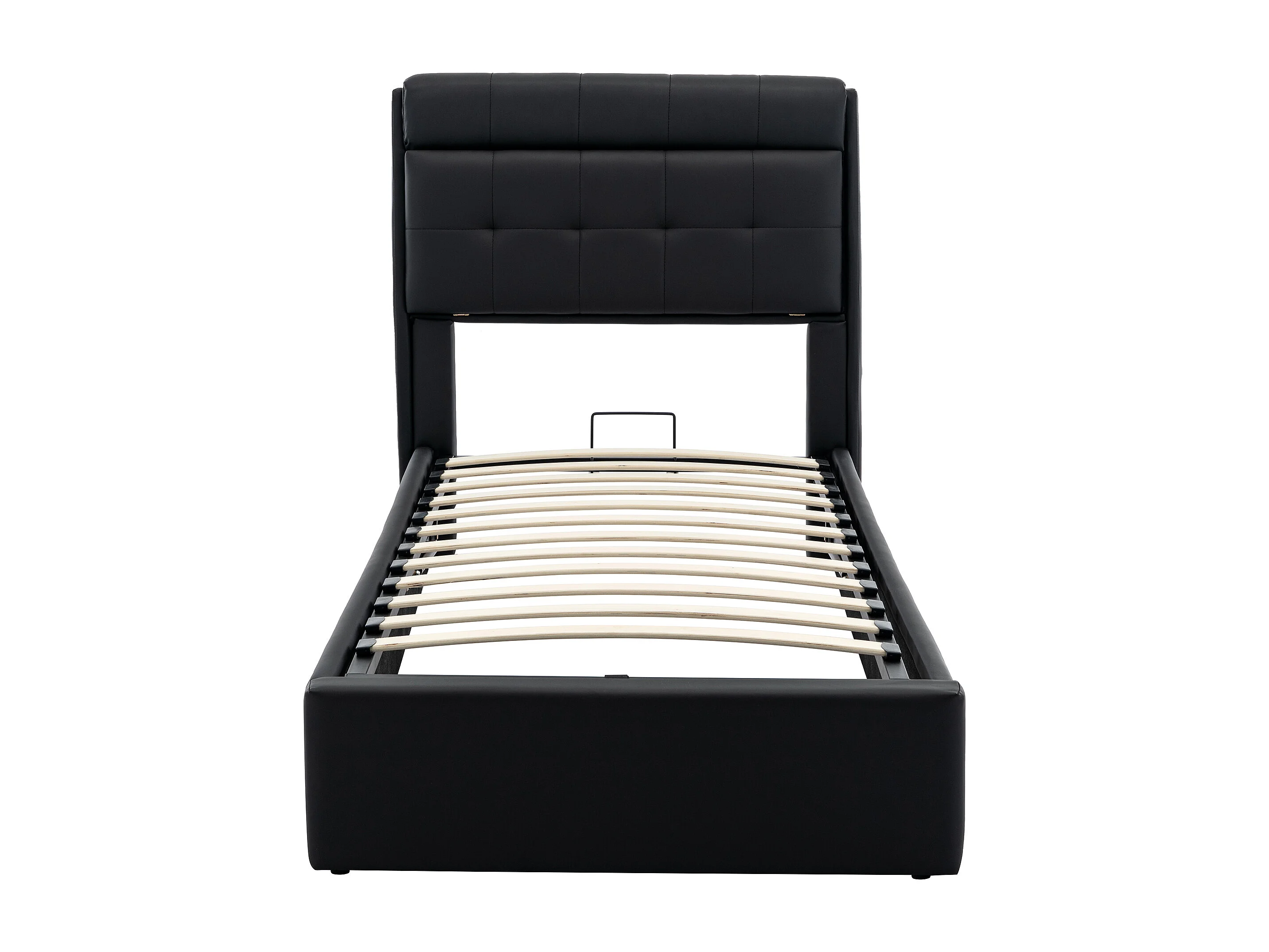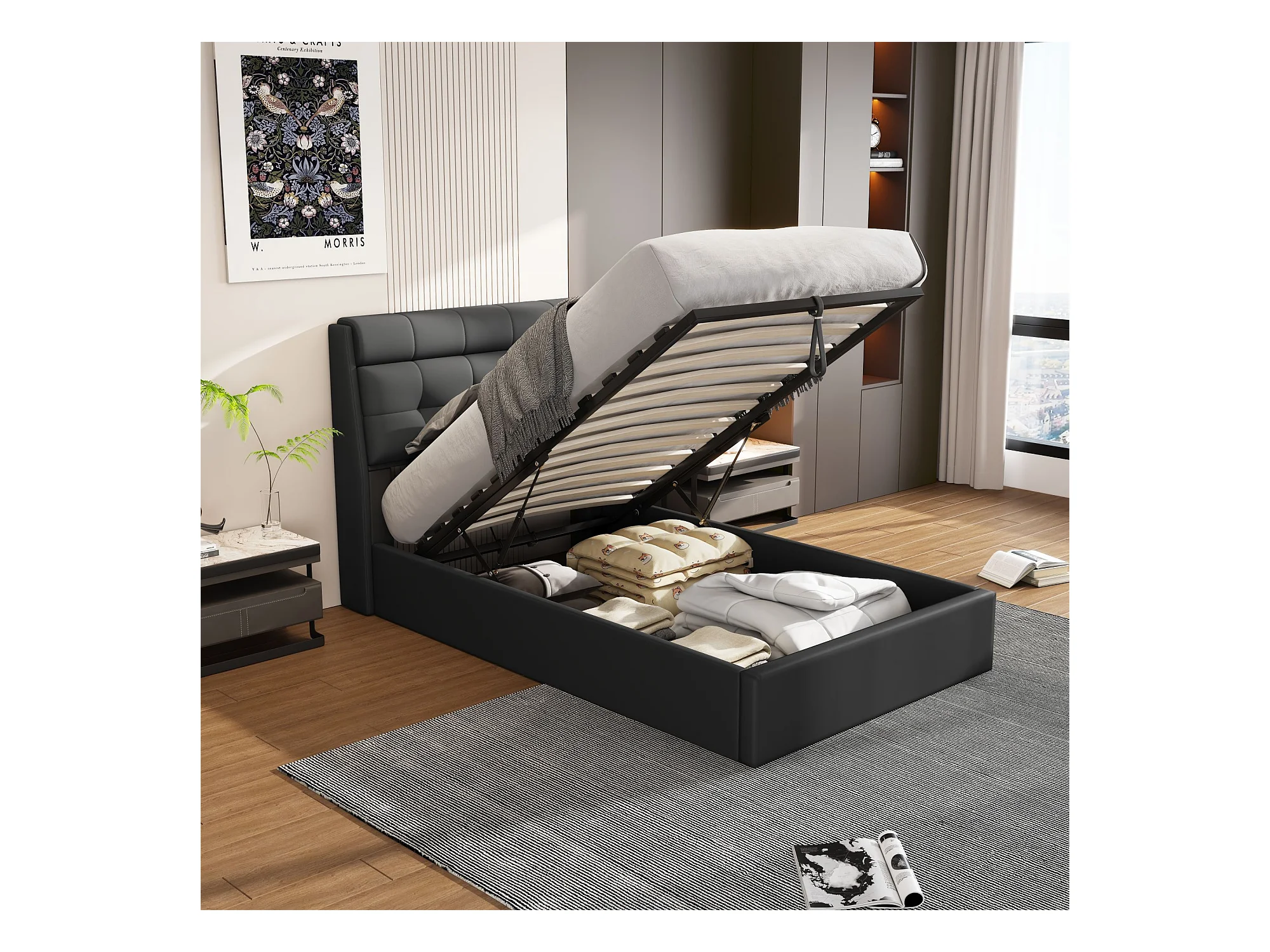 Lit coffre élégant 90 x 200 cm - étagère tête de lit dissimulée - similicuiir - sommier à lattes - noir
