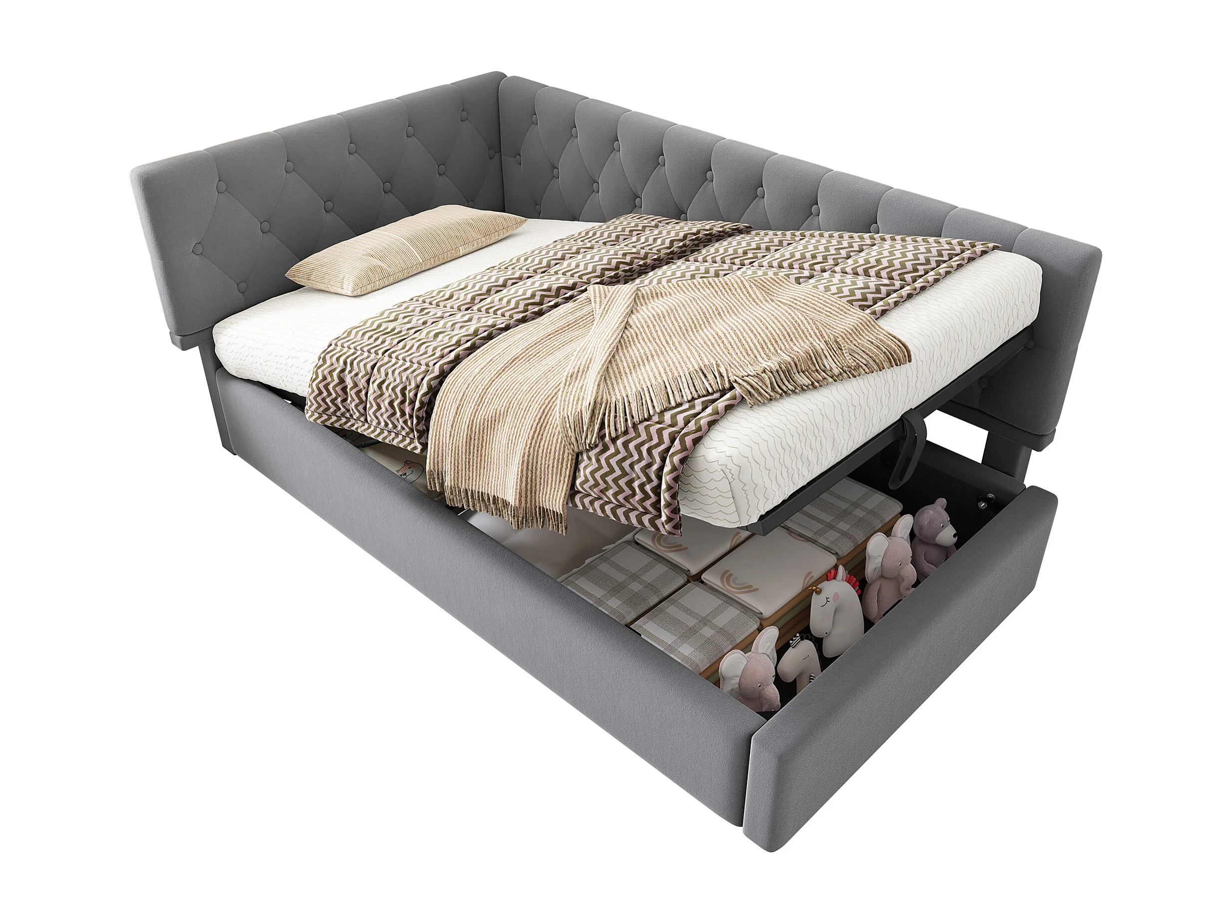 Lit coffre 90x190 cm avec rangement hydraulique, tête de lit réversible, en velours, gris (Sans matelas)