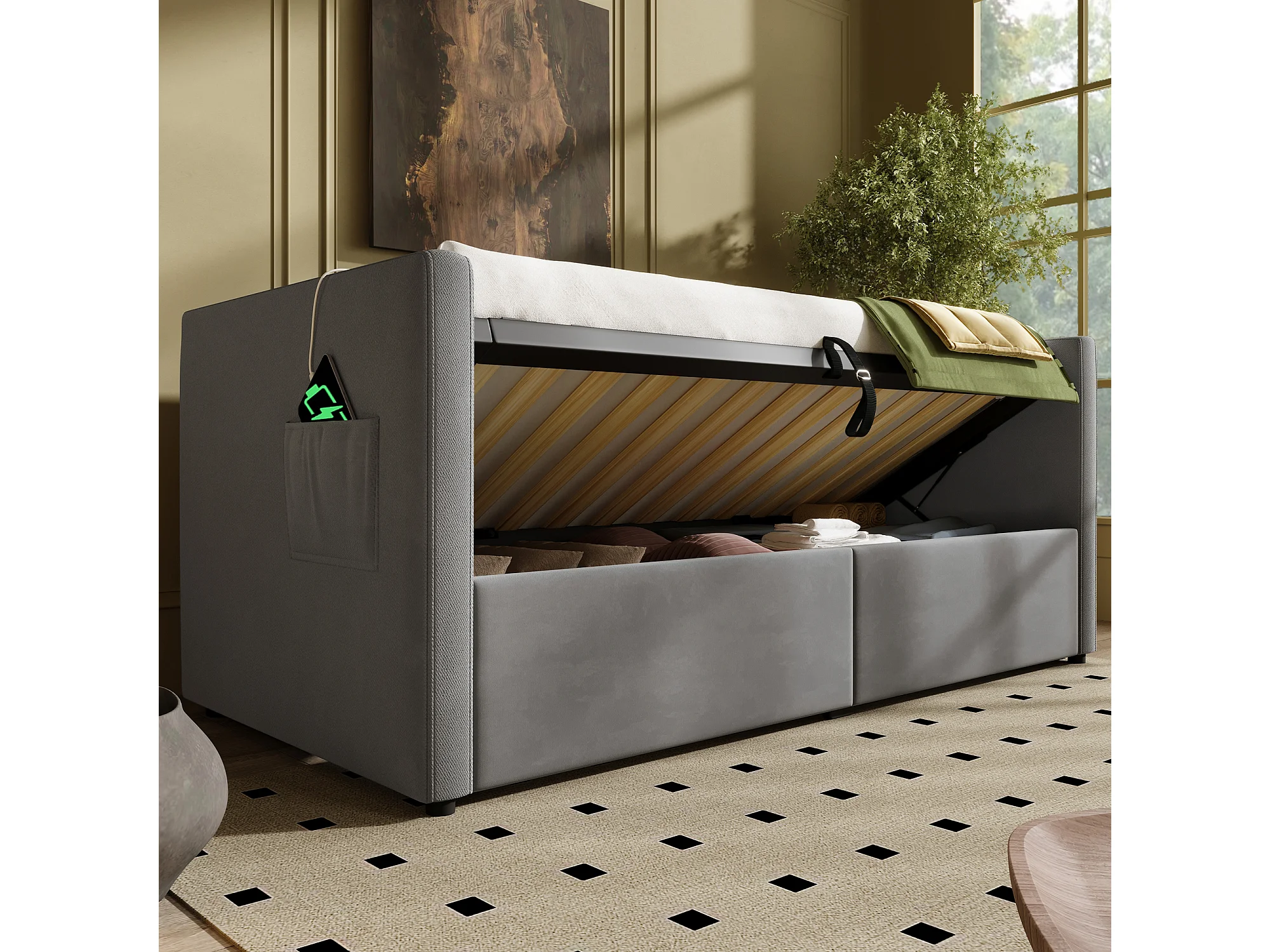 Lit coffre 90x190 cm avec rangement hydraulique et station USB Type C, sommier à lattes en bois, velours, gris (Sans matelas)
