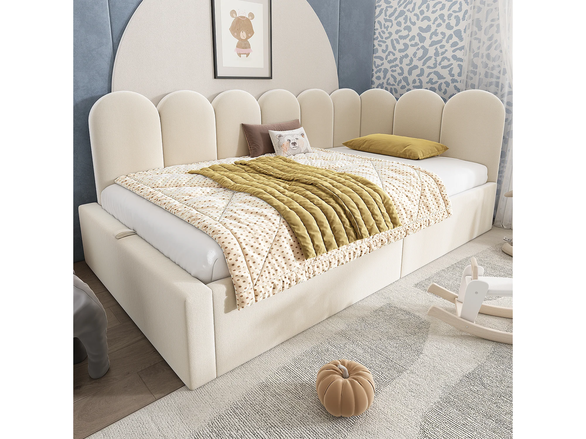 Lit coffre enfant 90x190cm, cadre en Métal, revêtement en velours beige, sans matelas