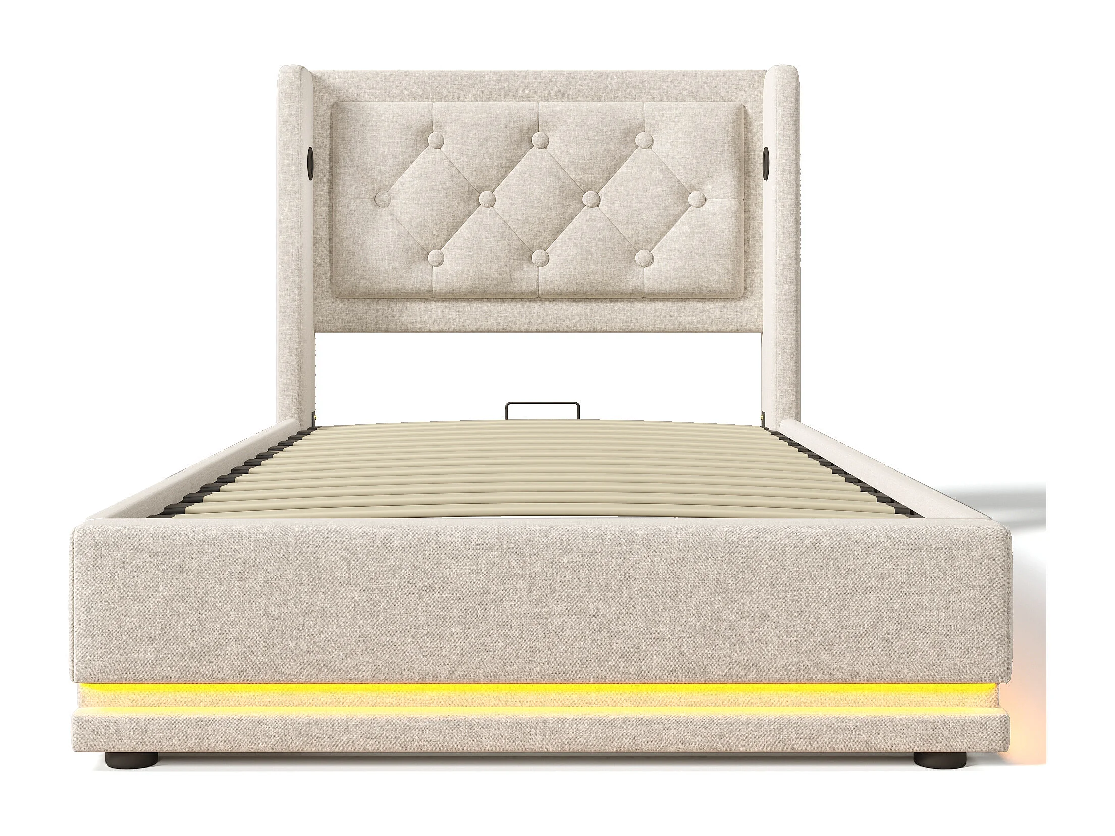 Lit coffre 90x200 cm avec sommier - tête de lit capitonnée avec USB et LED - coton - beige (sans matelas)