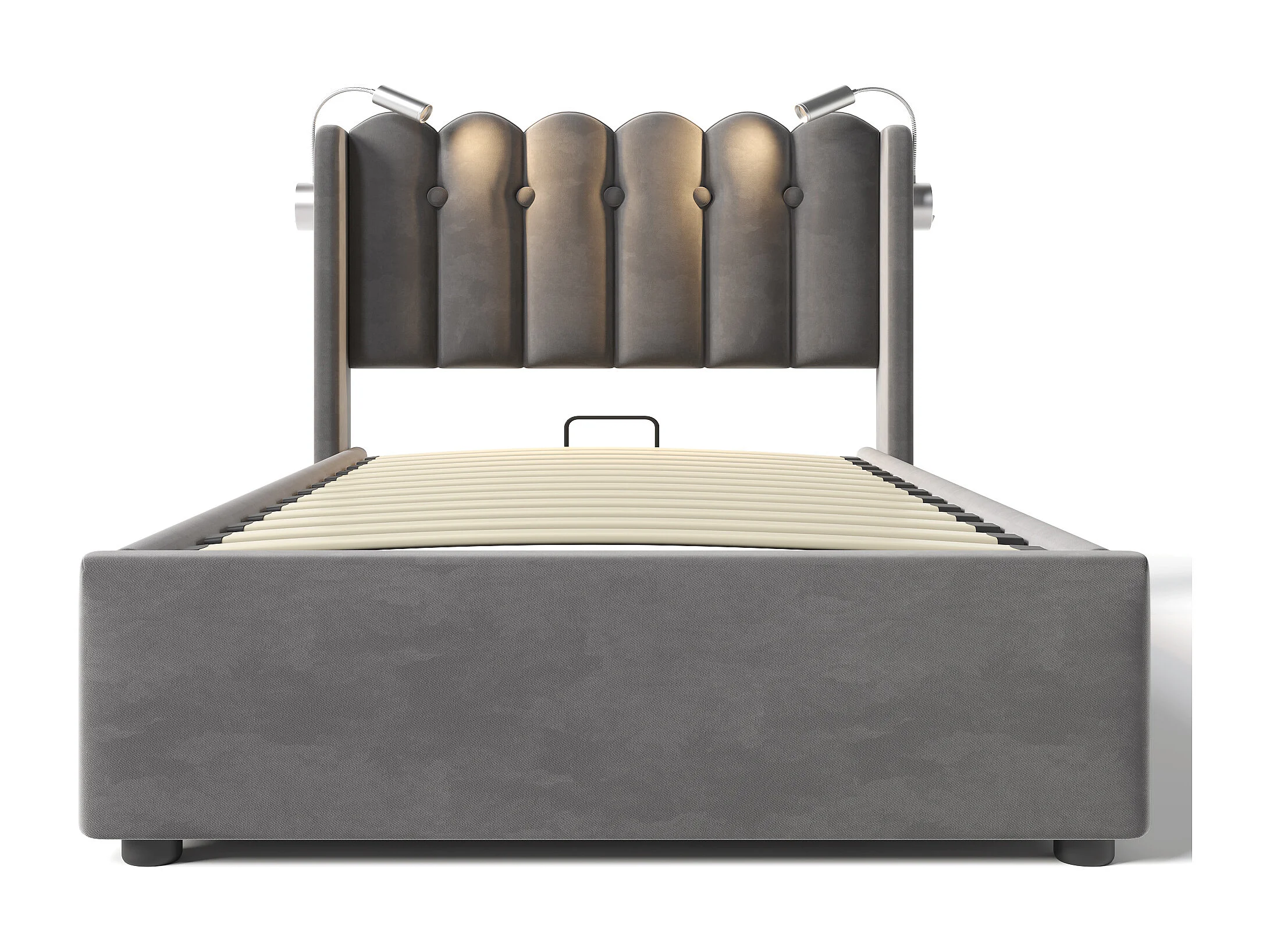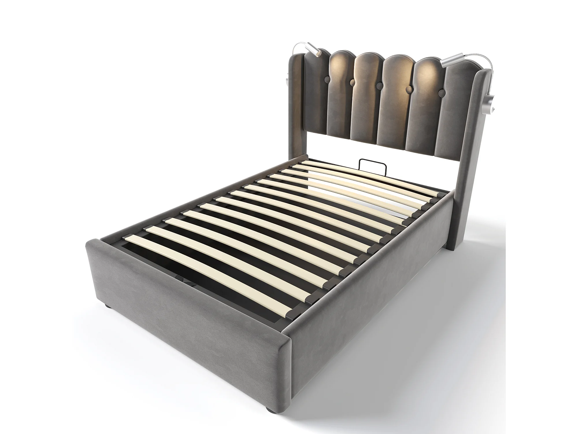 Lit coffre enfant 90x200cm en velours avec liseuse et USB-C, Sommier à lattes en bois, gris, sans matelas