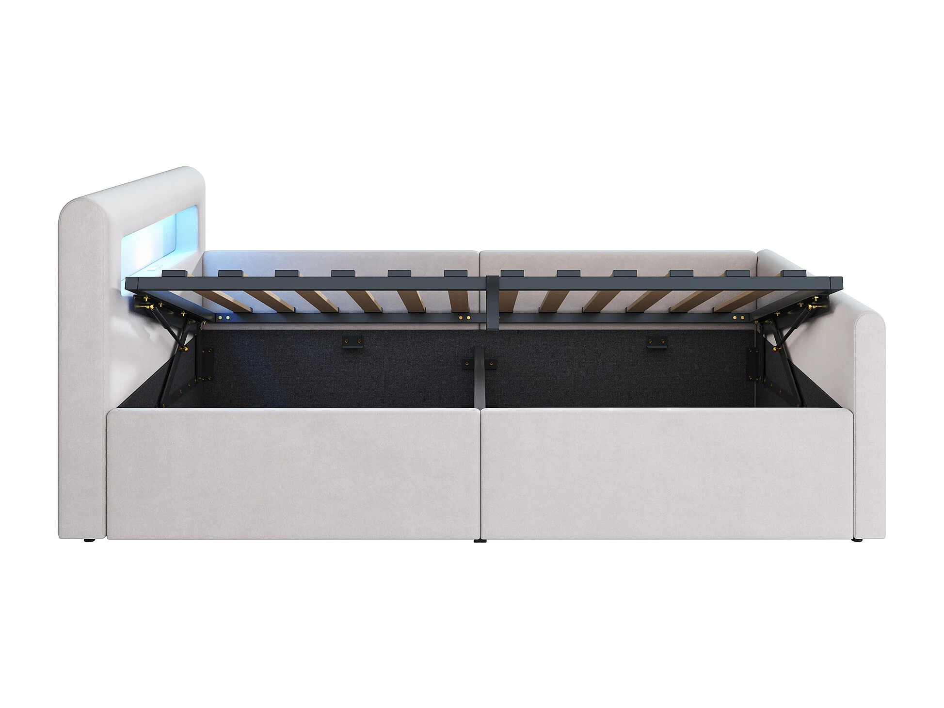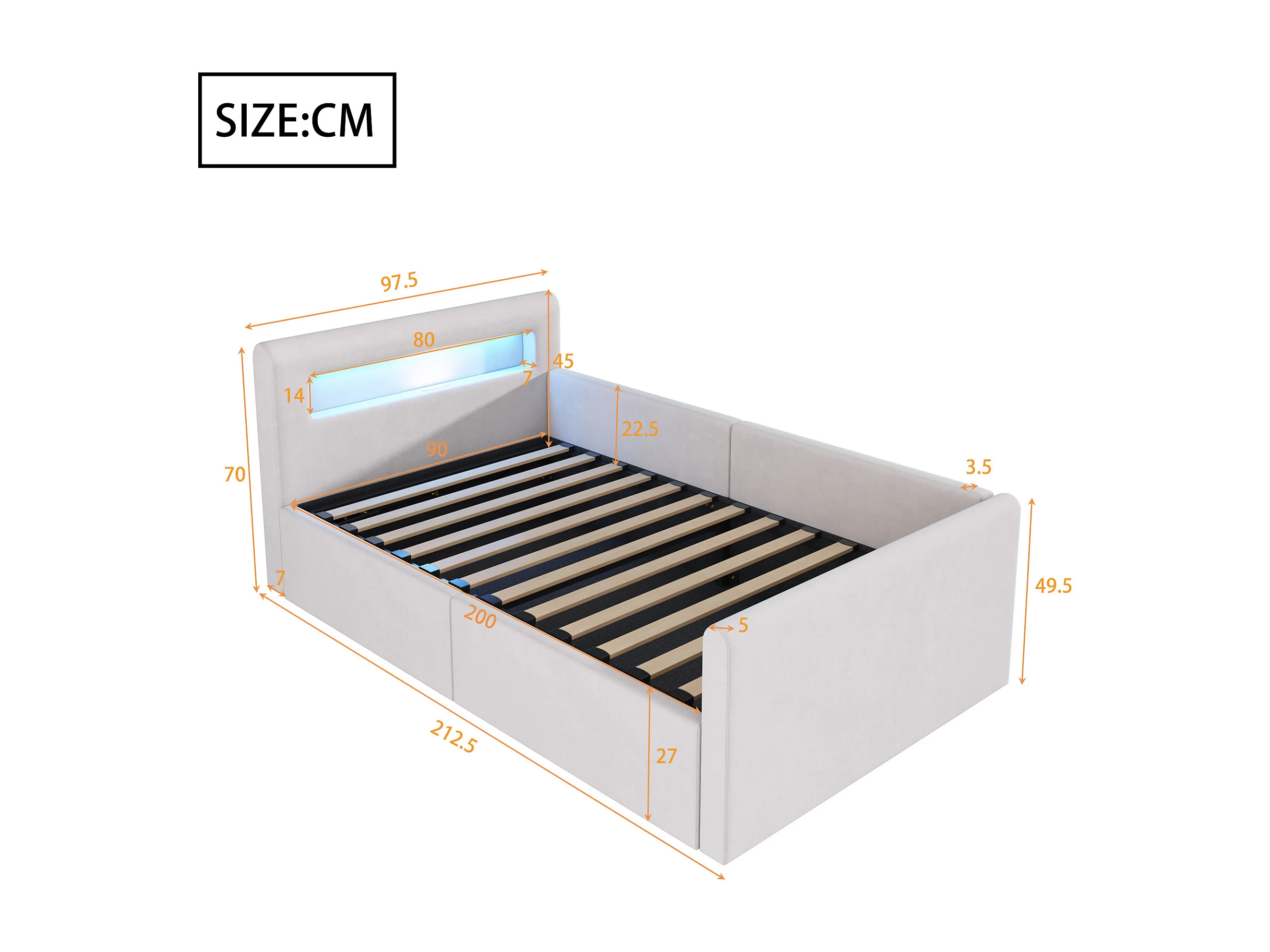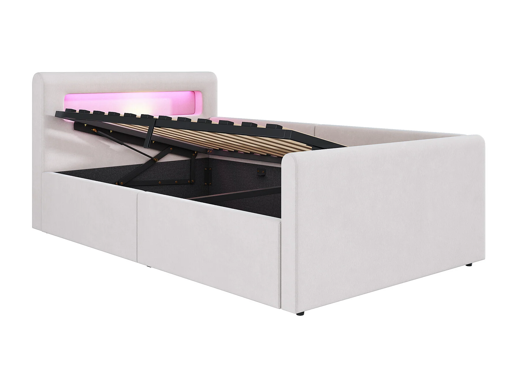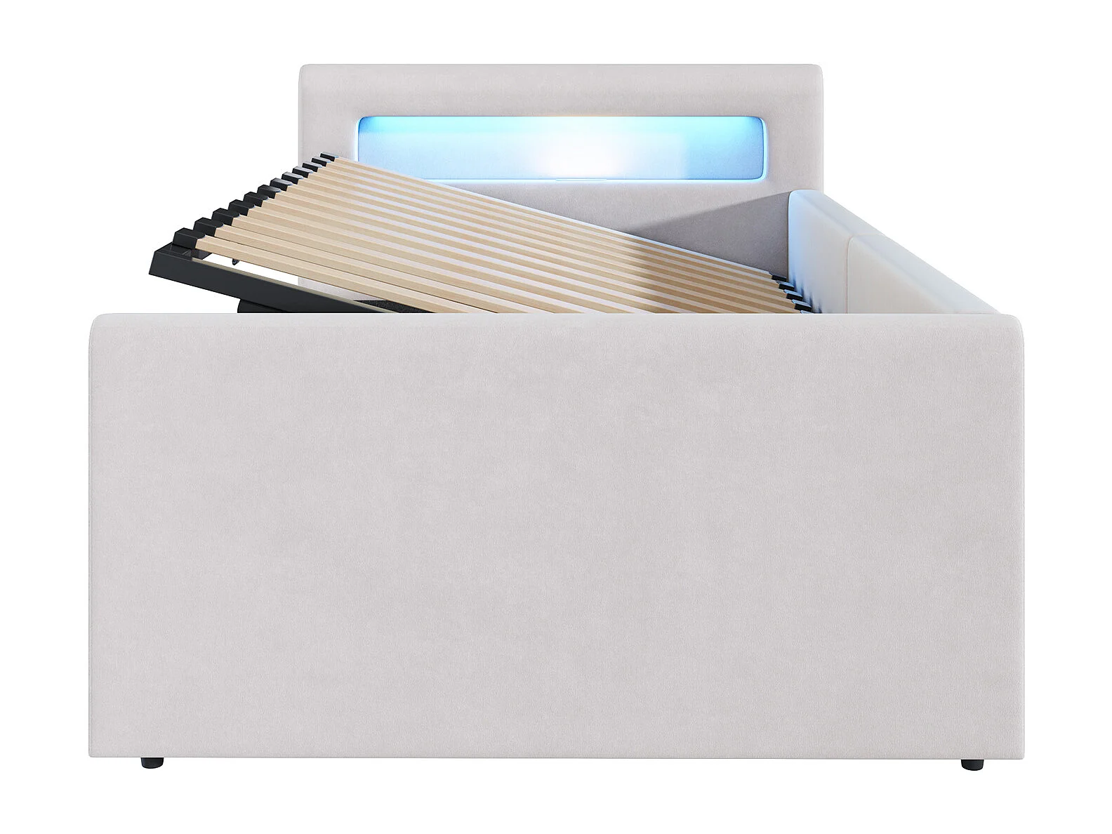 Lit coffre enfant 90x200 cm, velours beige, Lit simple avec LED et port USB, sans matelas