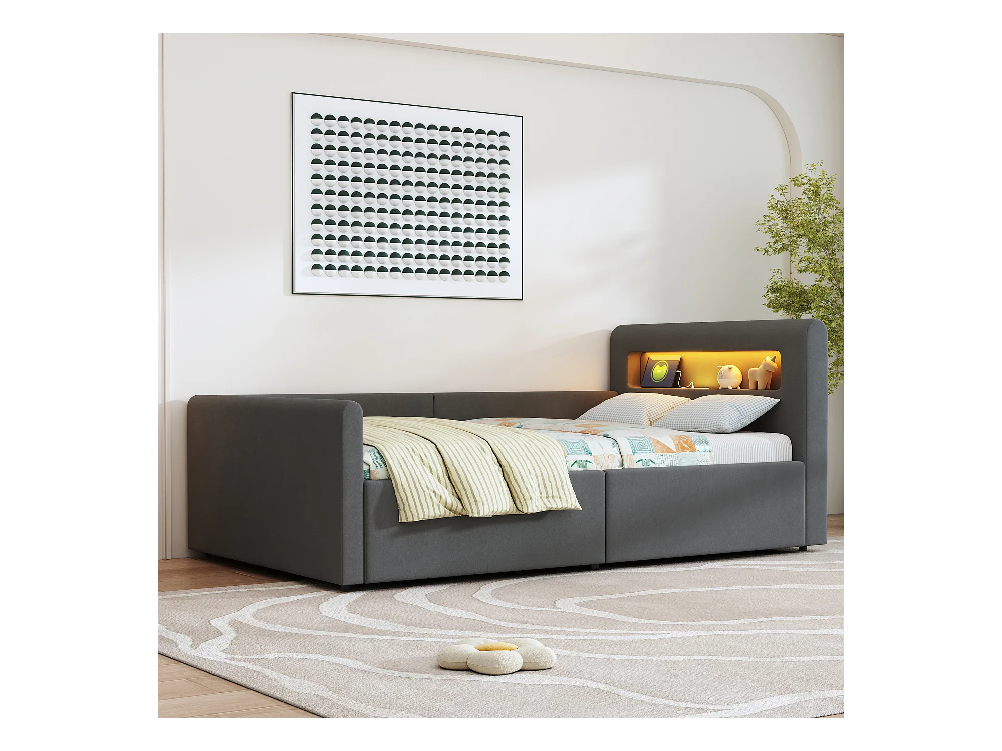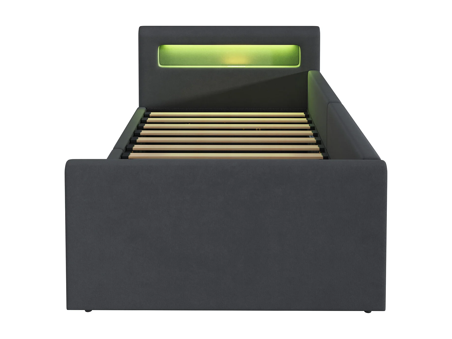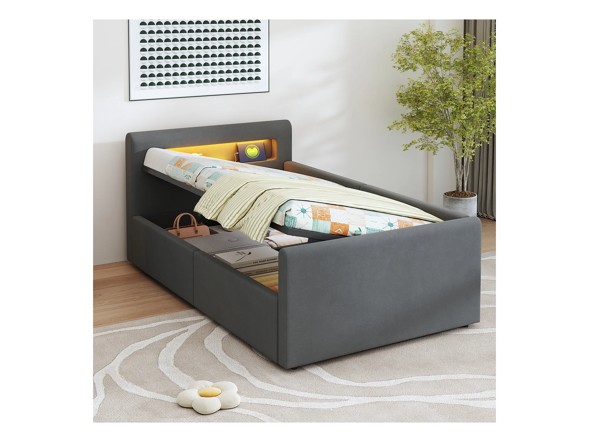 Lit coffre enfant 90x200 cm, velours gris foncé, Lit simple avec LED et port USB, sans matelas
