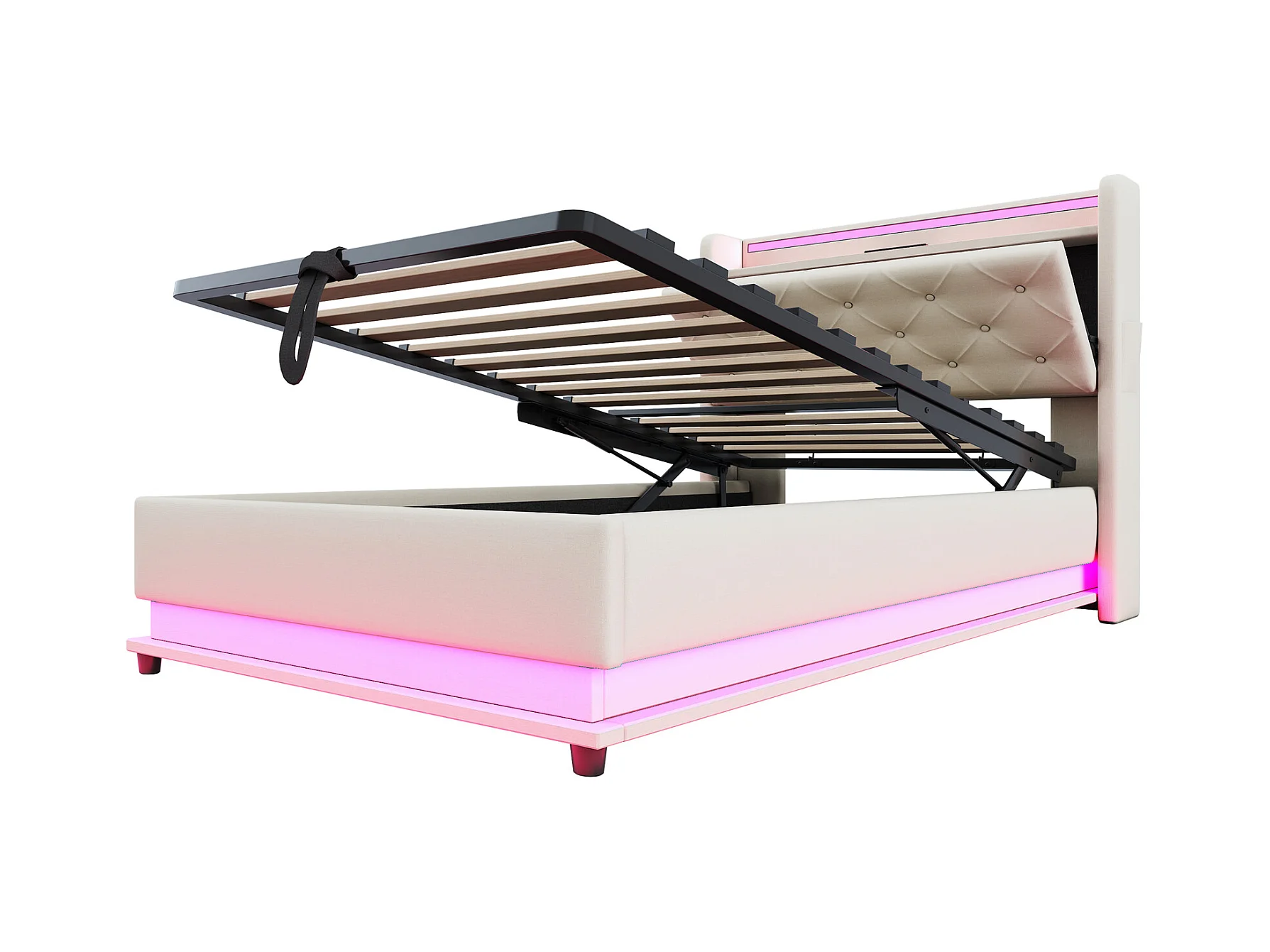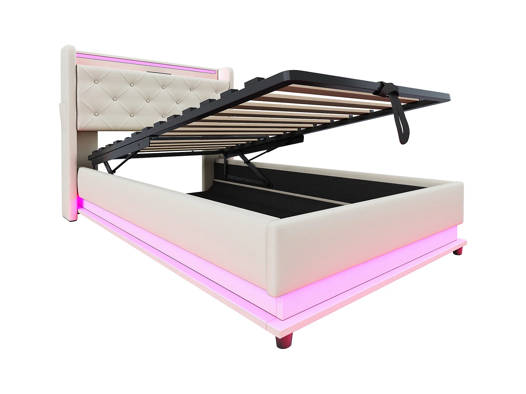 Lit coffre enfant 90x200cm beige en lin,tête de lit de rangement avec LED et USB, sans matelas