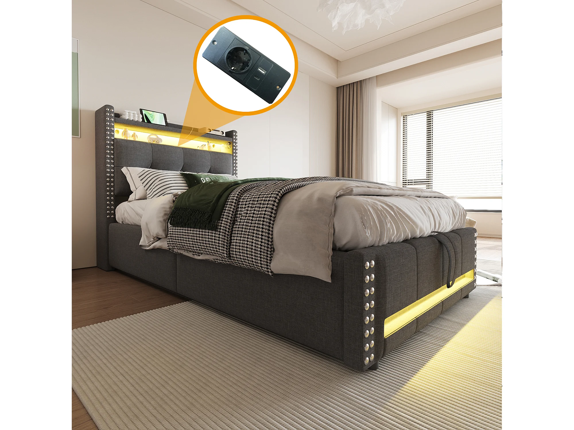 Lit coffre enfant 90x200cm gris en lin avec LED et USB, décoration de rivets, sans matelas