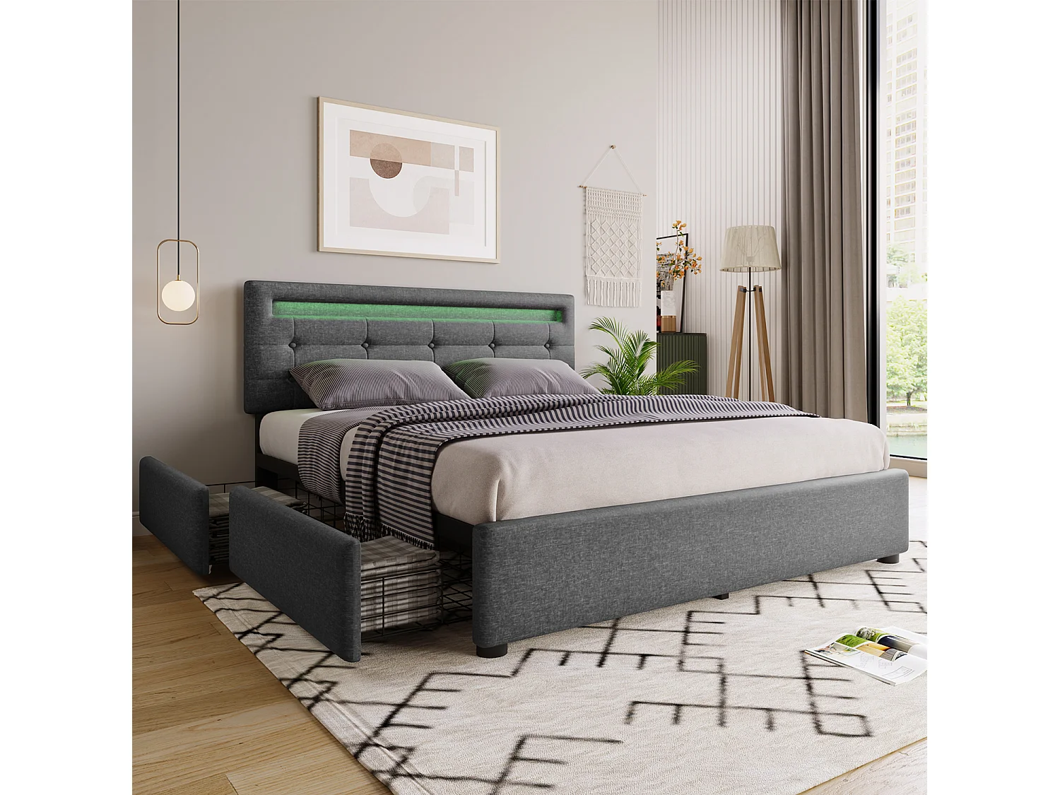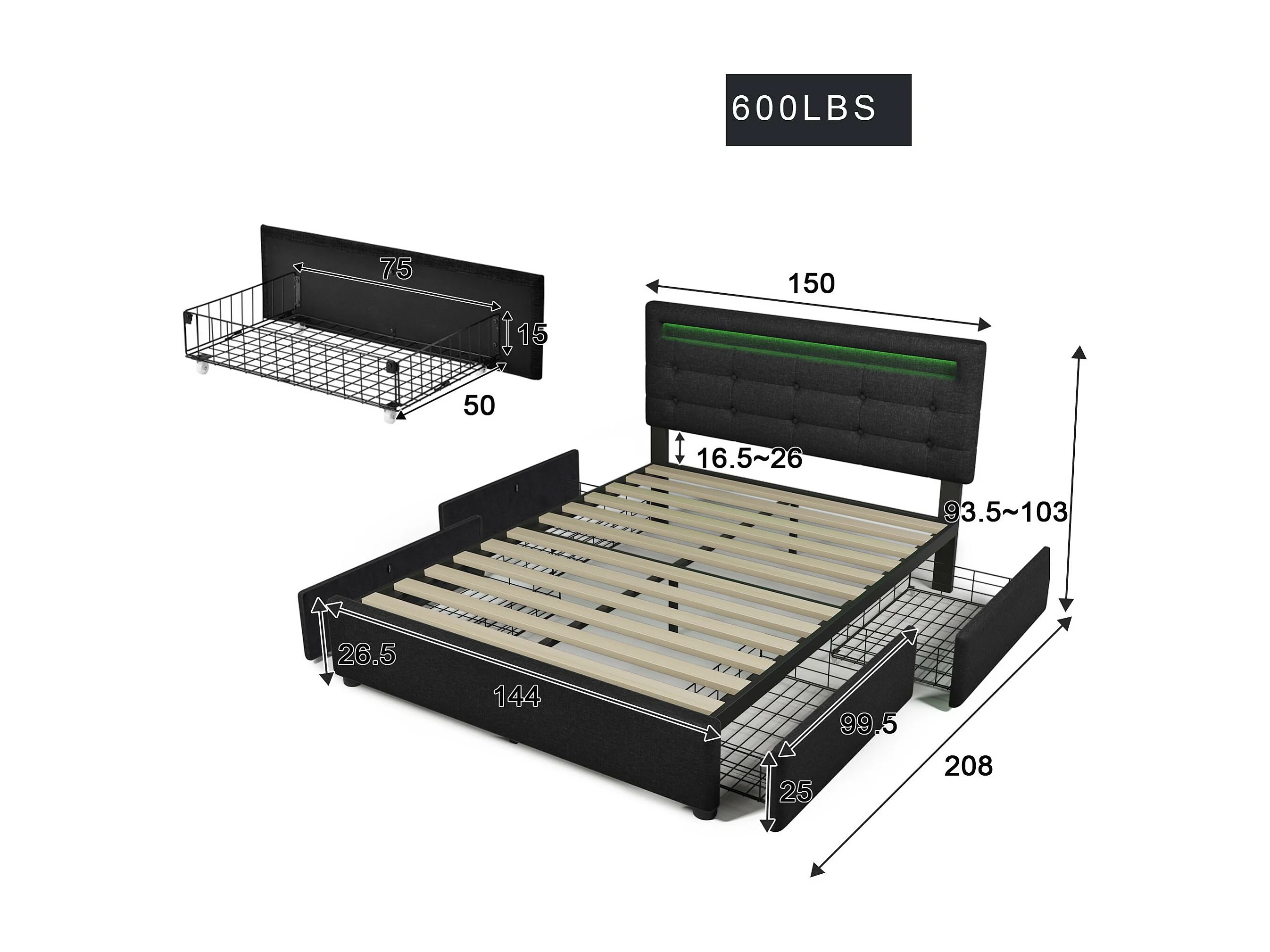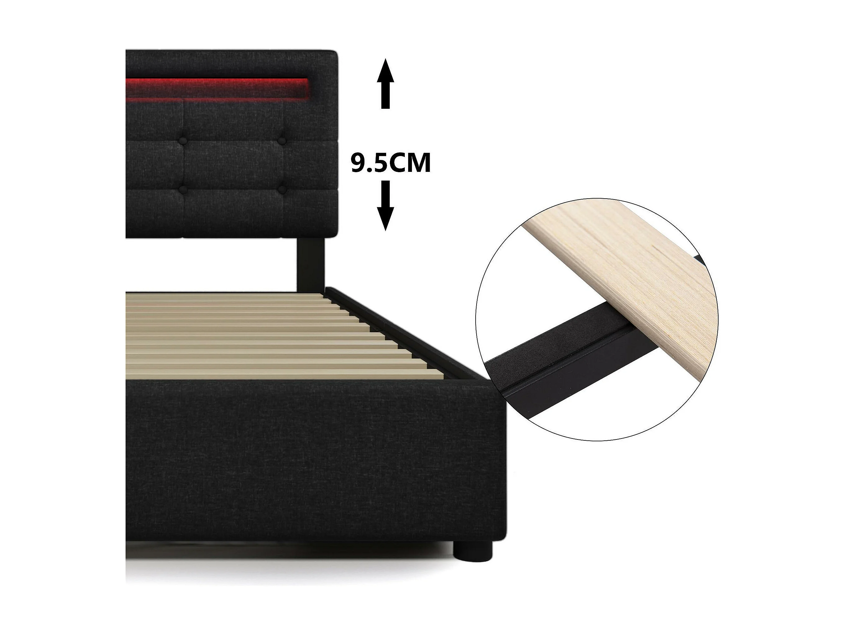 Lit coffre 140x200cm en lin avec LED + 2 tiroirs + sommier à lattes - Noir