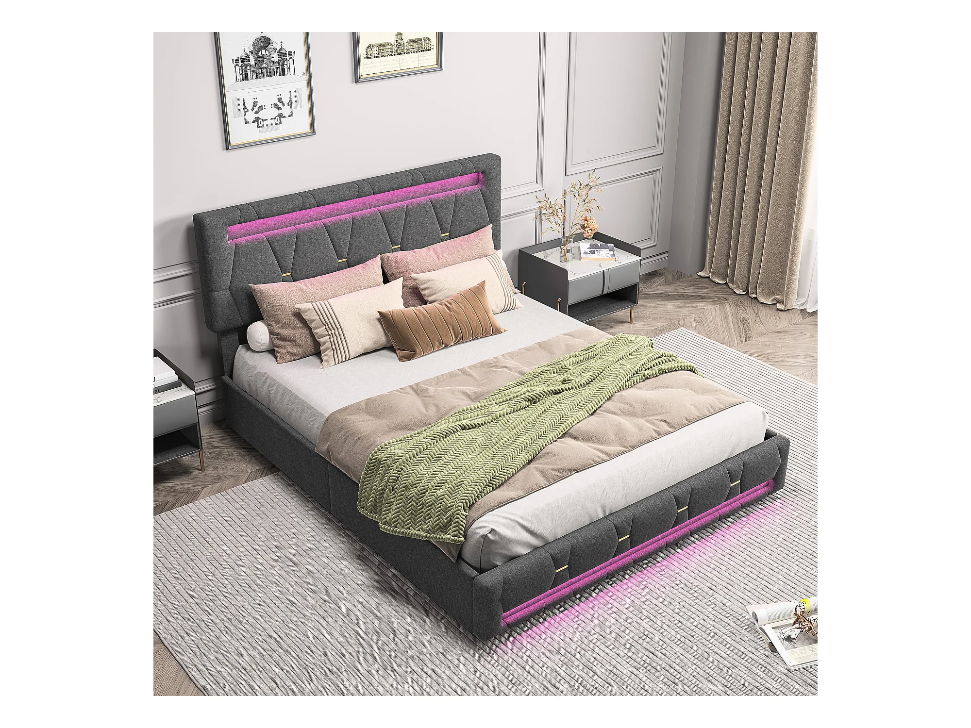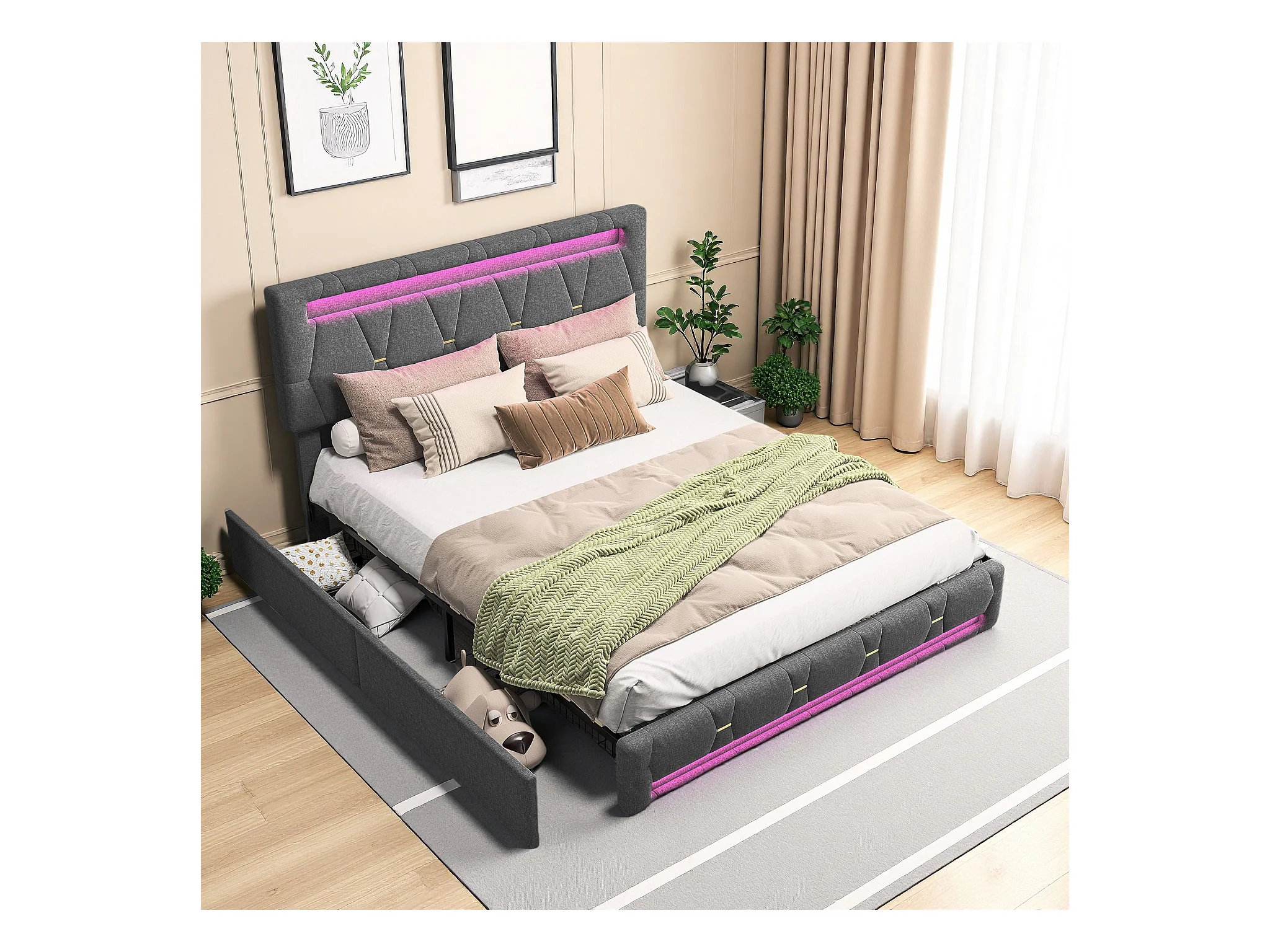 Lit coffre gris 140x200 cm avec LED RGB, 4 tiroirs, tissu lin, tête réglables, lumière contrôlable par télécommande et app