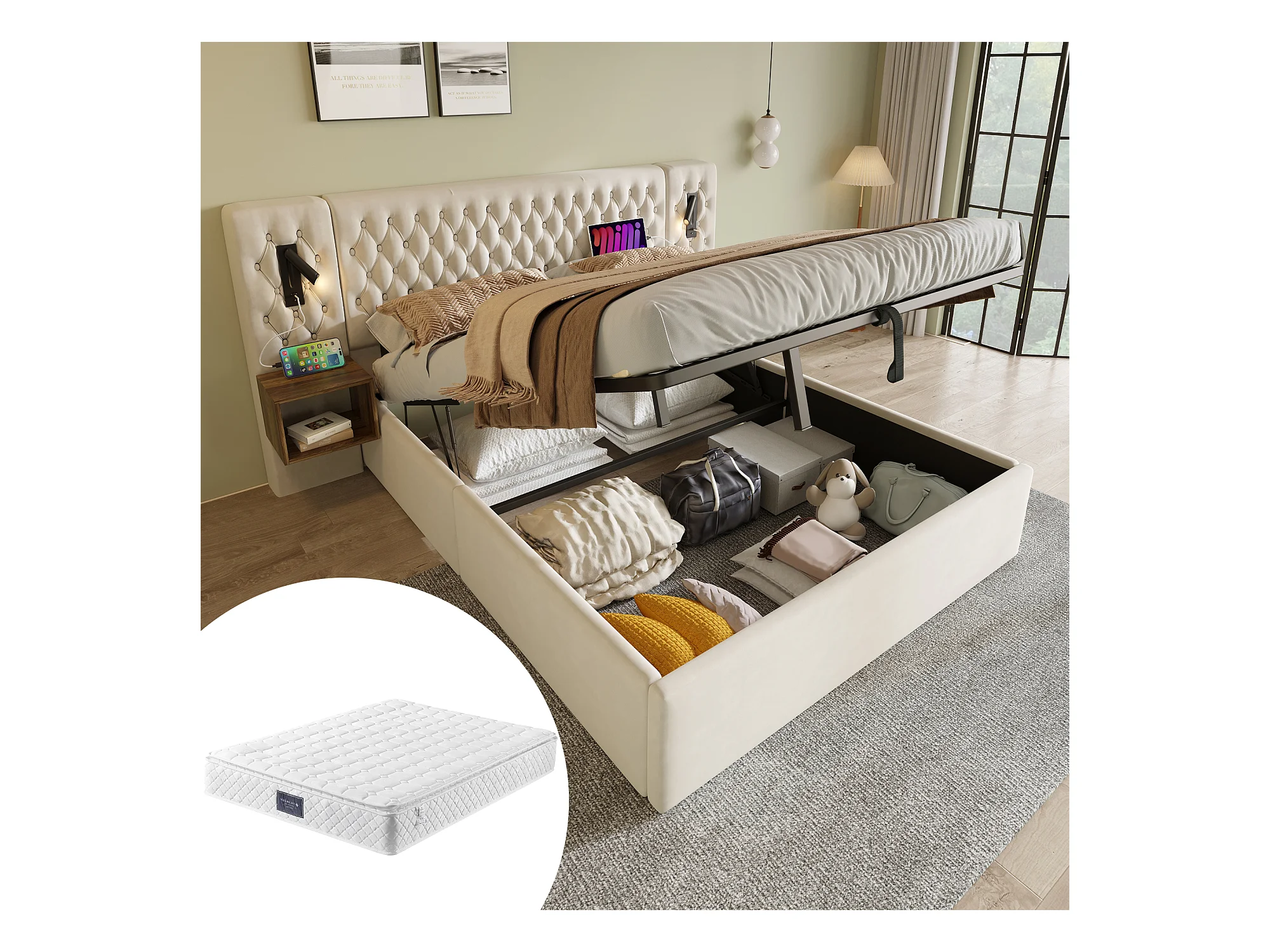 Lit double rembourré - 160 x 200 cm - rangement hydraulique - avec Leds + USB - velours - beige(avec matelas)