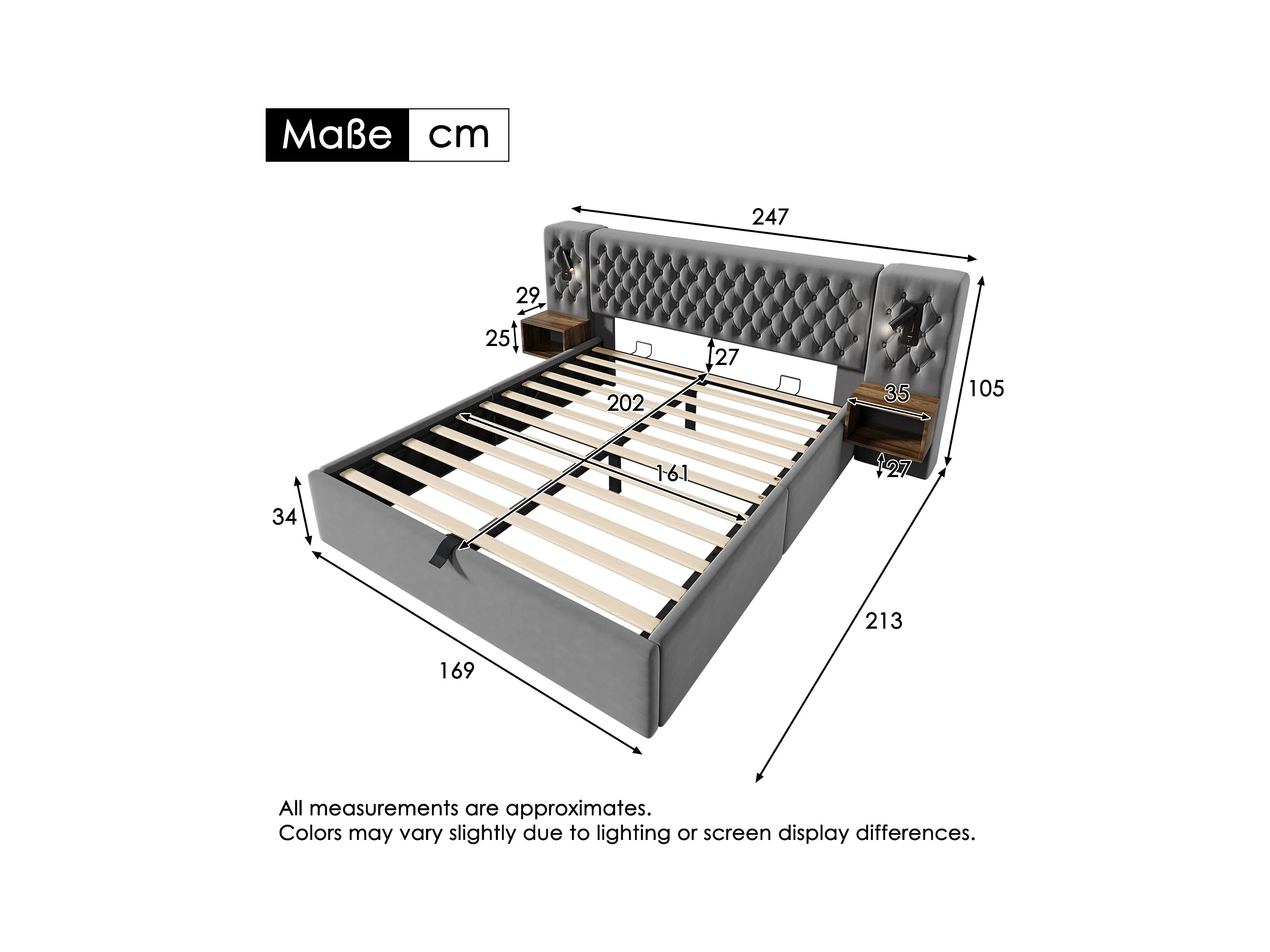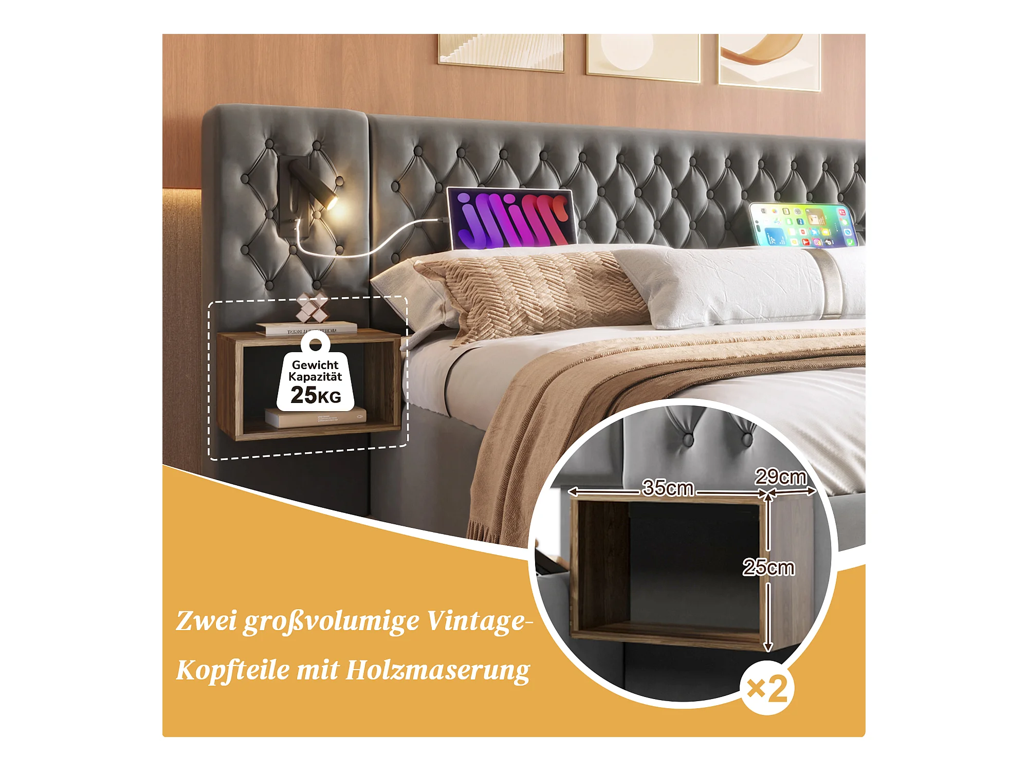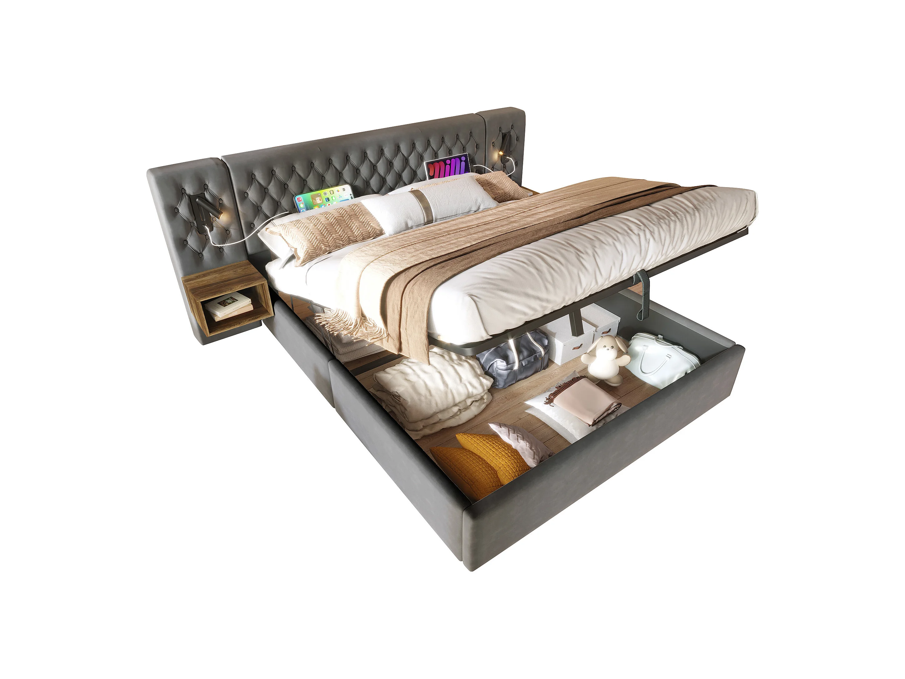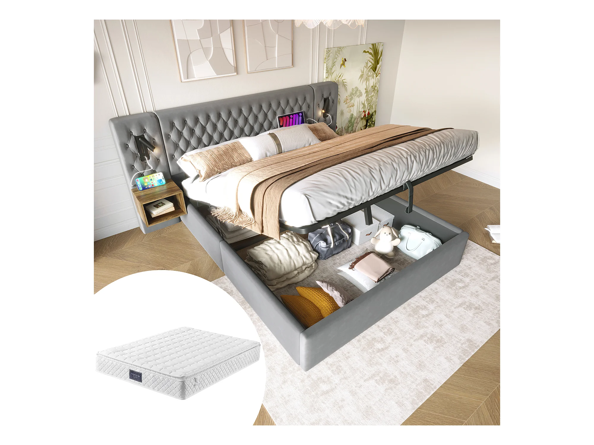 Lit double rembourré - 160 x 200 cm - rangement hydraulique - avec Leds + USB - velours - gris(avec matelas)