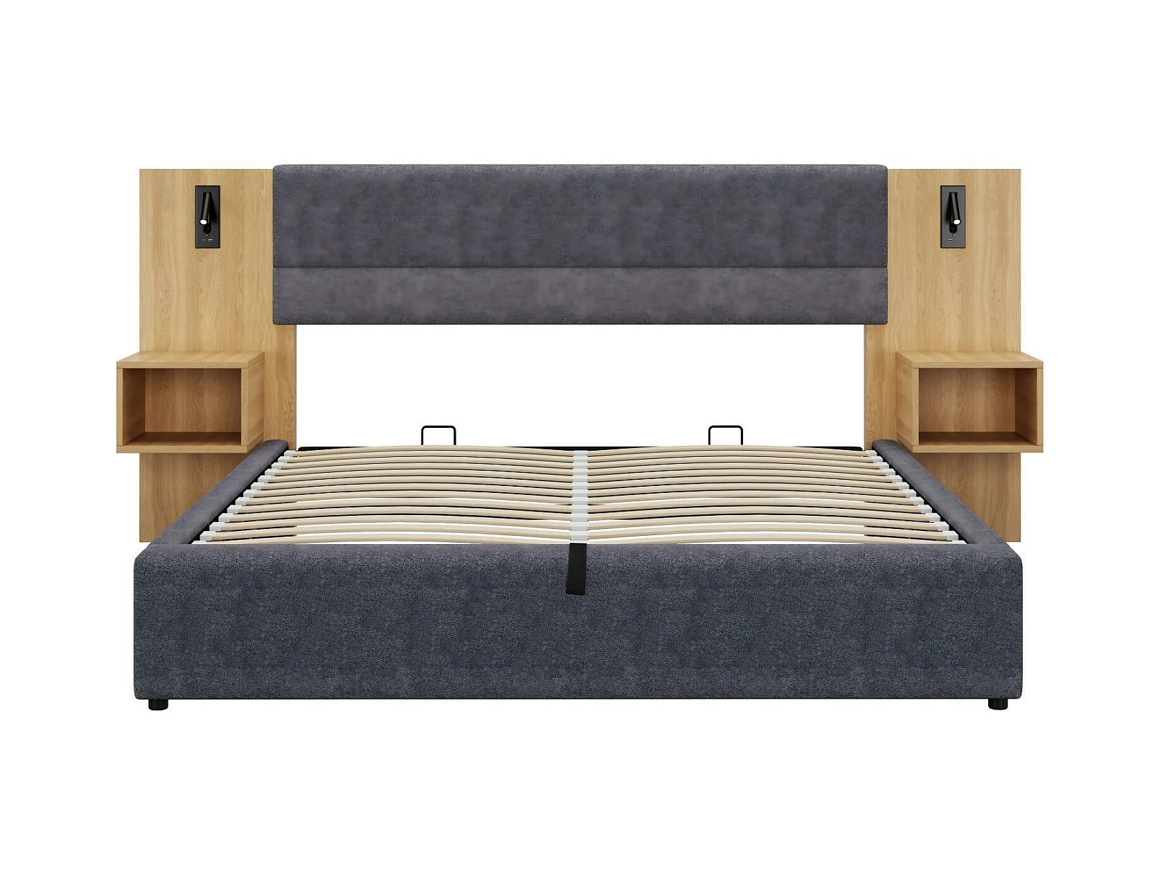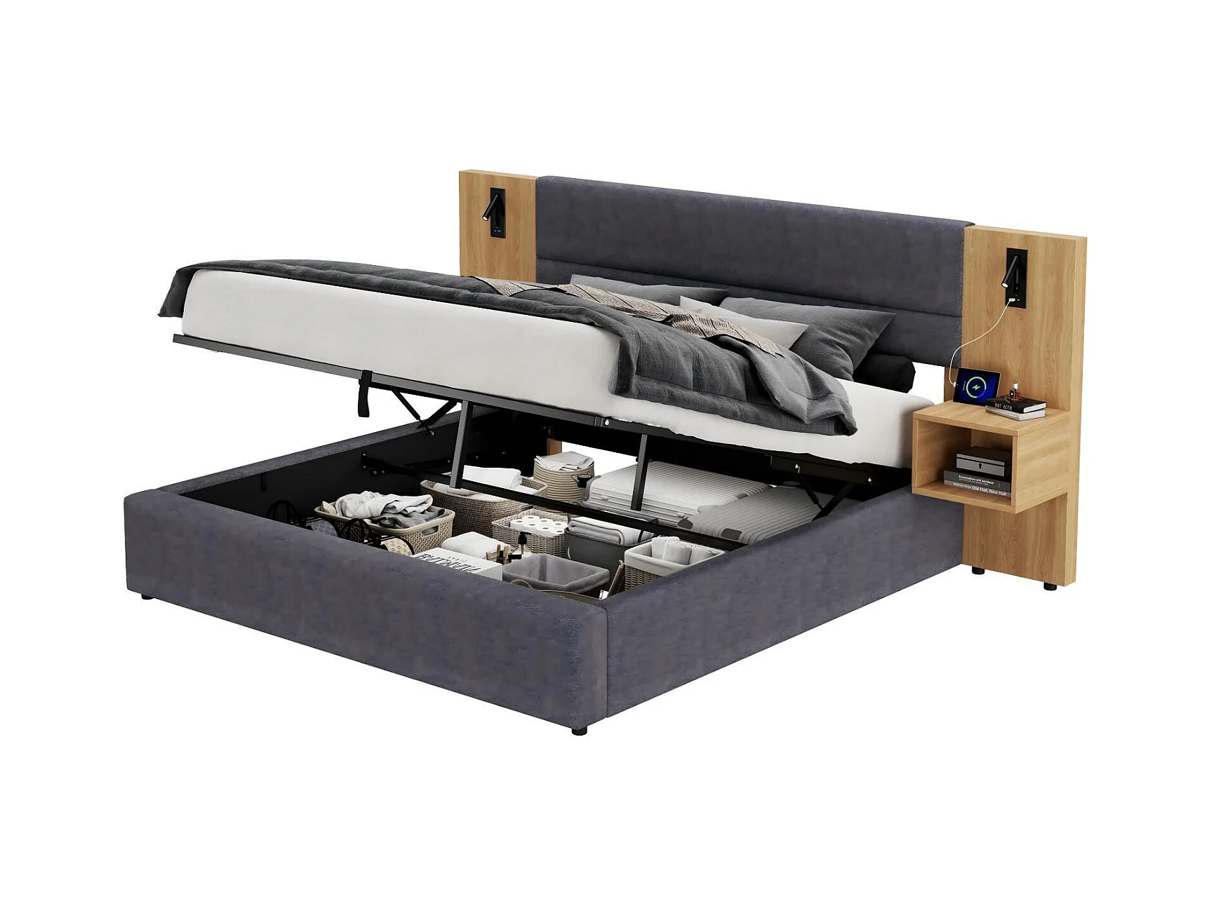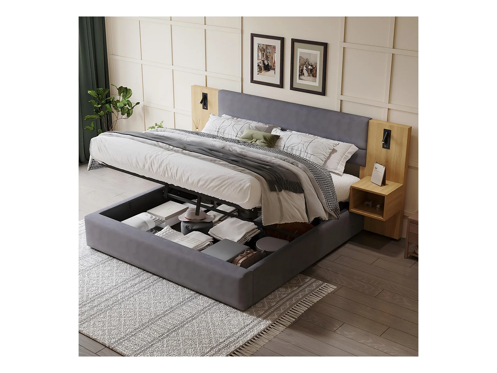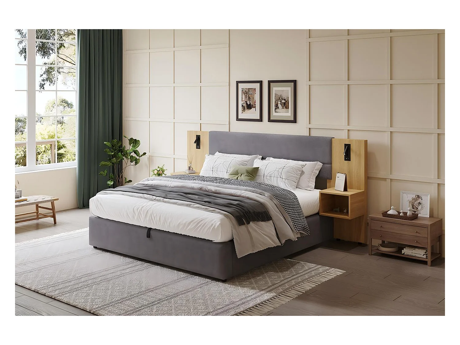 Lit coffre hydraulique 180x200cm, en velours, avec tables de chevet, LED et ports de USB, Gris