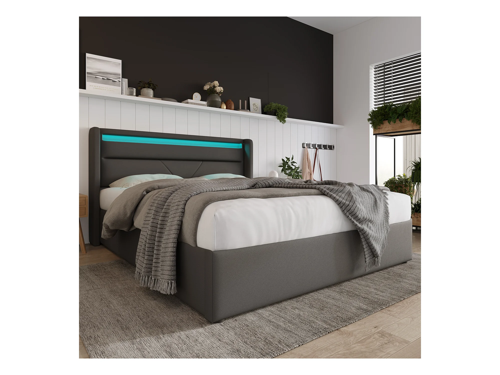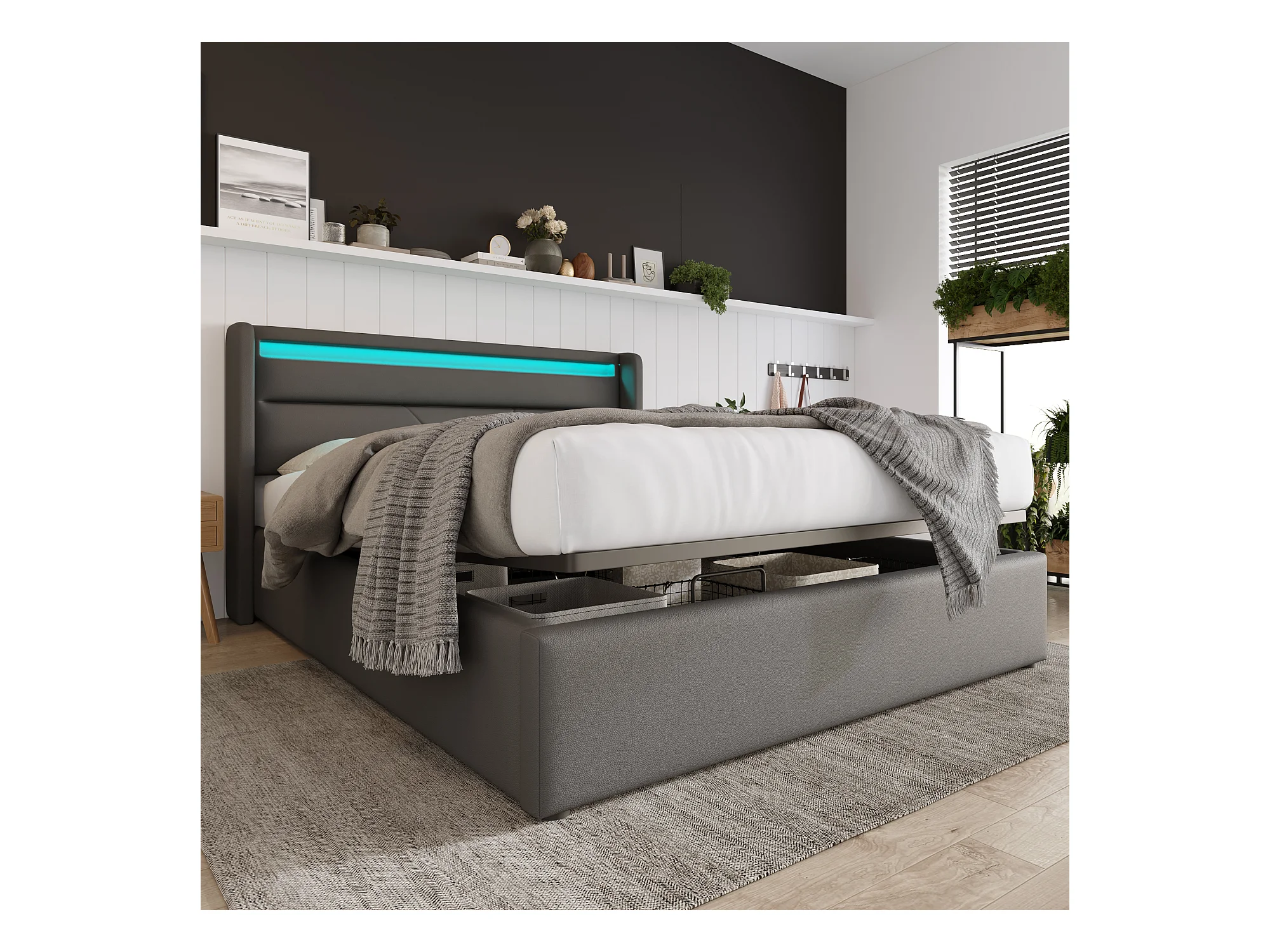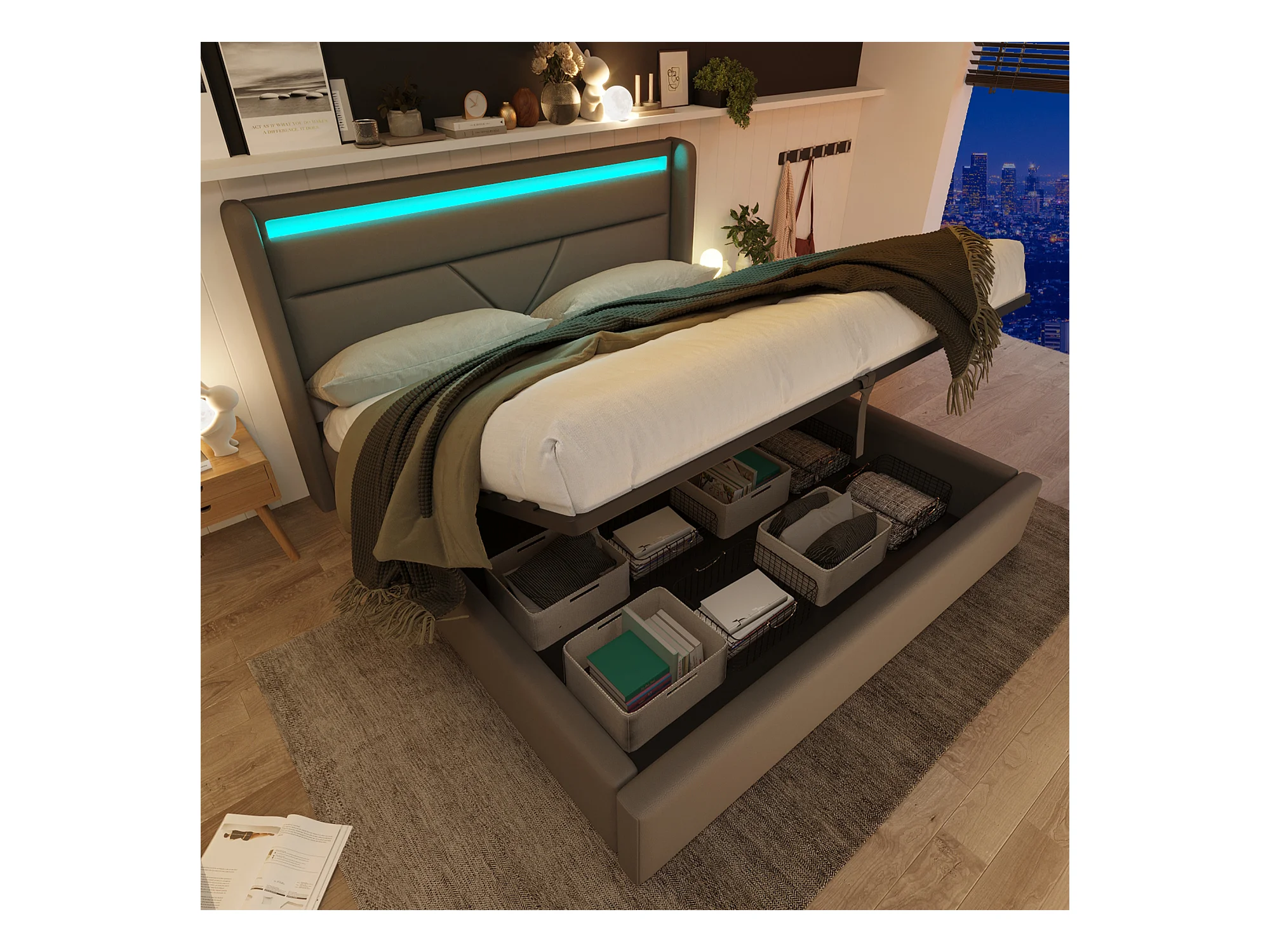 Lit coffre hydraulique avec éclairage LED, revêtement PU gris, rangement intégré, télécommande (202x146x107.5 cm)
