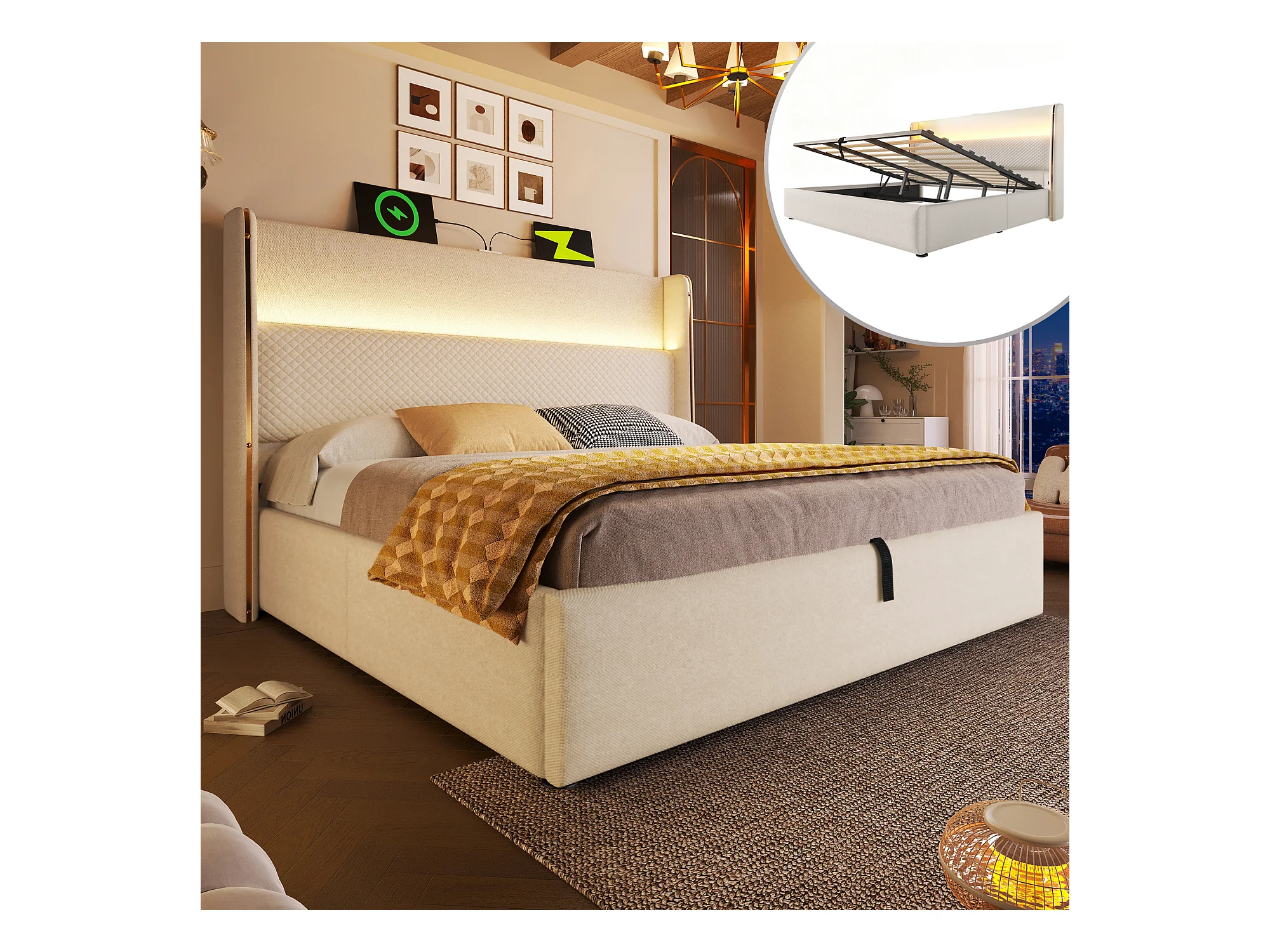 Lit coffre hydraulique avec tête de lit + Leds et ports USB/Type-C - 160 x 200 cm - lin - beige