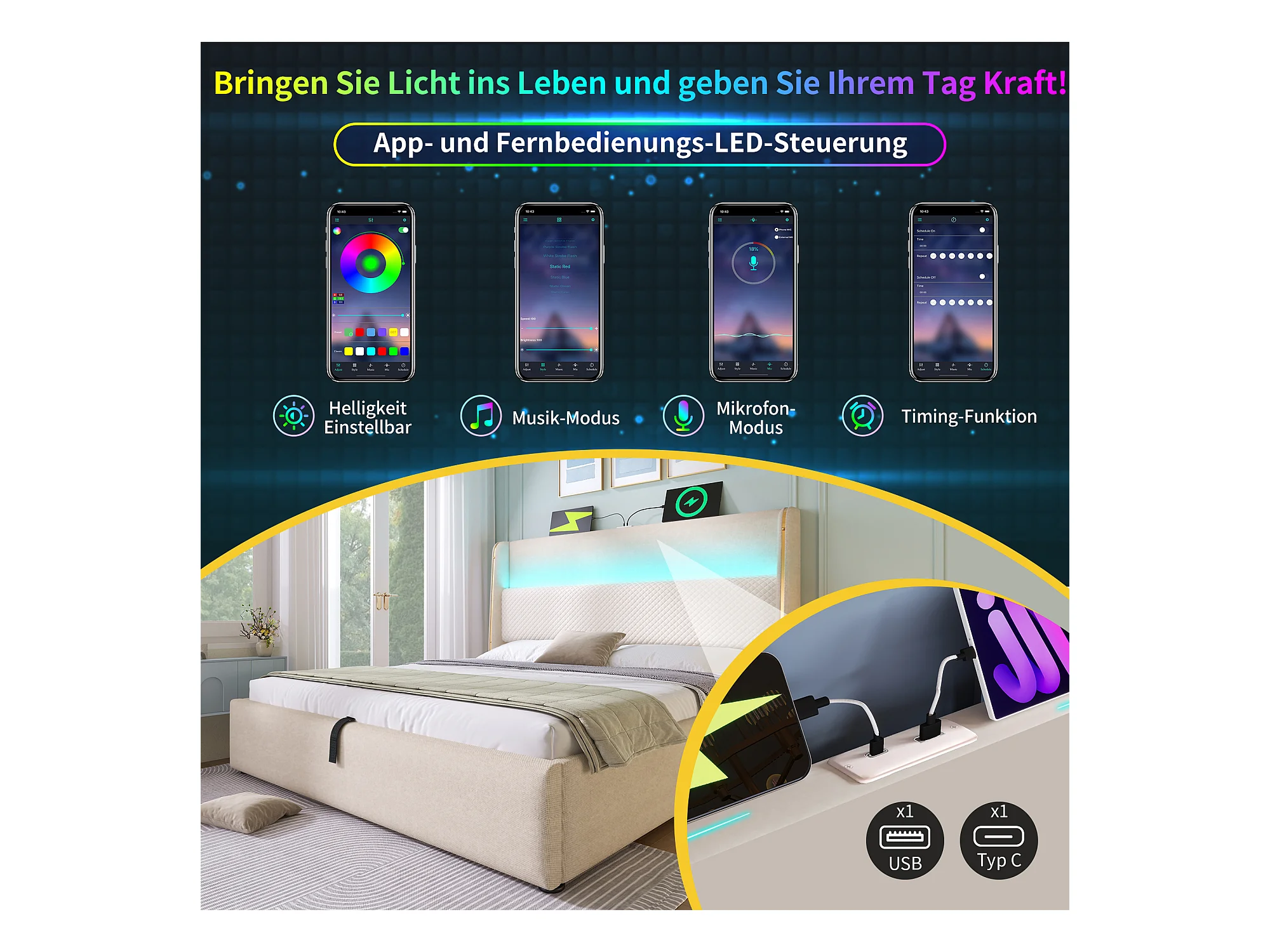 Lit coffre hydraulique avec tête de lit + Leds et ports USB/Type-C - 180 x 200 cm - lin - beige(avec matelas)