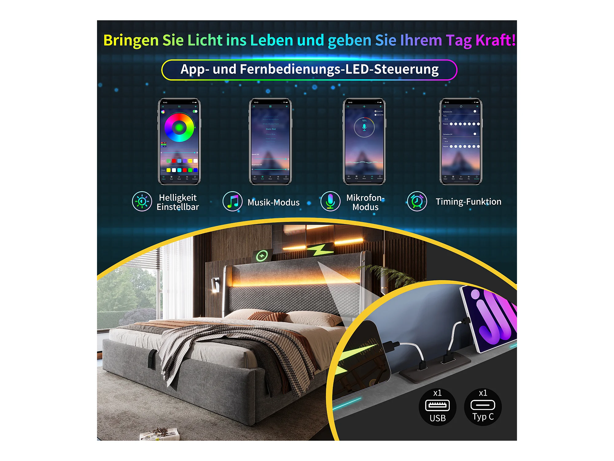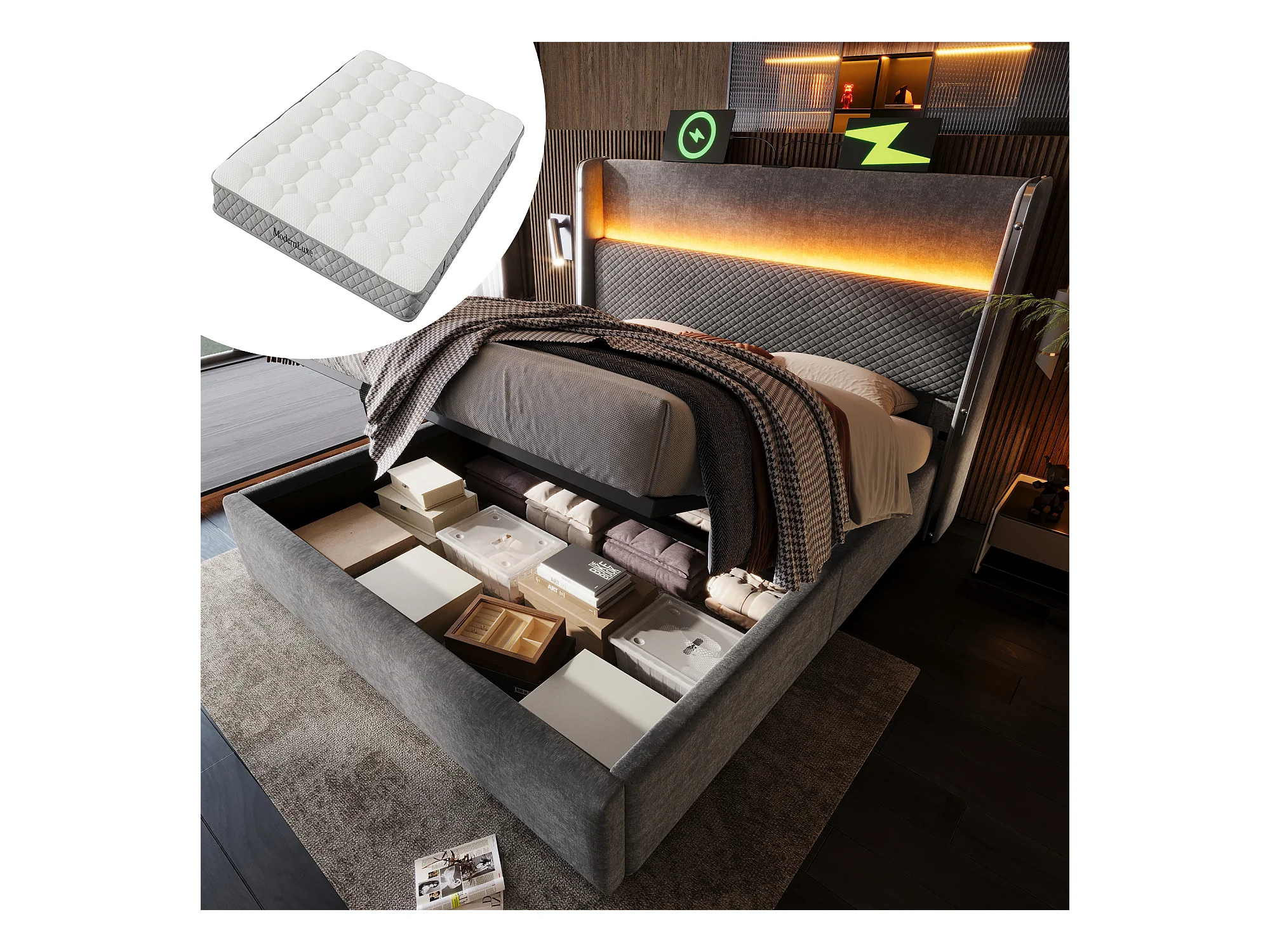 Lit coffre hydraulique avec tête de lit + Leds et ports USB/Type-C - 180 x 200 cm - lin - gris(avec matelas)