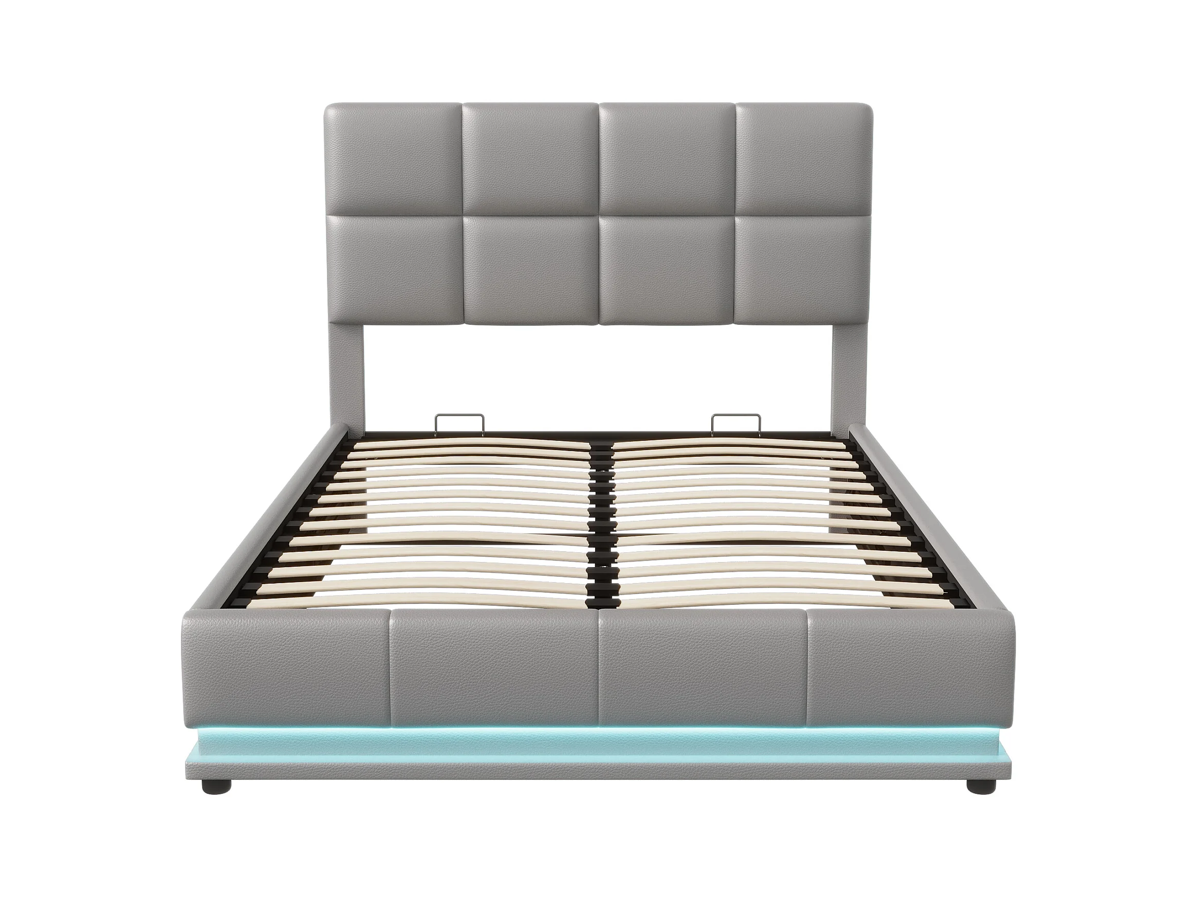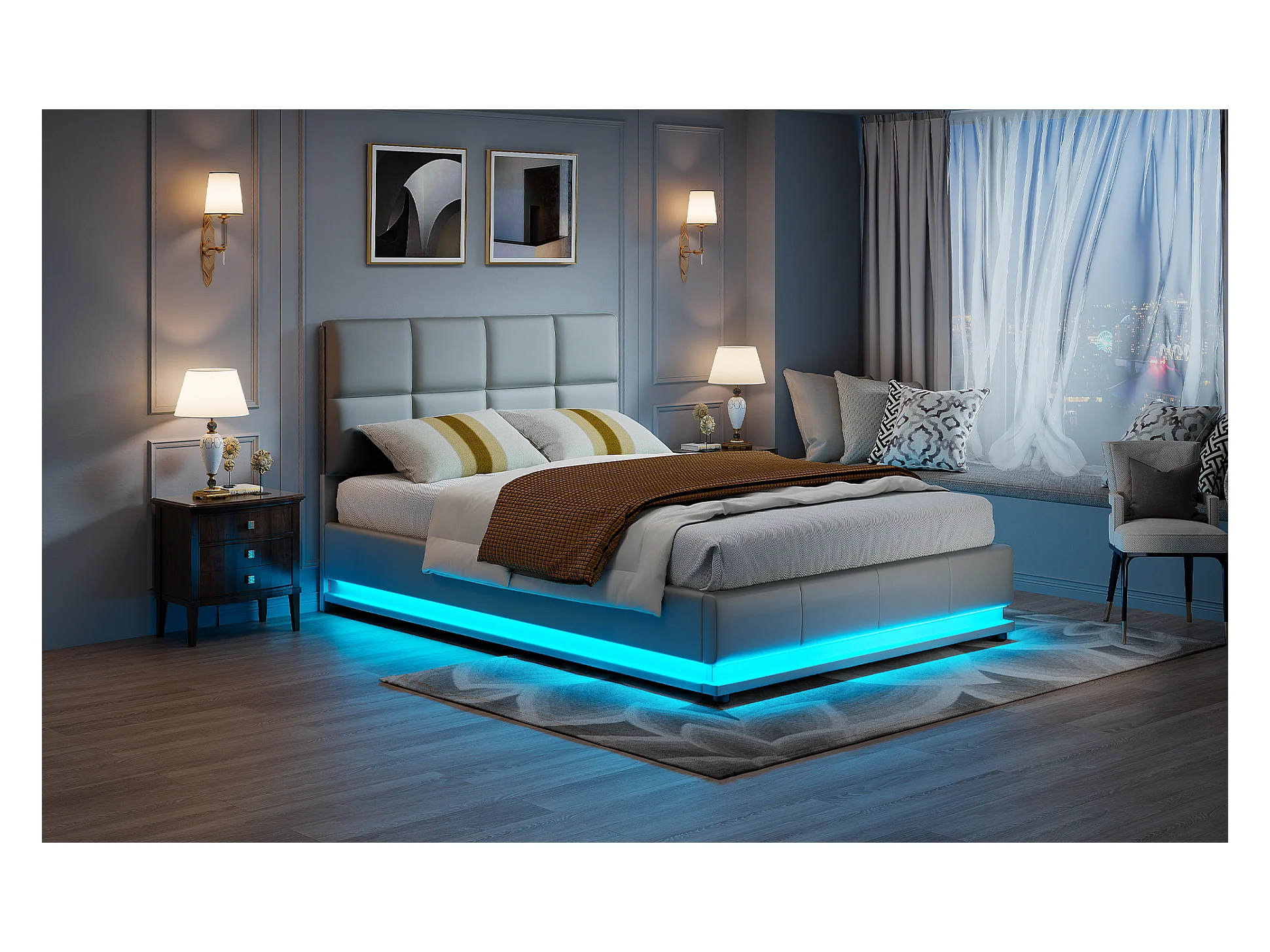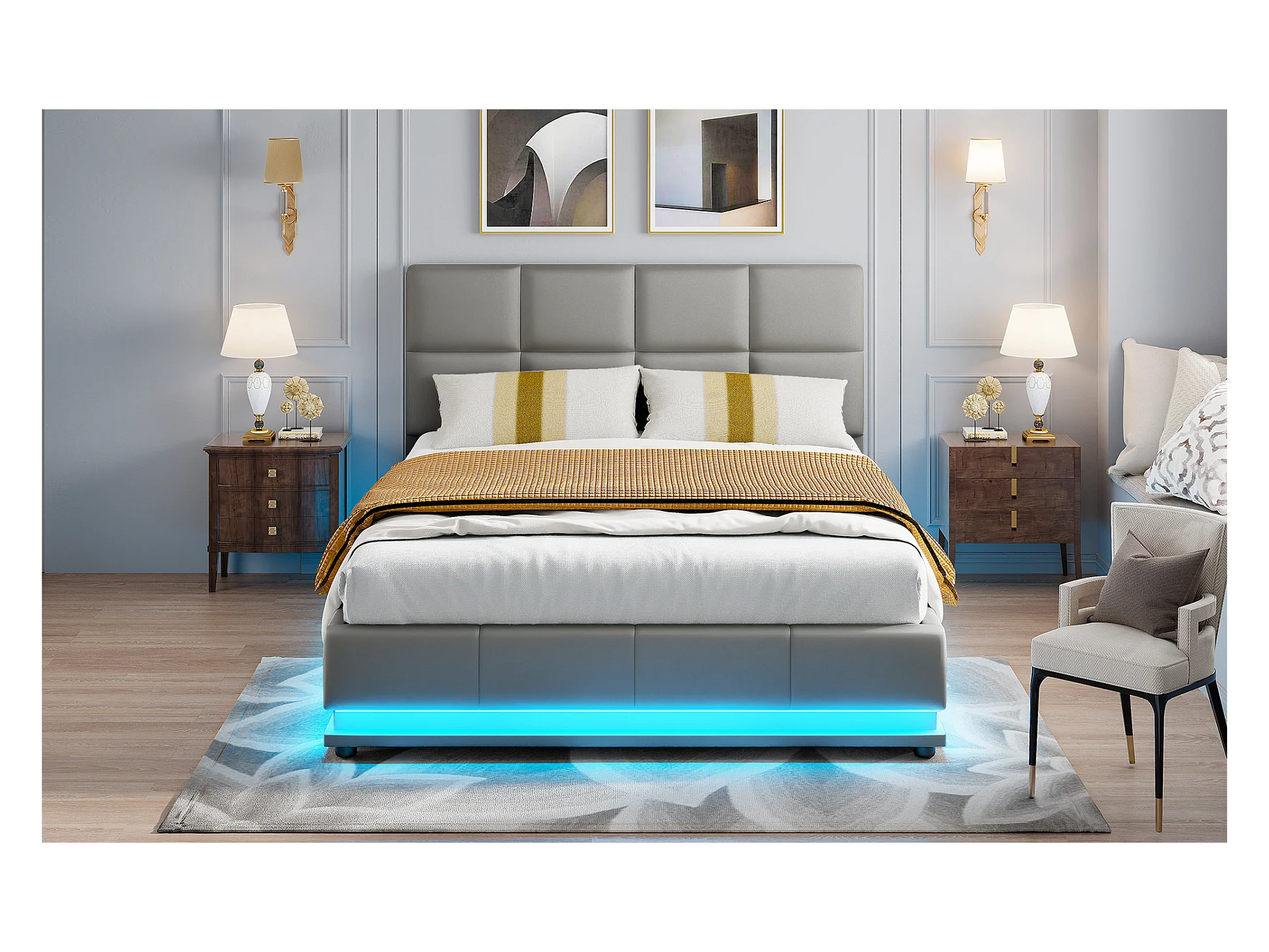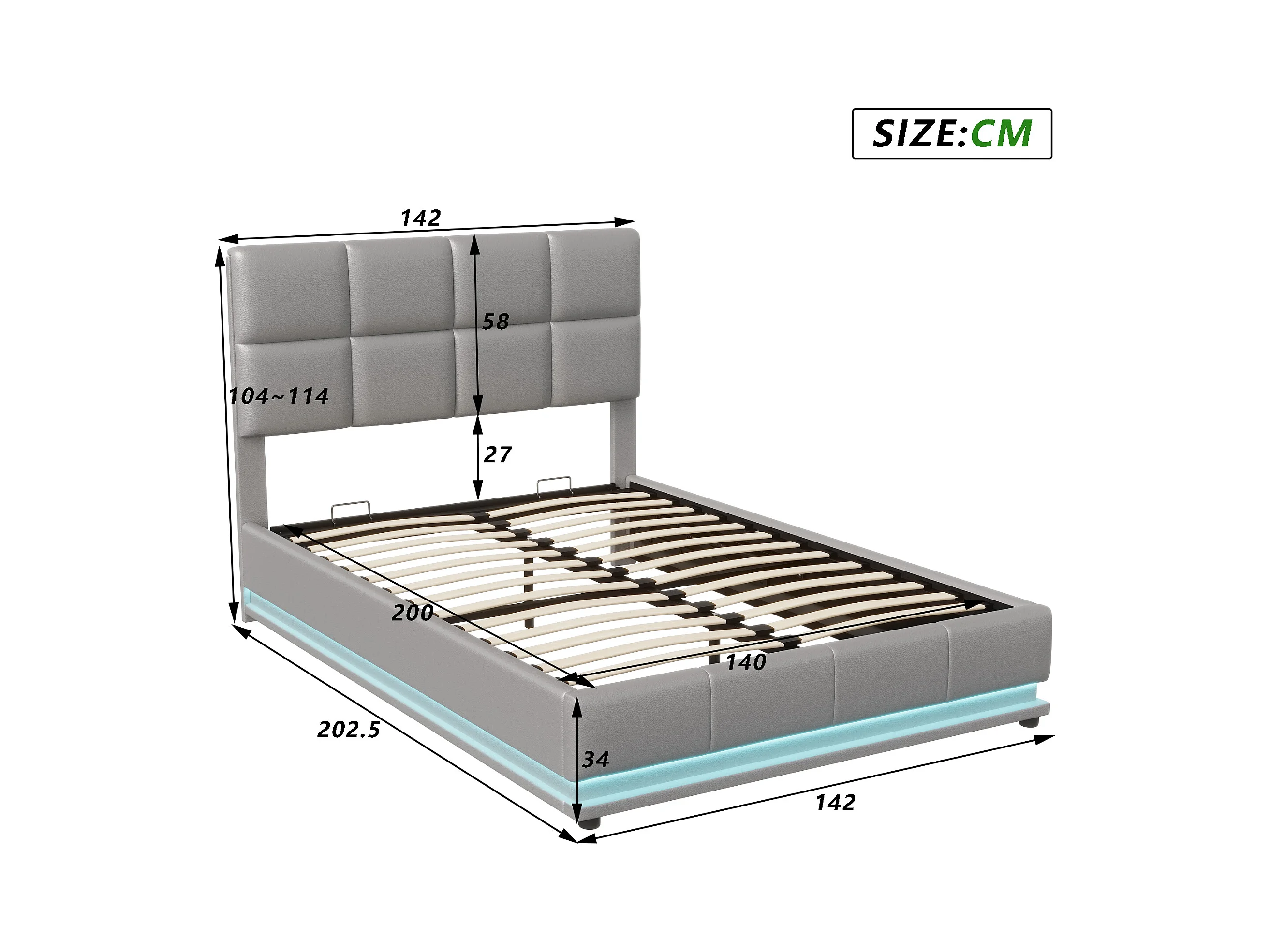 Lit coffre hydraulique LED 140x200 cm en similicuir gris avec télécommande – Lit moderne avec rangement, structure métallique robuste, facile à monter