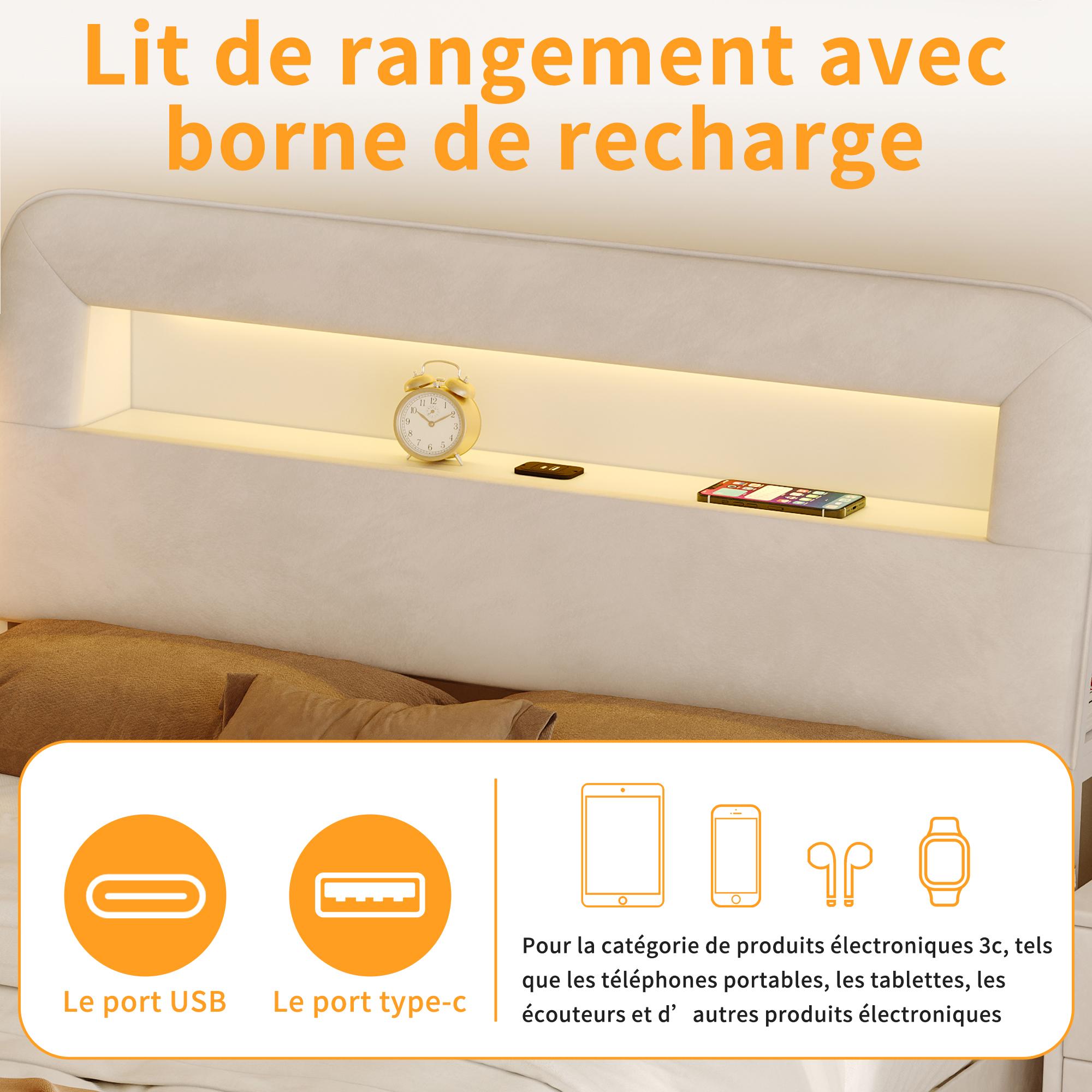 Lit coffre multifonction en velours avec LED, ports USB/Type-C, tête de lit avec rangements et 2 tiroirs, 160x200cm, Beige