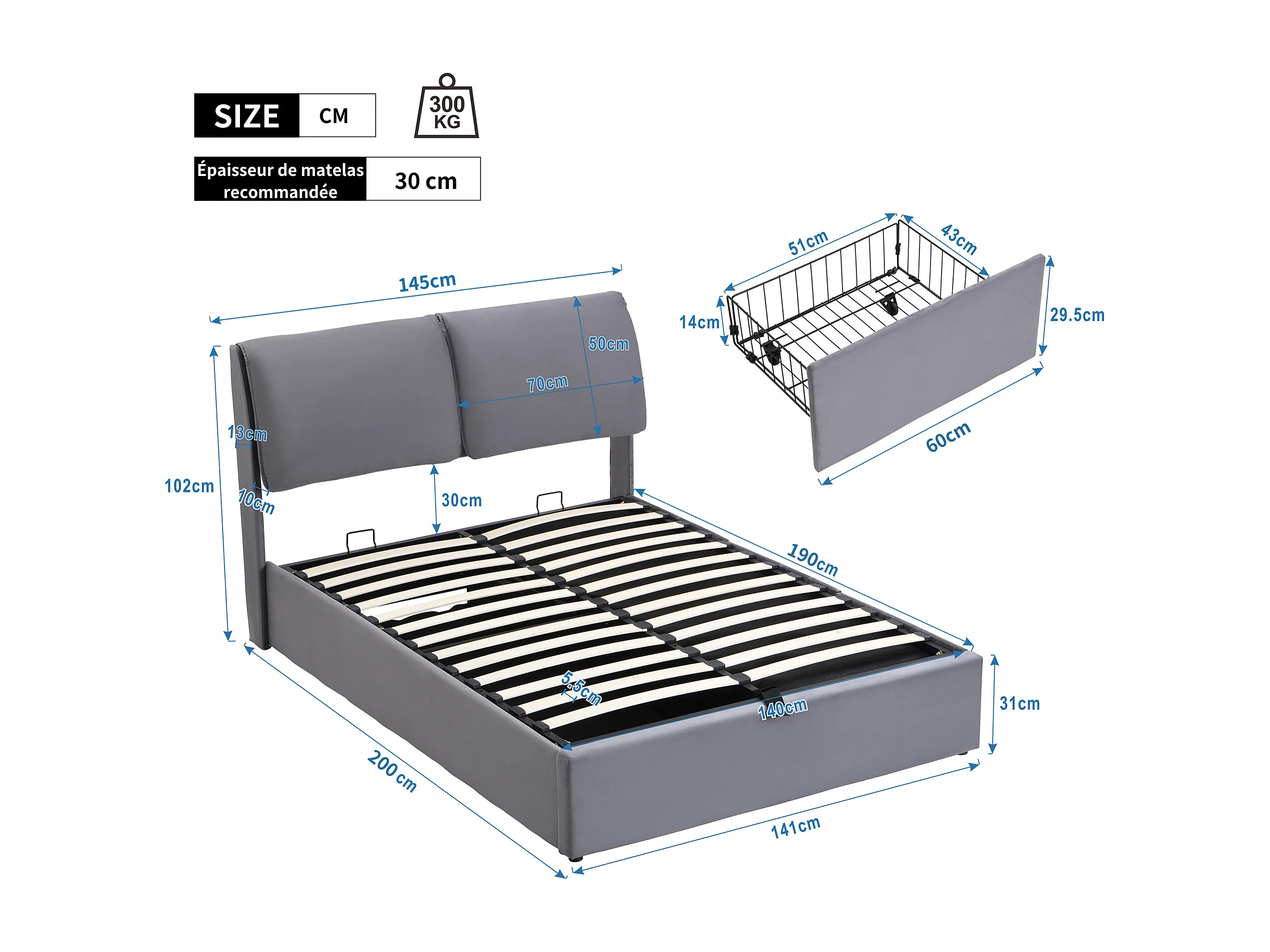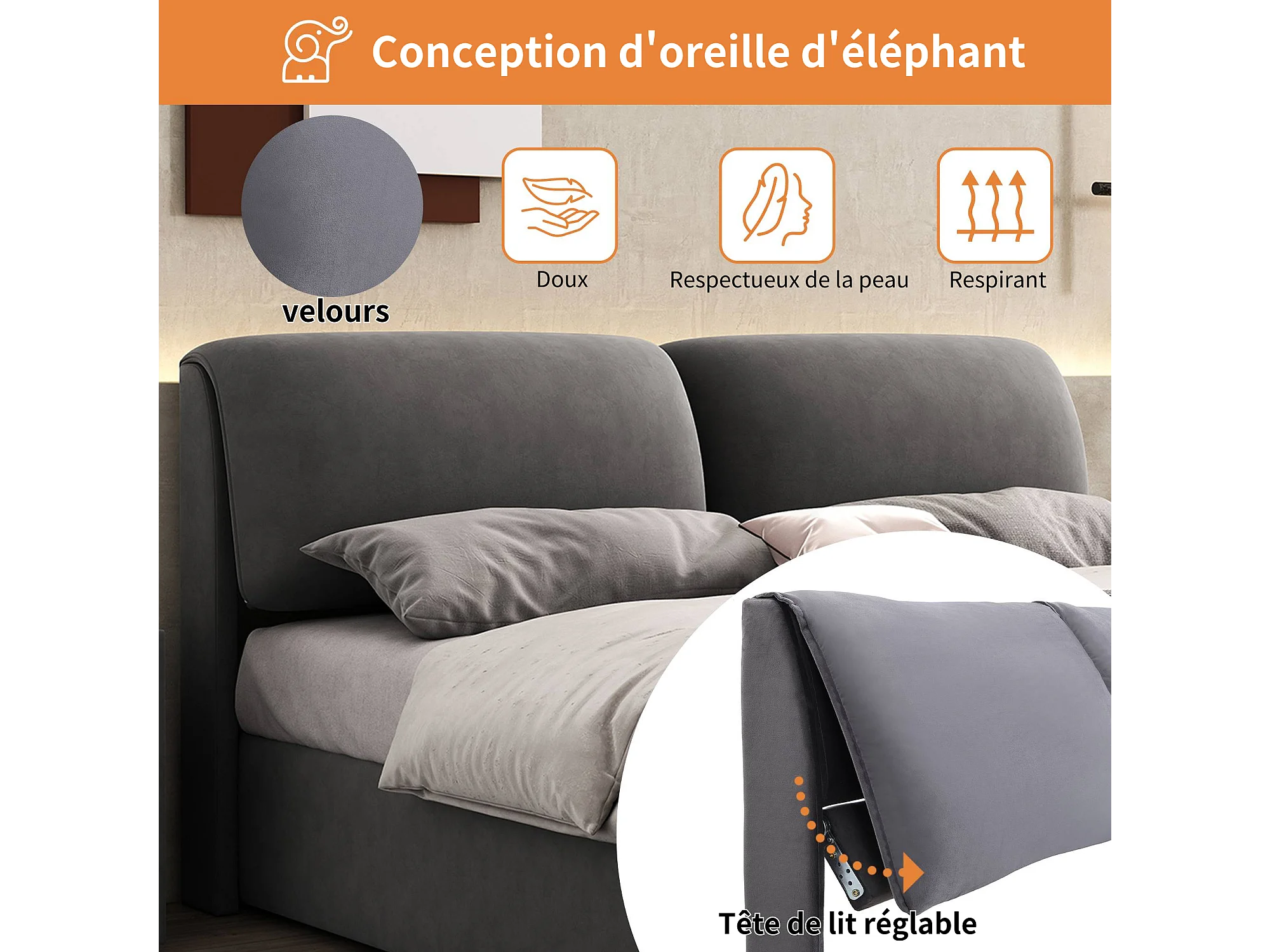 Lit coffre rembourré - 140 x 190 cm - avec 3 tiroirs et tête de lit - tissu en velours - gris