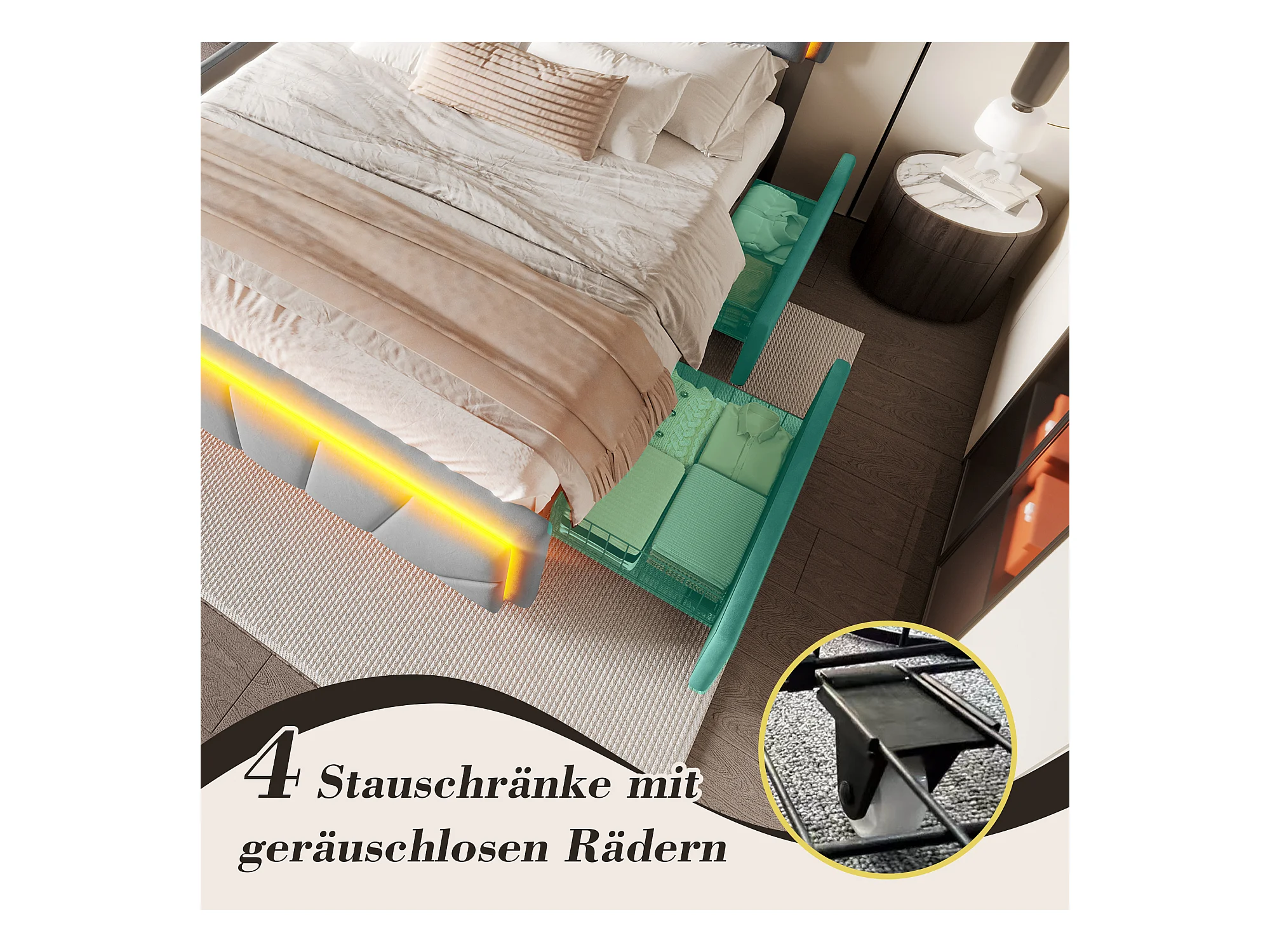 Lit coffre rembourré - 140 x 200 cm - avec tête de lit + Leds + USB Type-C + 4 tiroirs - velours - gris