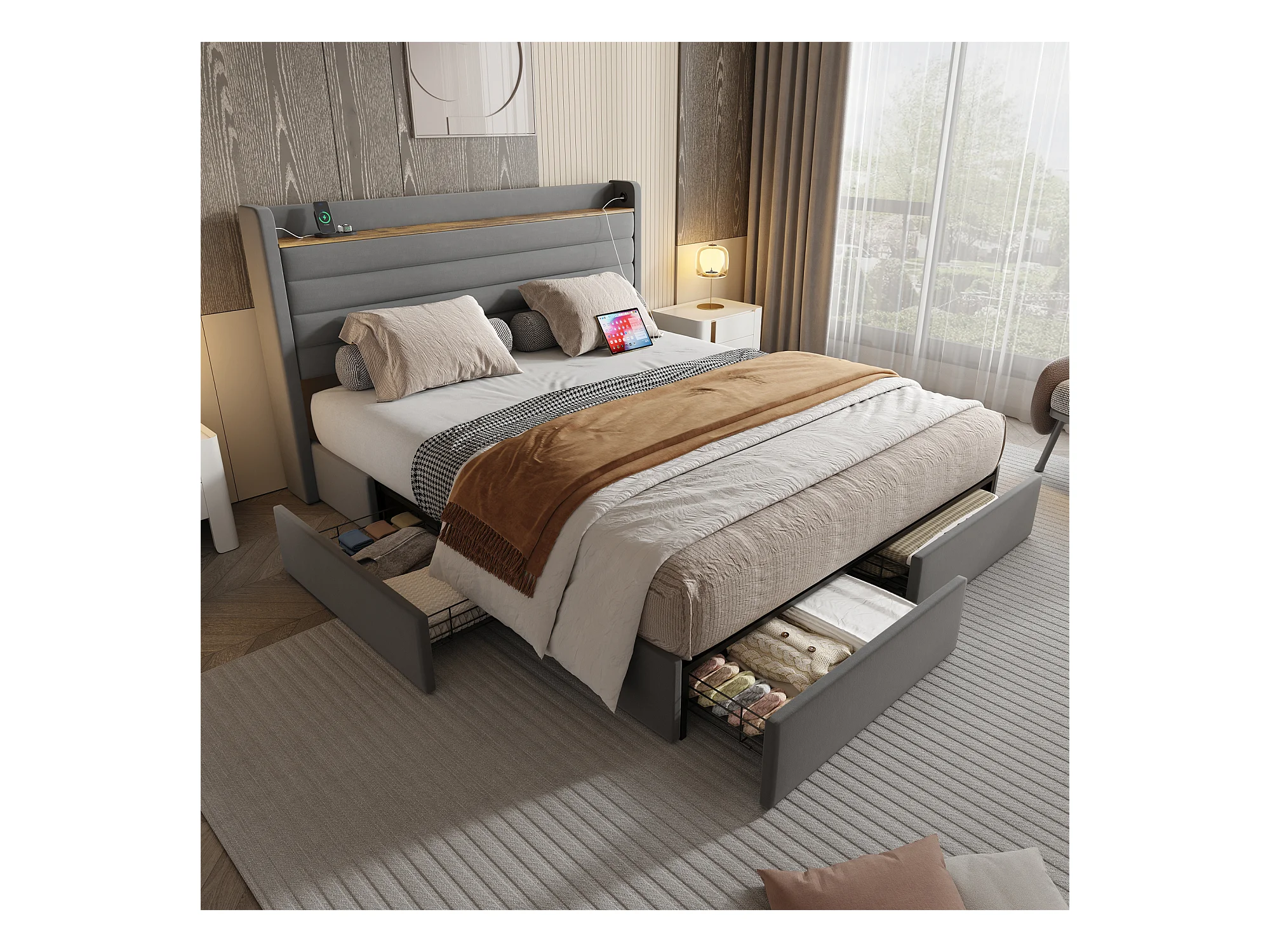 Lit coffre rembourré - 140 x 200 cm - tête de lit avec port USB et rangement + 4 tiroirs - velours - gris