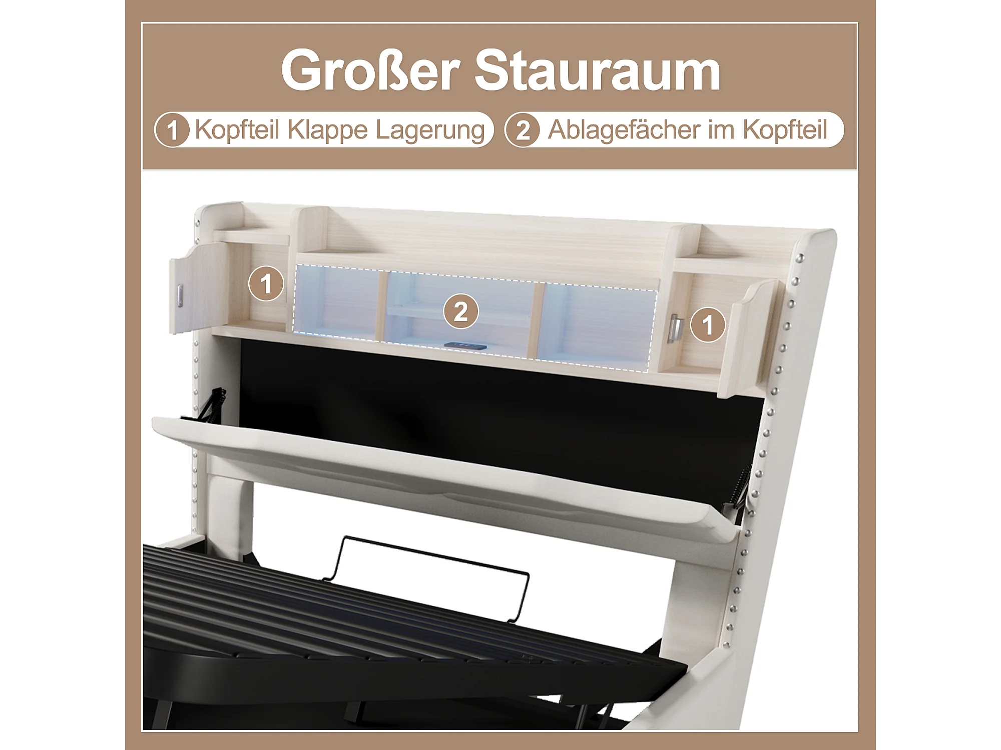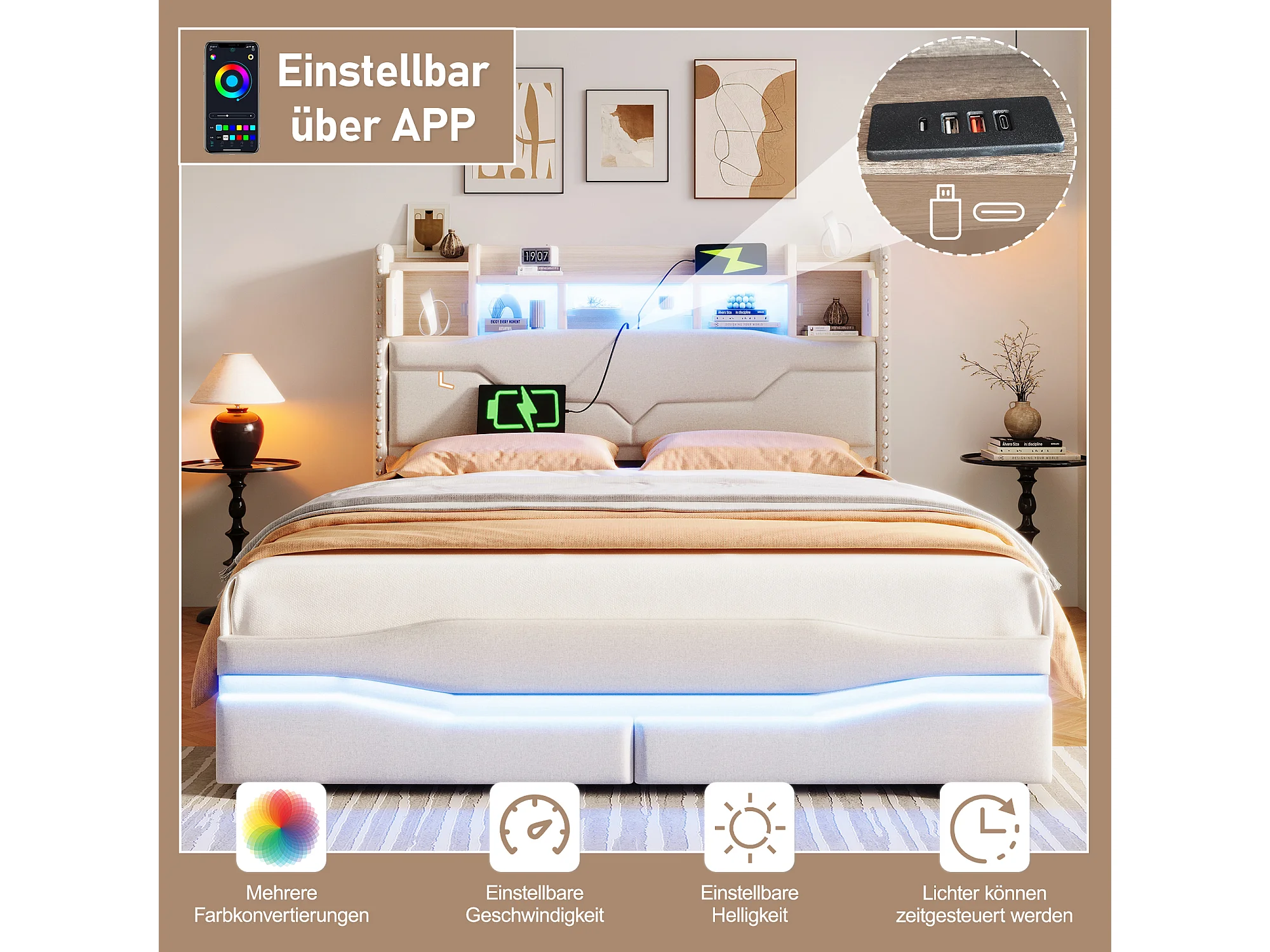Lit coffre rembourré - 140 x 200cm - avec USB-C + Leds - tête de lit avec rangements - lin + MDF - beige
