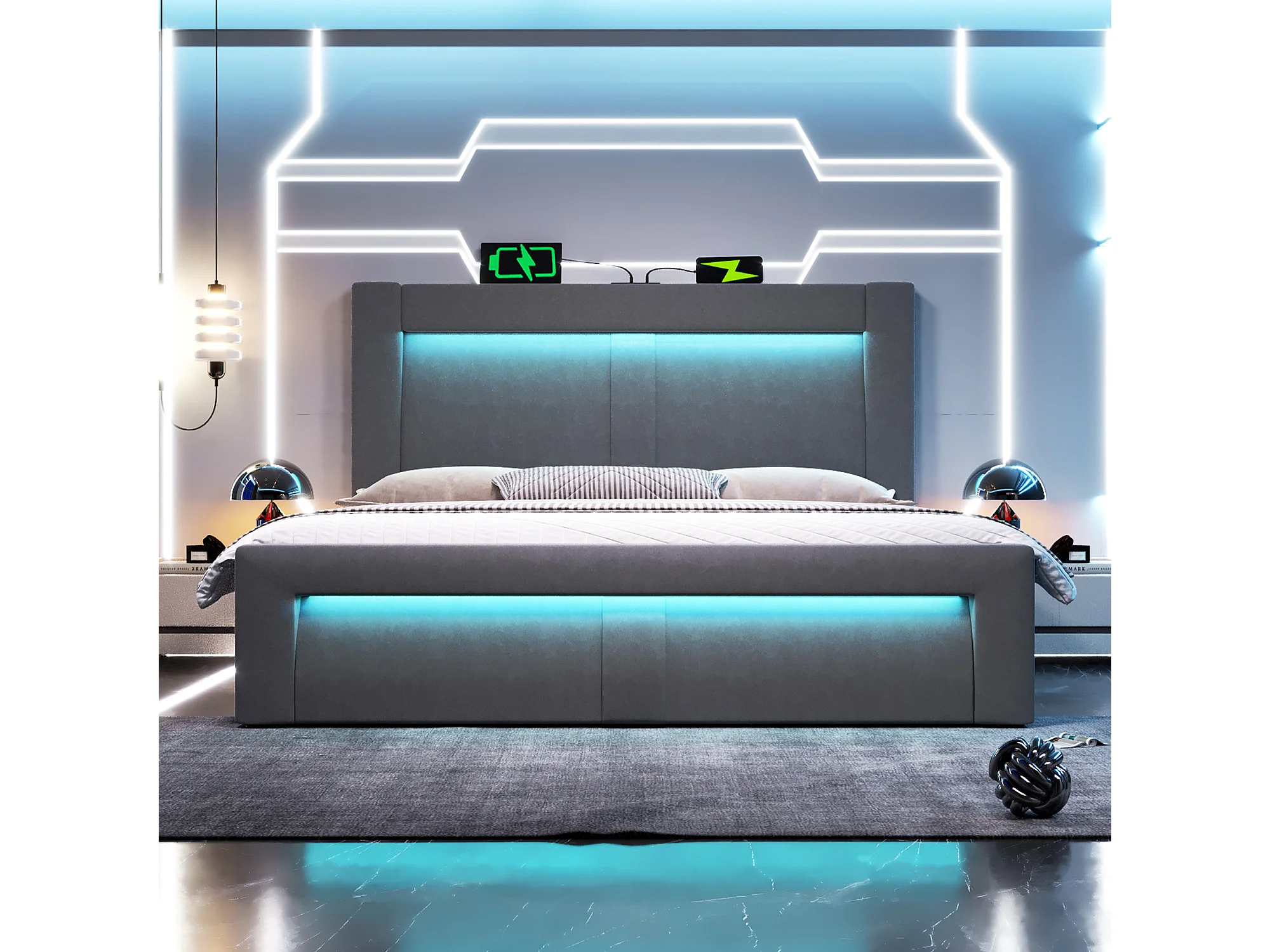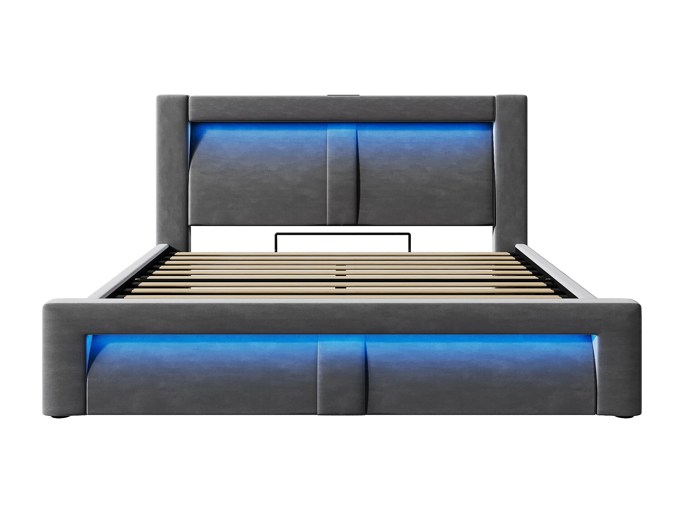 Lit coffre rembourré 140x200cm - avec éclairage LED - avec ports USB et Type-C - velours - Gris (sans matelas)