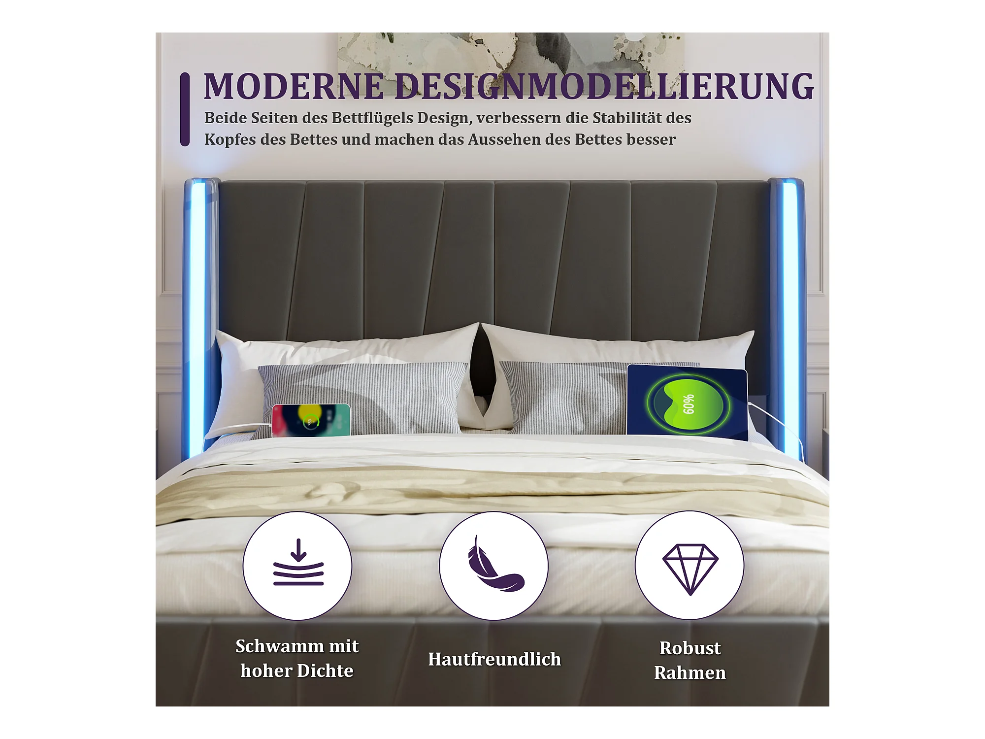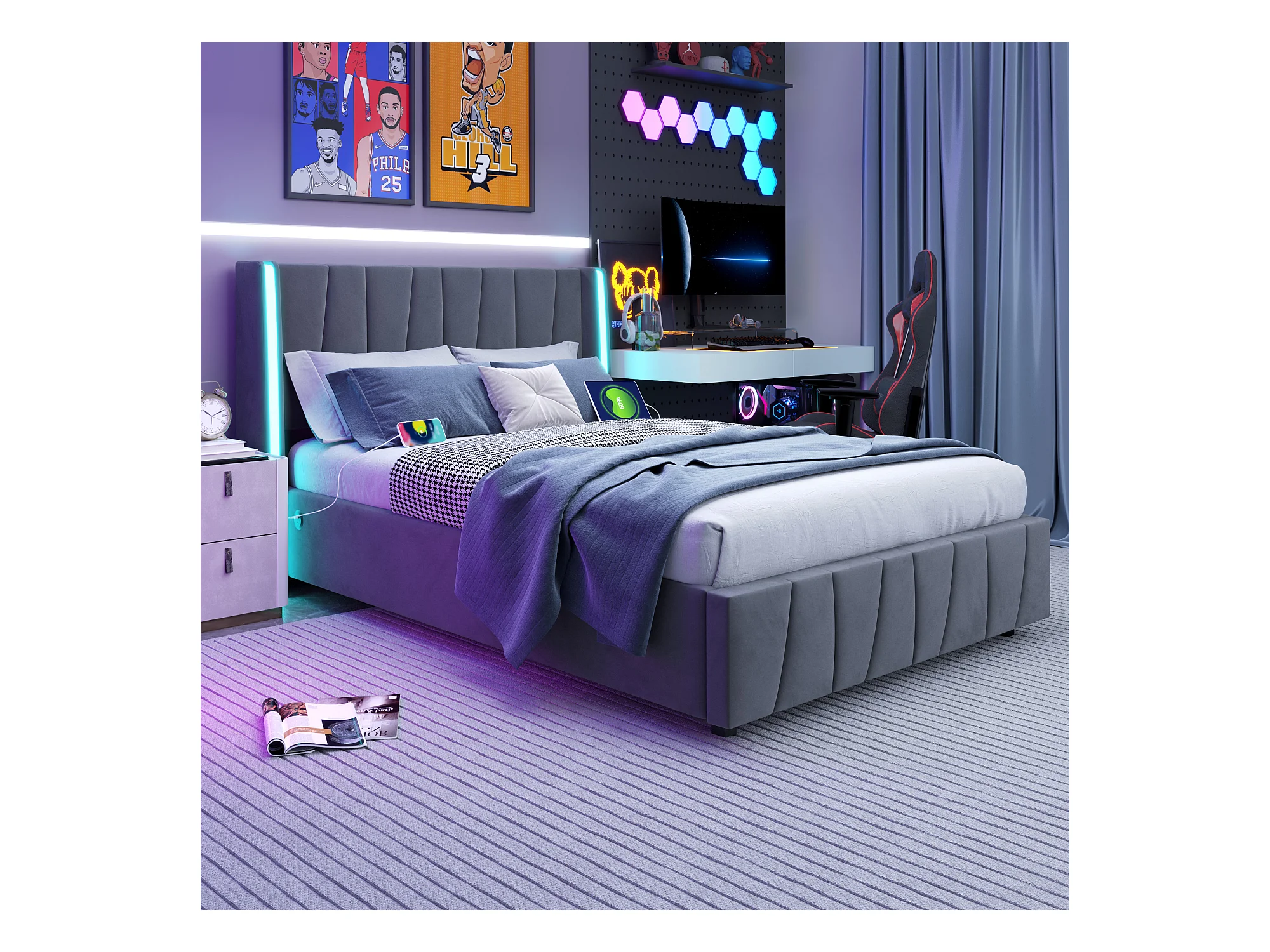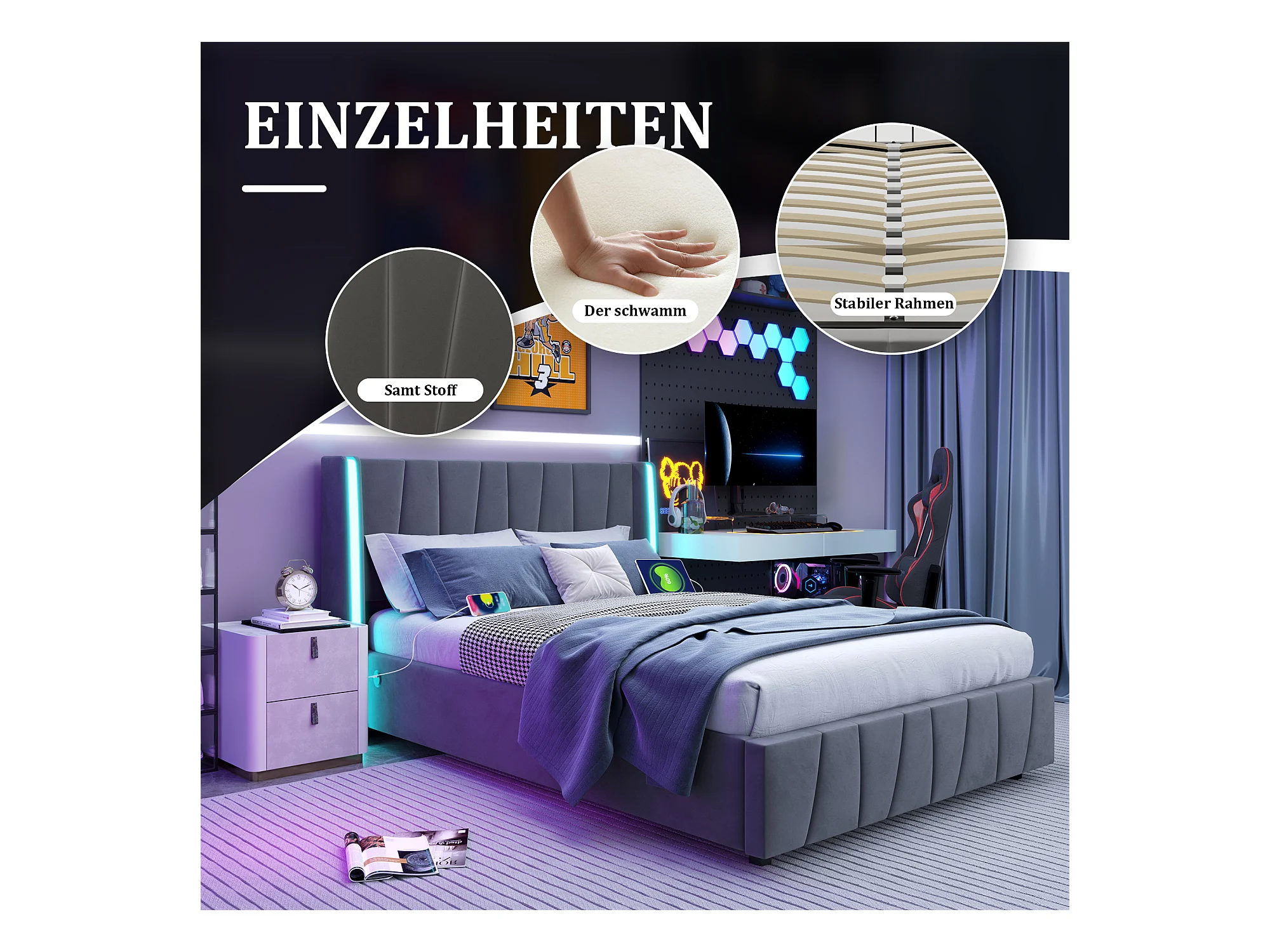 Lit coffre rembourré - 160 x 200 cm - avec ports USB + Leds - rangement hydraulique - velours - gris
