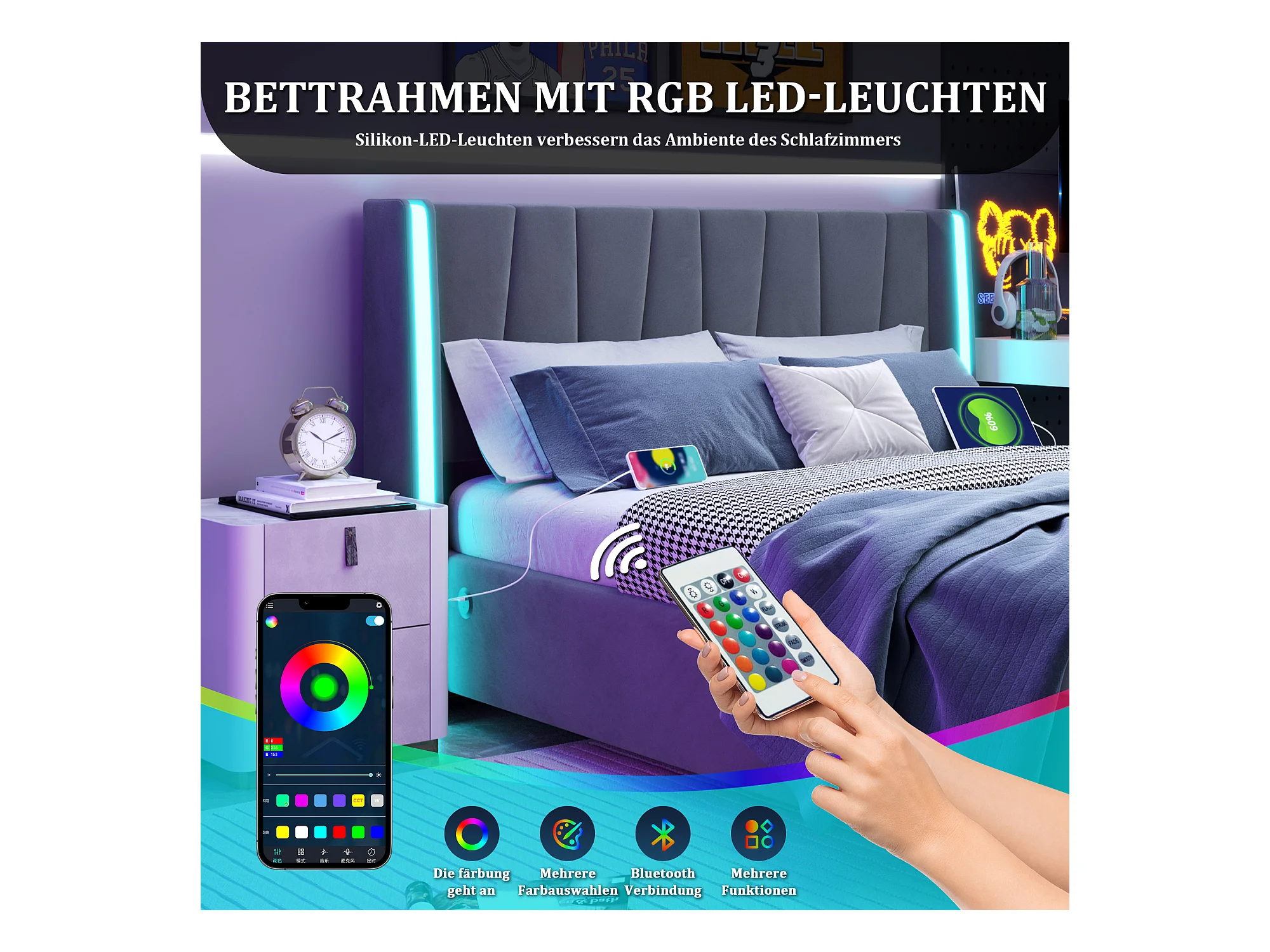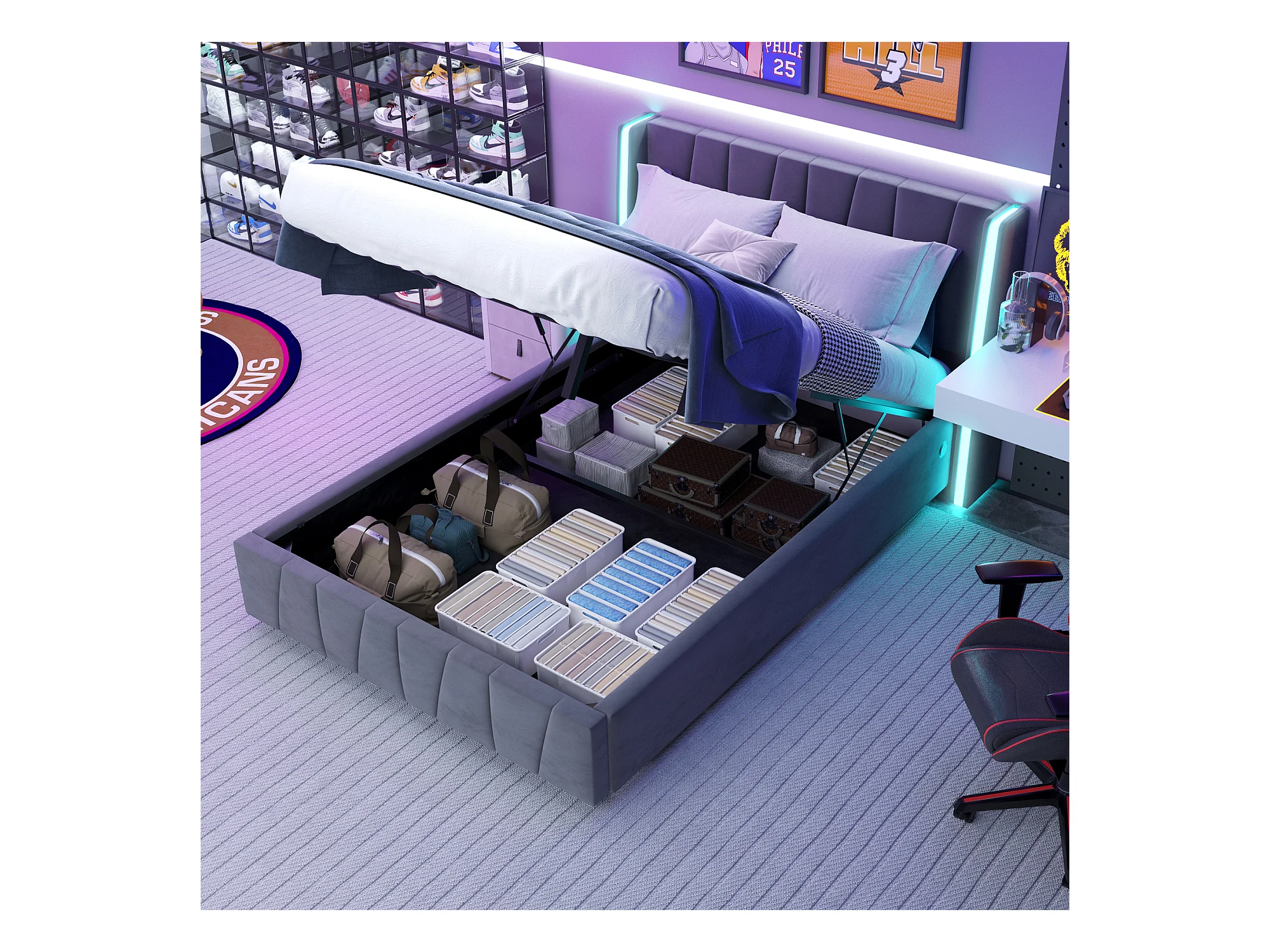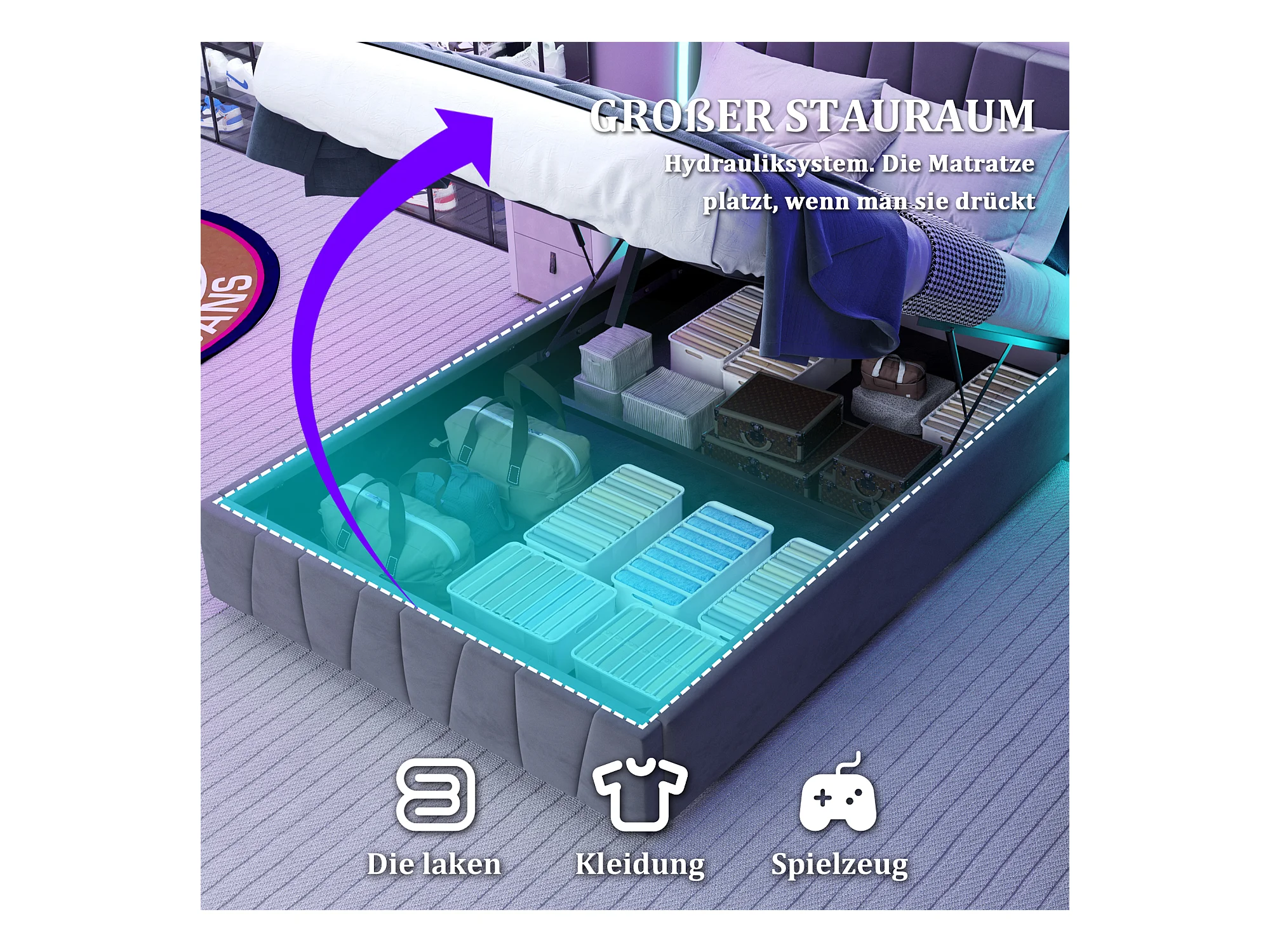 Lit coffre rembourré - 160 x 200 cm - avec ports USB + Leds - rangement hydraulique - velours - gris