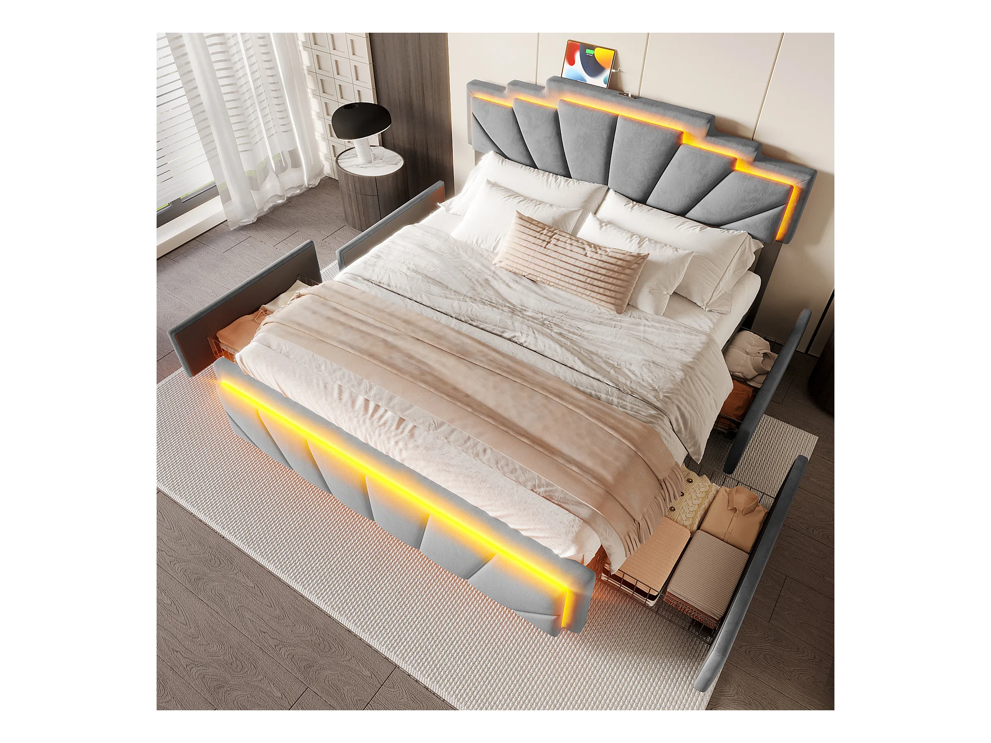 Lit coffre rembourré - 160 x 200 cm - avec tête de lit + Leds + USB Type-C + 4 tiroirs - velours - gris