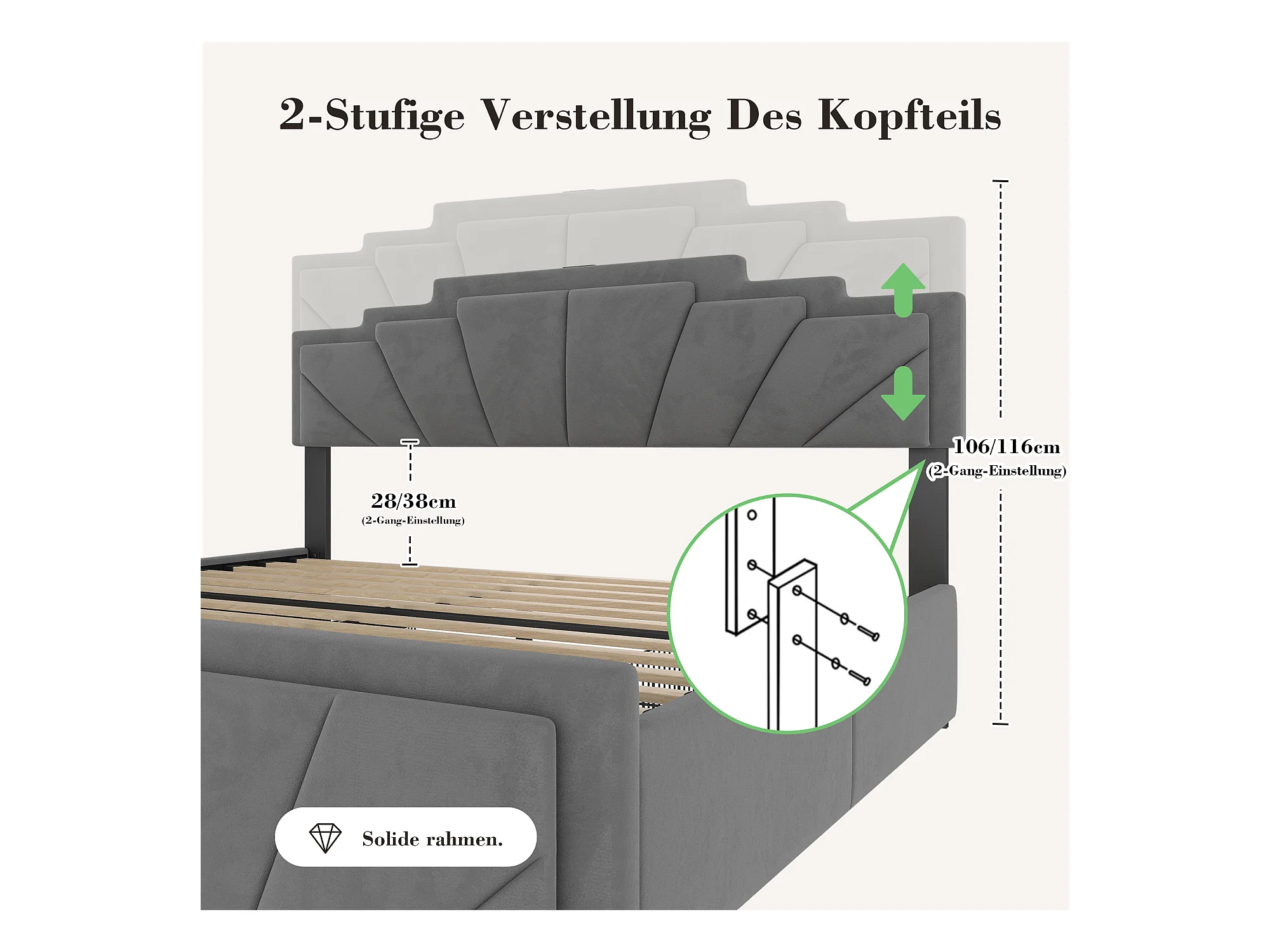 Lit coffre capitonné 160x200cm en velours - avec tiroir et sommier à lattes - Gris (sans matelas)