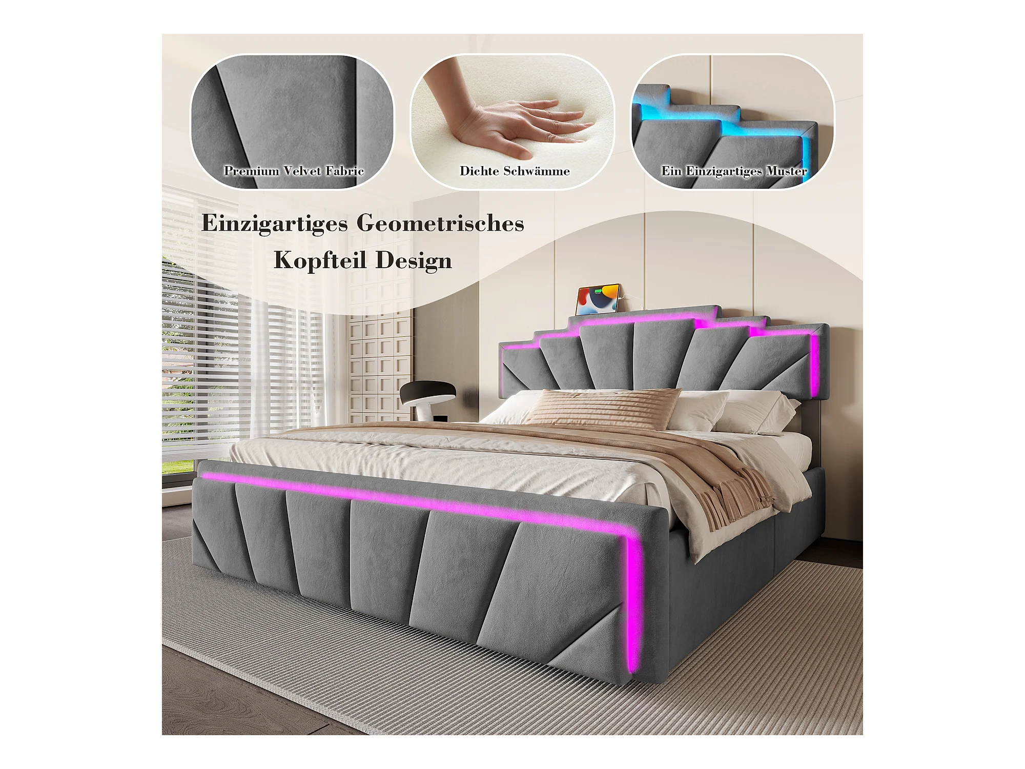 Lit coffre rembourré - 160 x 200 cm - avec Leds + USB Type-C + tête de lit avec rangement - velours - gris