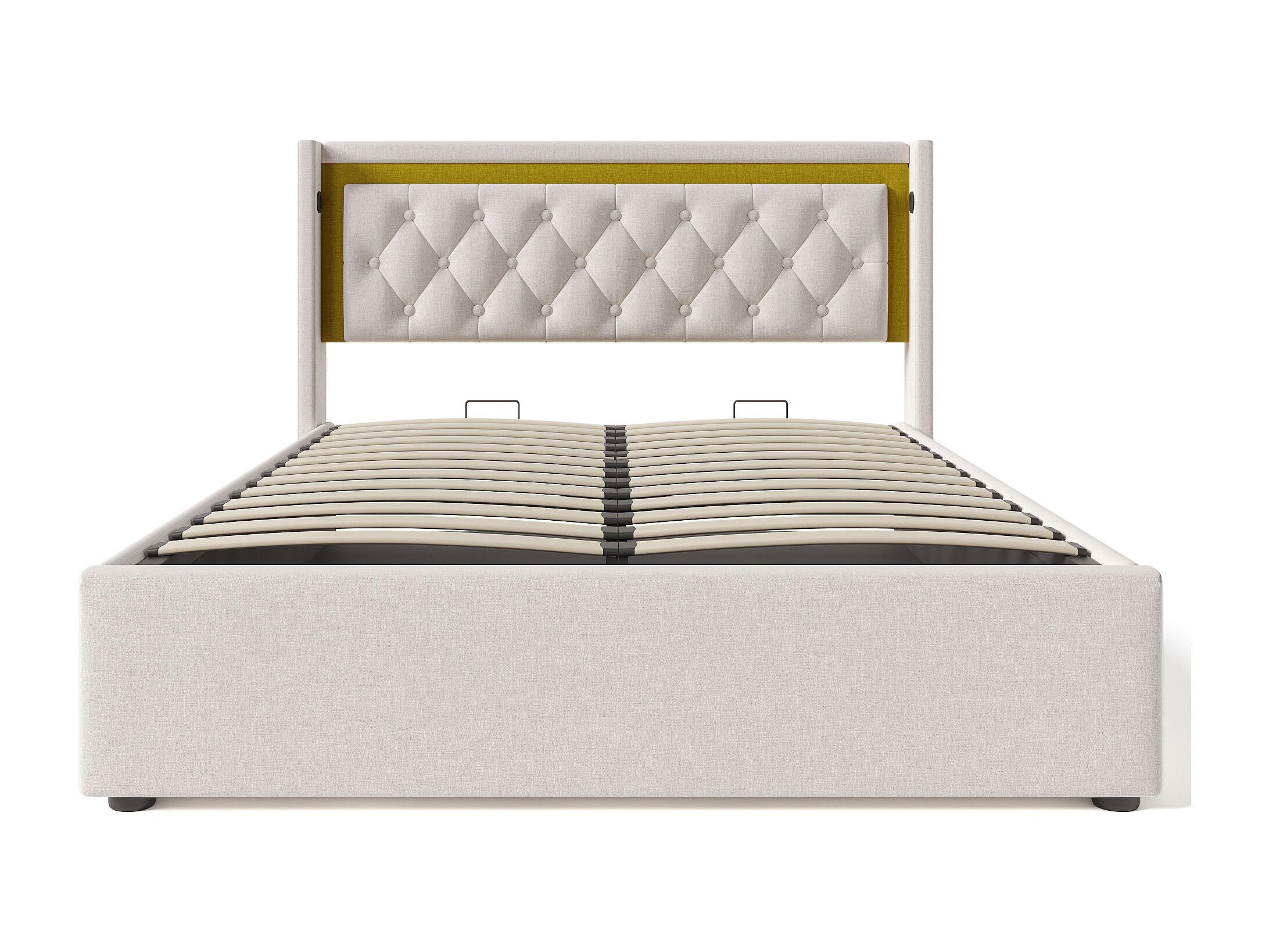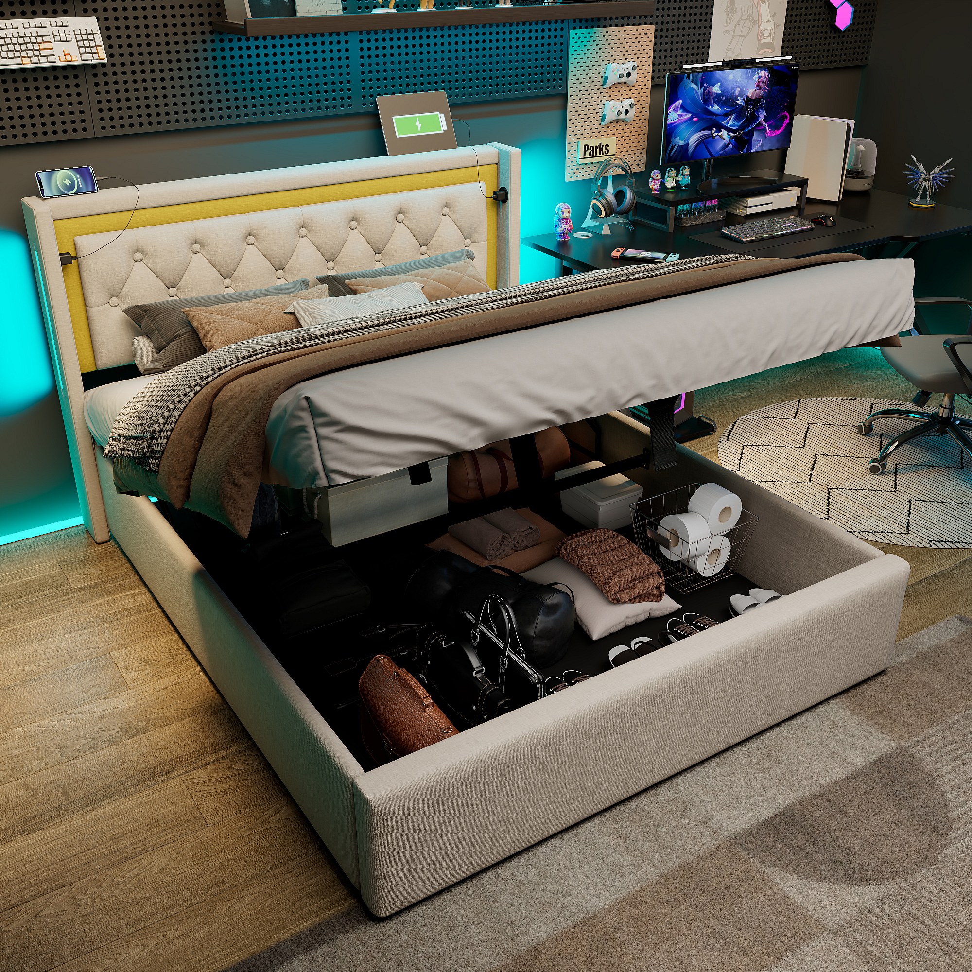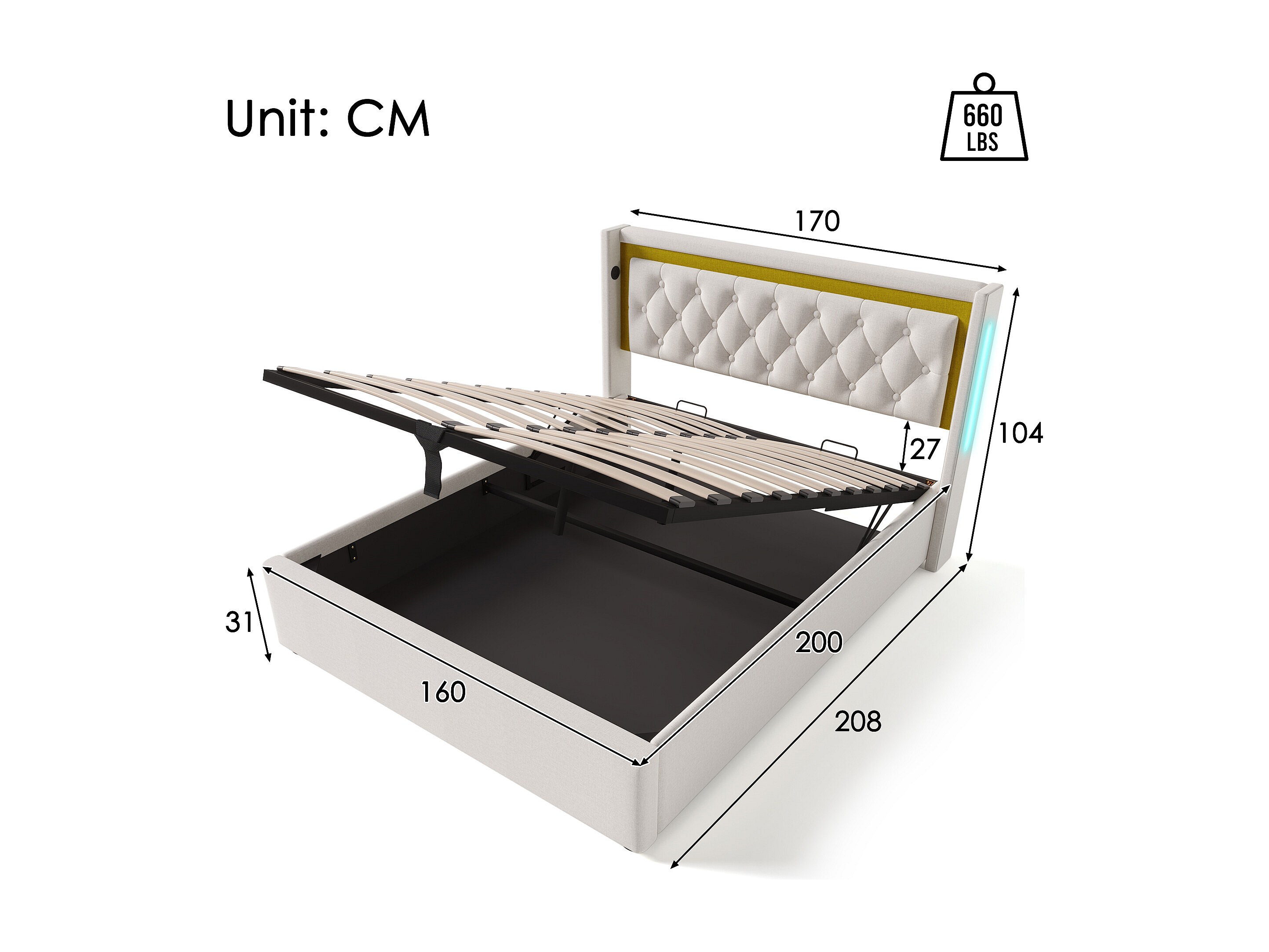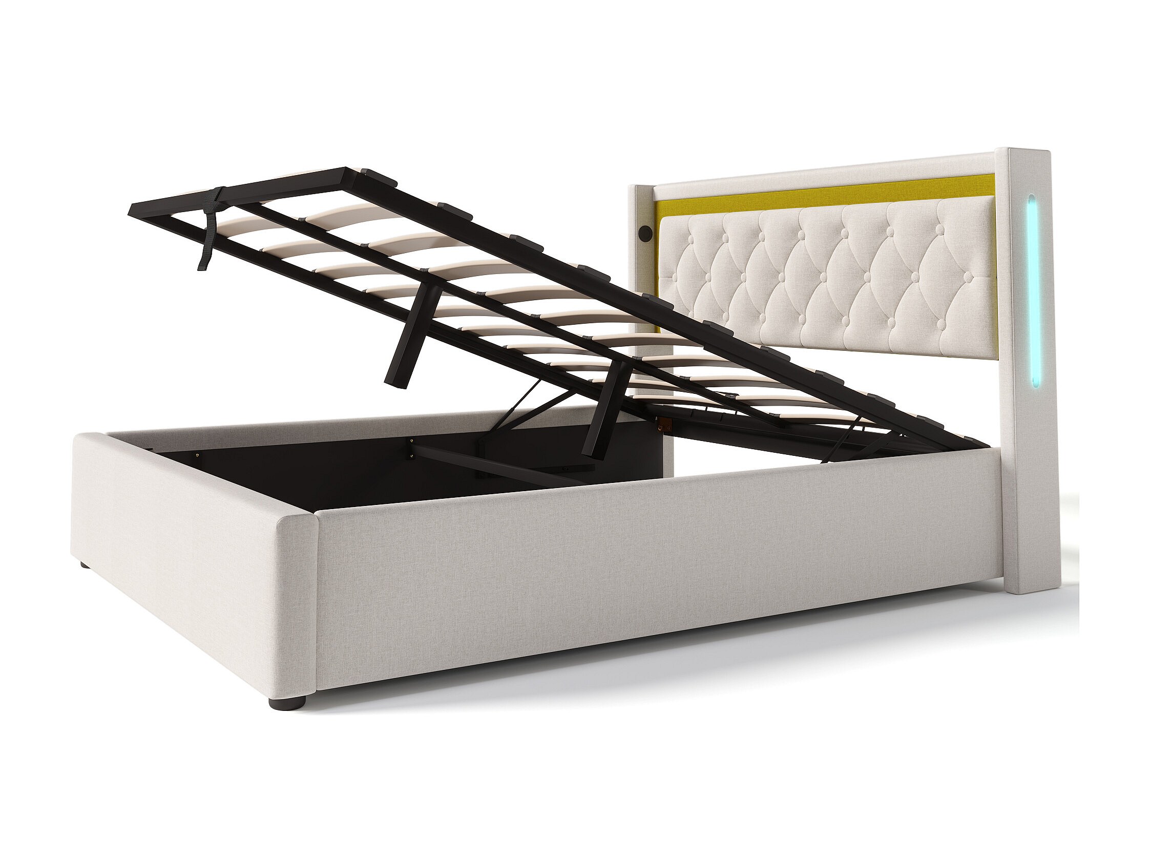 Lit coffre 160x200 cm Lit adulte avec éclairage LED et recharge USB - coton beige - sans matelas