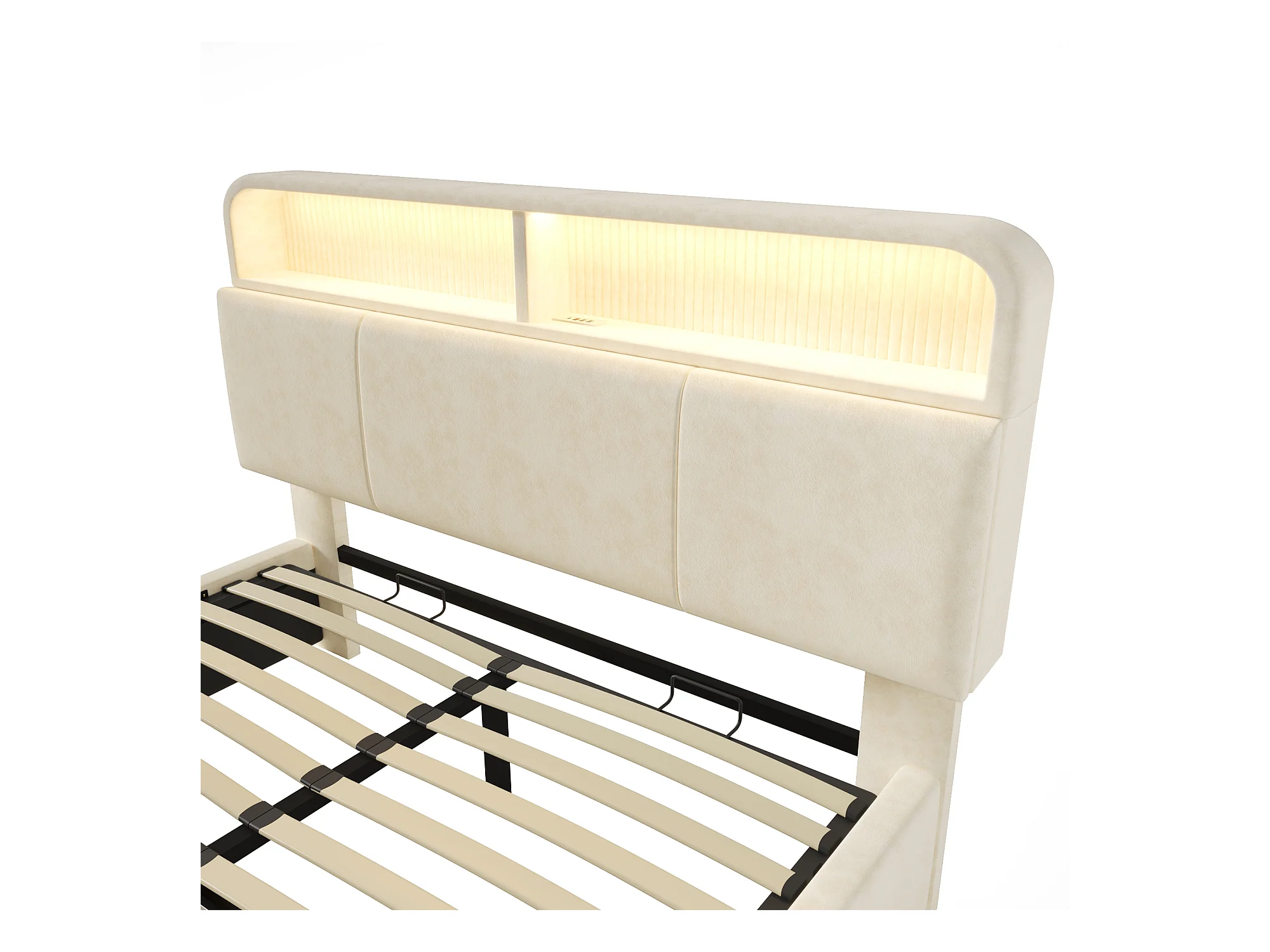 Lit coffre rembourré 160x200cm - avec éclairage LED - avec ports USB et Type-C - avec tête de lit réglable en hauteur - velours - Beige (sans matelas)