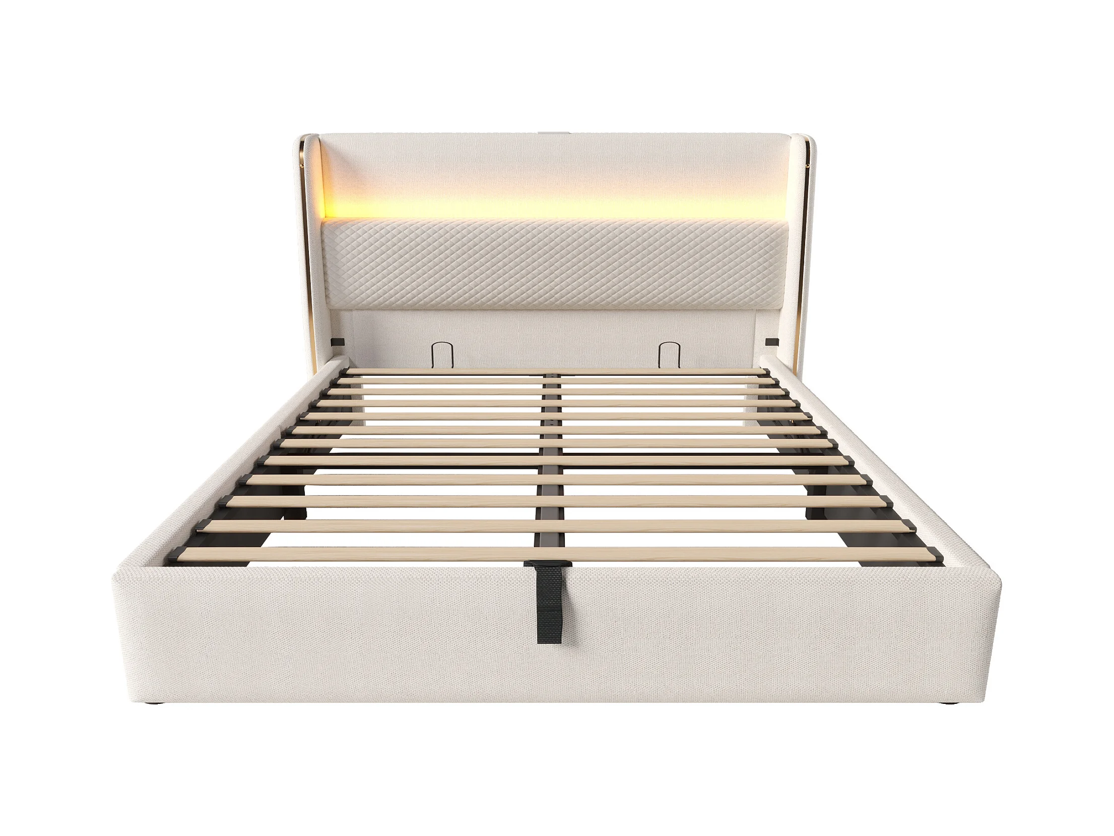 Lit coffre rembourré en lin 160×200cm - avec LED et chargements - avec sommier à lattes - Beige