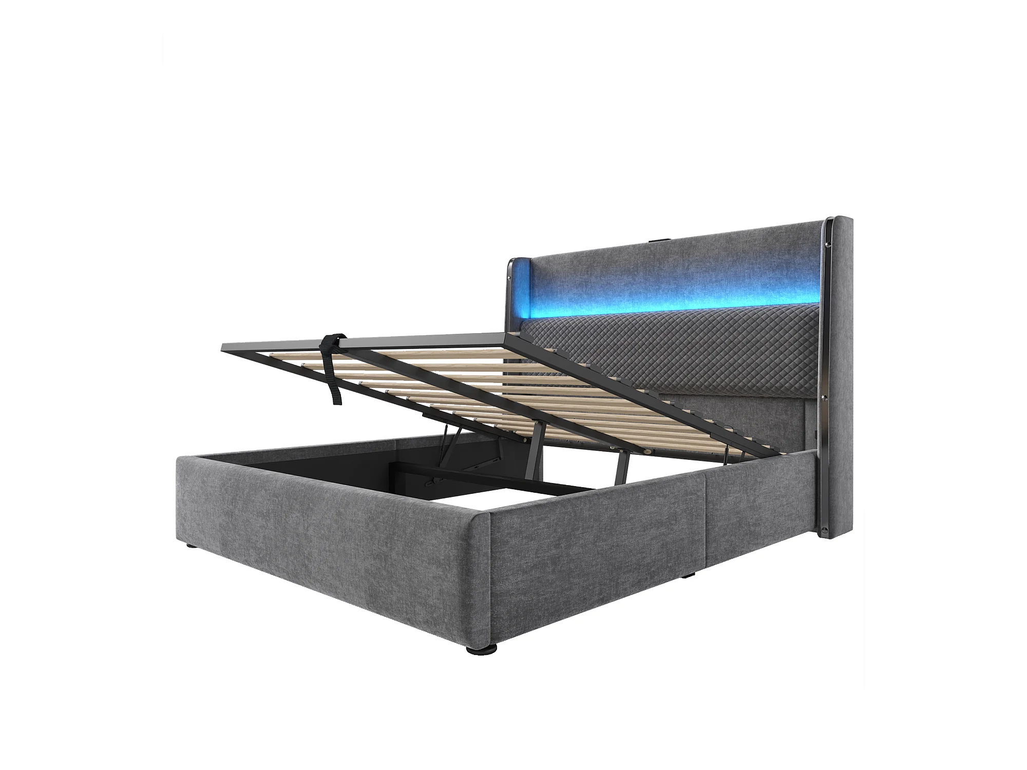 Lit coffre rembourré en lin avec ports de charge et LED - 160x200cm - 3 compartiments sur la tête réglablela - Gris