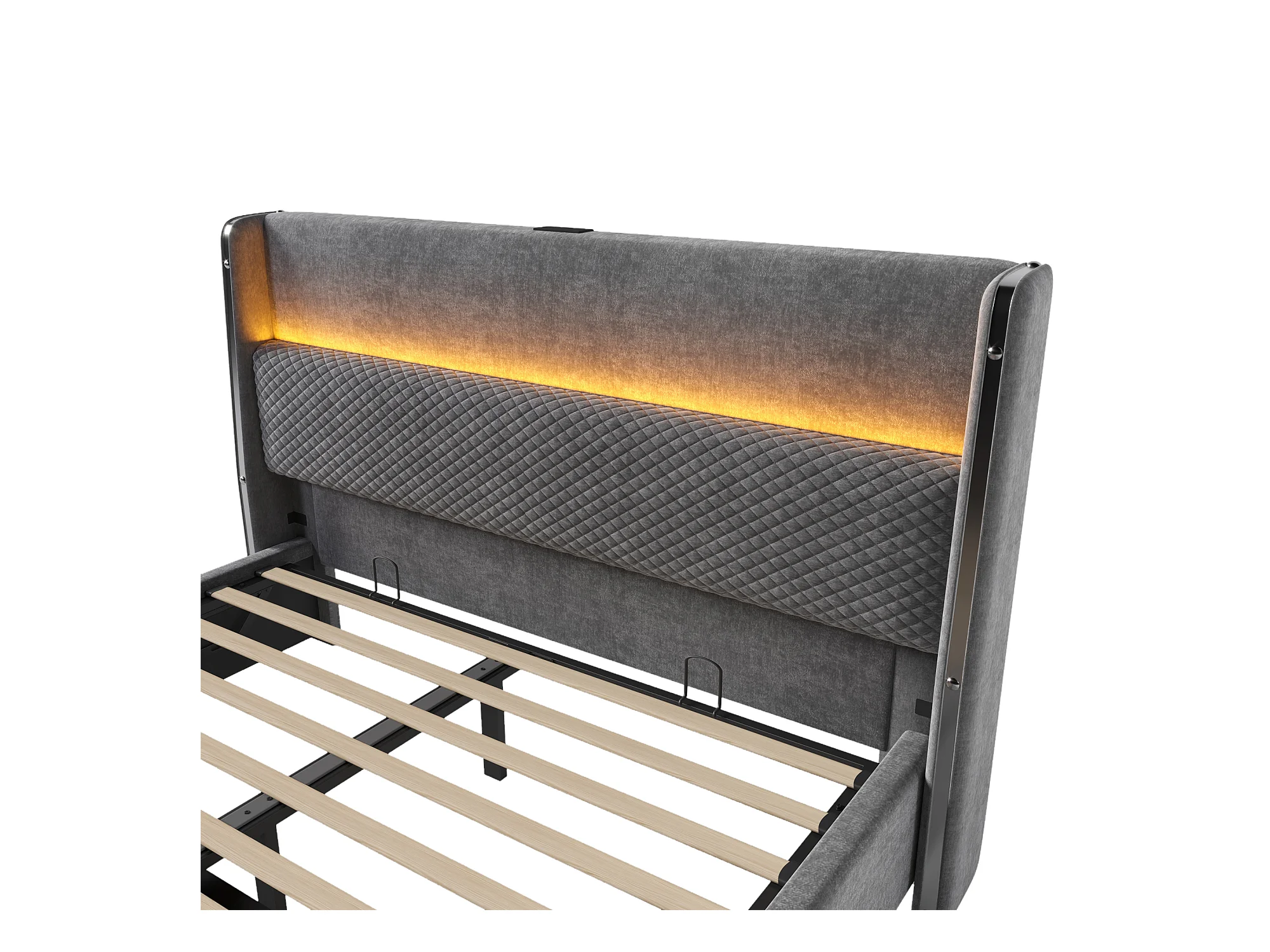 Lit coffre capitonné 160x200cm - avec LED et Ports de charge USB - tissu en Lin - avec sommier à lattes - Gris(sans matelas)