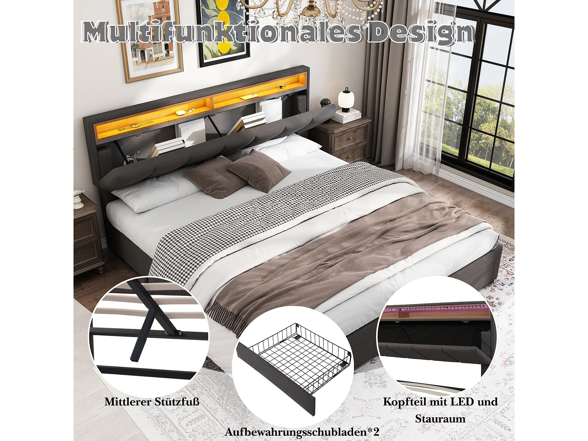 Lit coffre rembourré - 180 x 200 cm - avec Leds + tiroirs + tête de lit escamotable - lin - gris