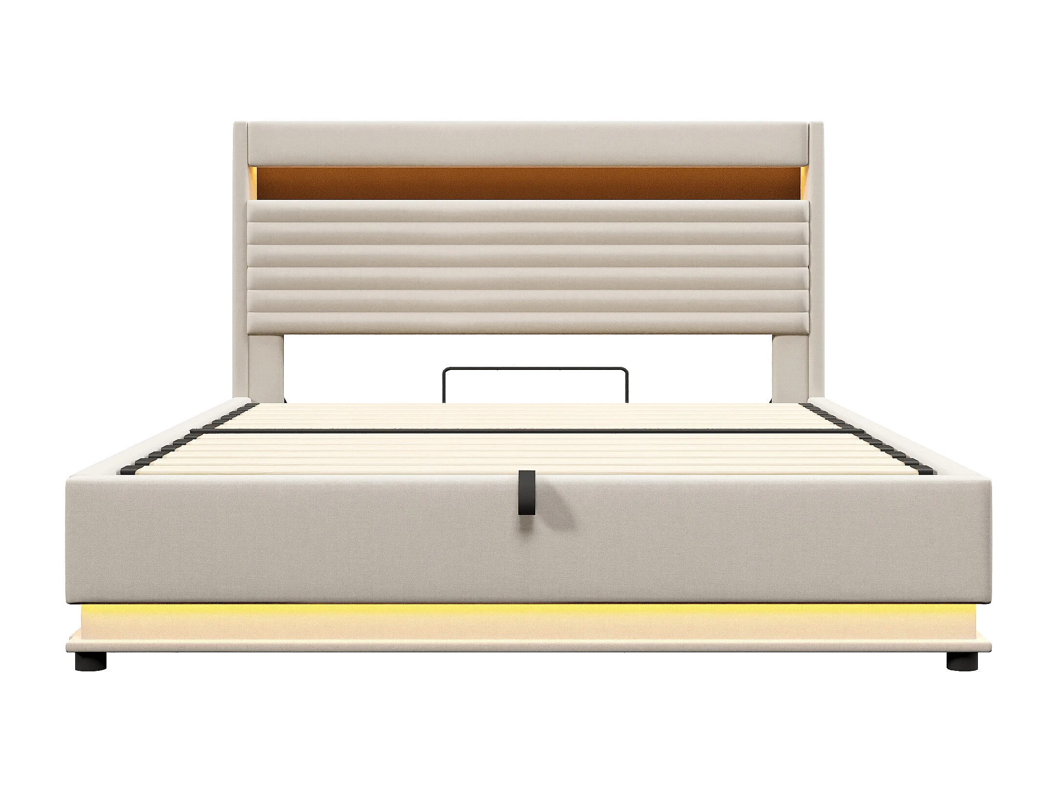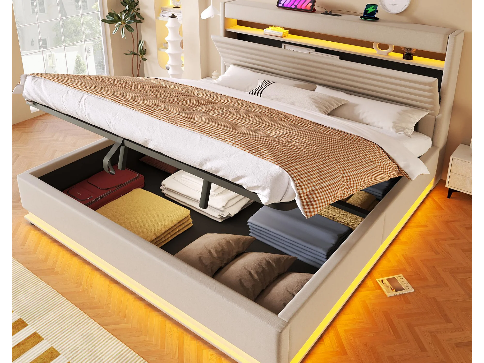 Lit coffre rembourré 180x200 cm - avec port USB Type-C - avec éclairage LED - avec compartiment de rangement - Beige (matelas non inclus)